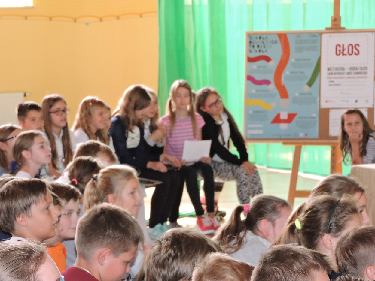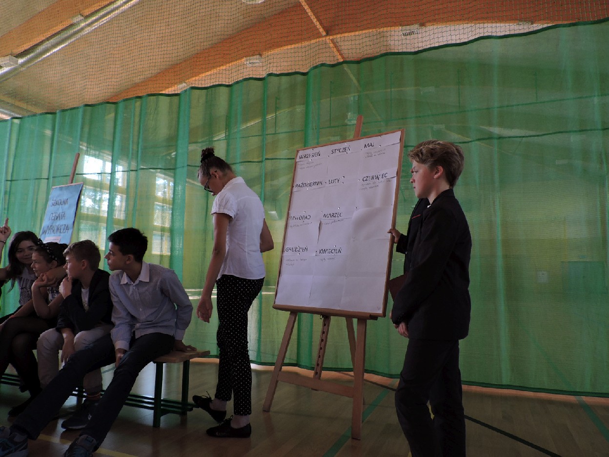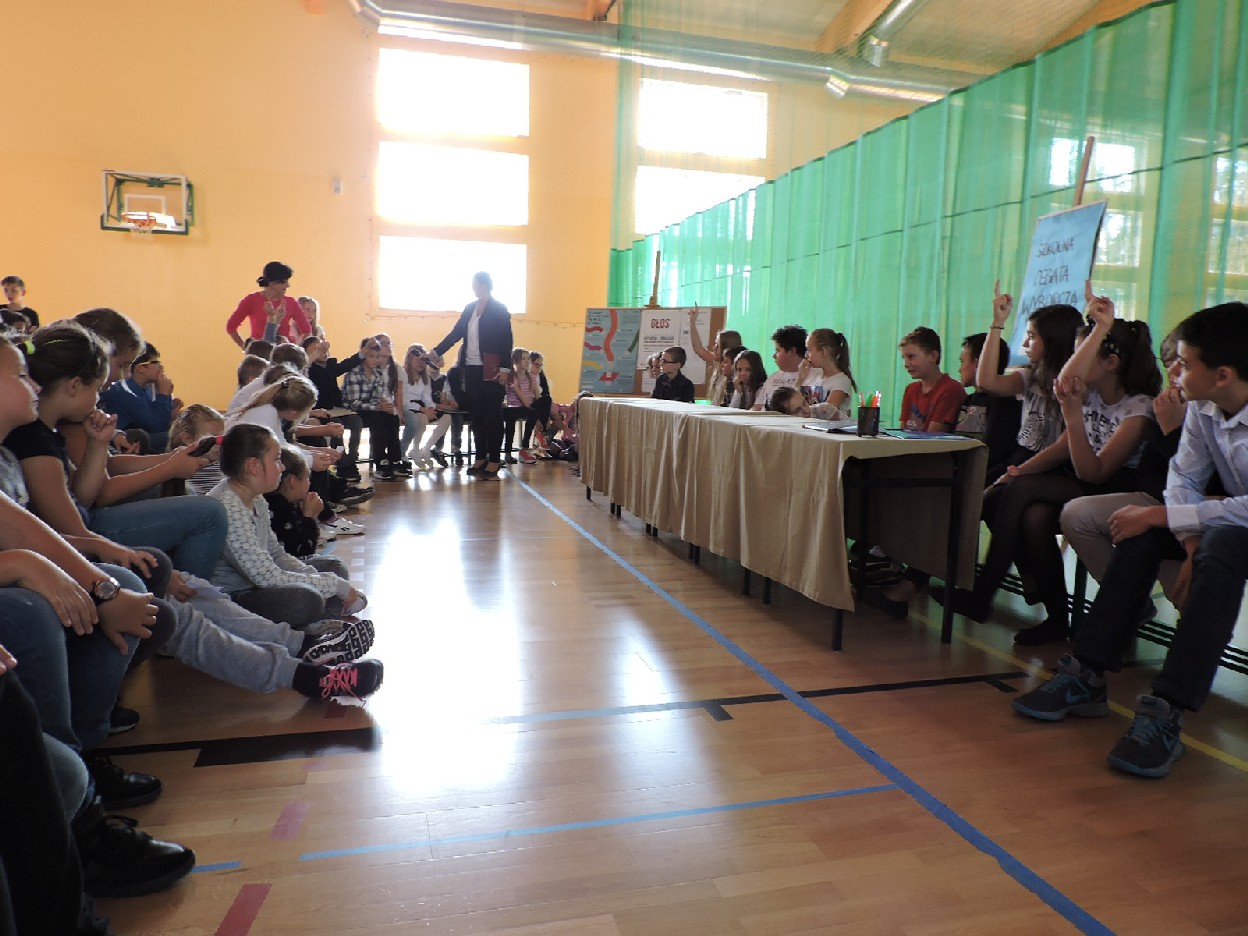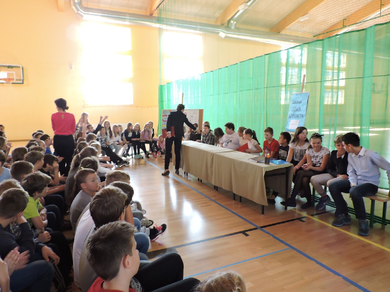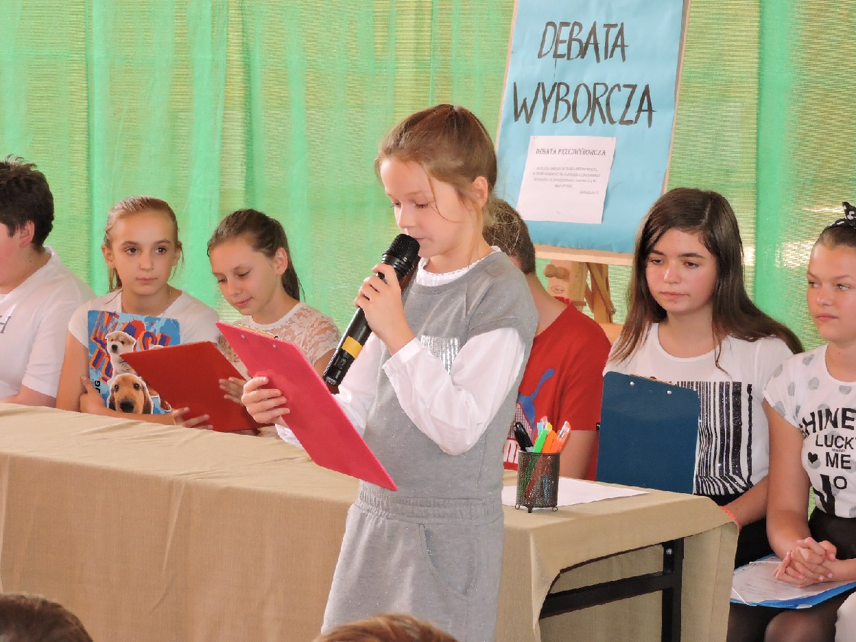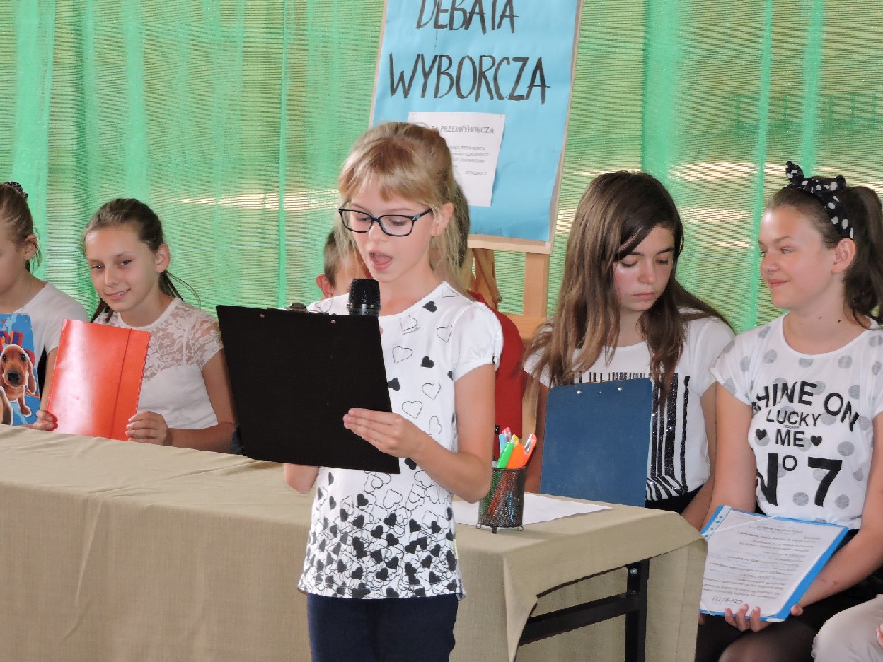 O godzinie 11:40 kandydaci, uczniowie, z niektórych klas oraz nauczyciele zebrali się w sali gimnastycznej. Na początku spotkania głos zabrali przedstawiciele klasy 6e, którzy w krótkim przemówieniu przedstawili nam zasady i przybliżyli przebieg dzisiejszej debaty. Później osoby ubiegające się o dostanie do Samorządu Uczniowskiego po kolei, według ściśle określonej kolejności przedstawiali swoje pomysły i plany na to, jakie zmiany chcieliby wprowadzić w naszej szkole, aby nauka w niej była dla nas samą przyjemnością, a czas spędzony w jej murach łączył się również z zabawą. Najczęściej podawanymi propozycjami były : więcej dyskotek, przerw muzycznych, lekcji na świeżym powietrzu, wycieczek oraz ponownego otwarcia sklepiku szkolnego. Wszystkie pomysły były bardzo ciekawe i warte naszej uwagi. Następnie kandydaci zapisywali w kalendarzu, pod miesiącem propozycje zmian, które mieli za zadanie wymyśleć podczas debaty, przypisując im w ten sposób datę, z którą chcieliby je zrealizować. Wiele pomysłów było bardzo zaskakujących, a zrazem interesujących. Na koniec uczniowie przysłuchujący się prezentacjom kandydatów mogli osobiście skierować do nich swoje pytania. Najczęściej pytano o to, w jaki sposób zostaną wprowadzone w życie proponowane koncepcje. Po skończonej debacie wróciliśmy do swoich klas na lekcje.
