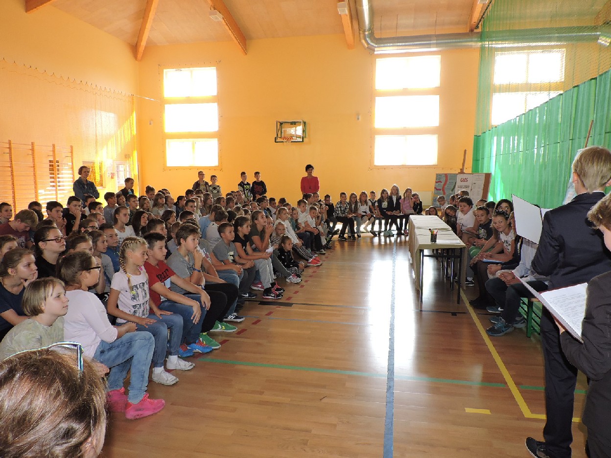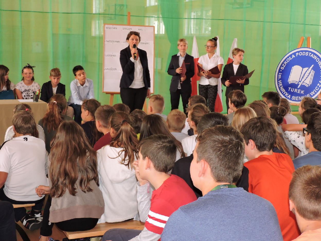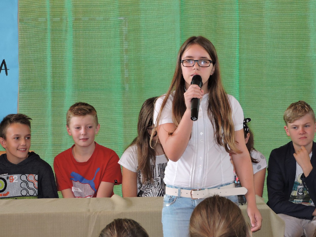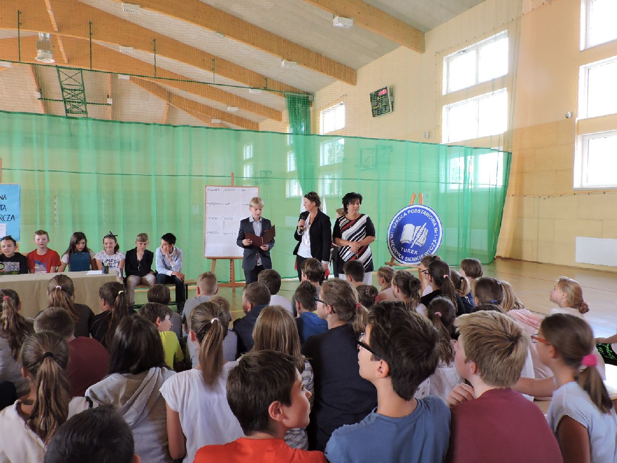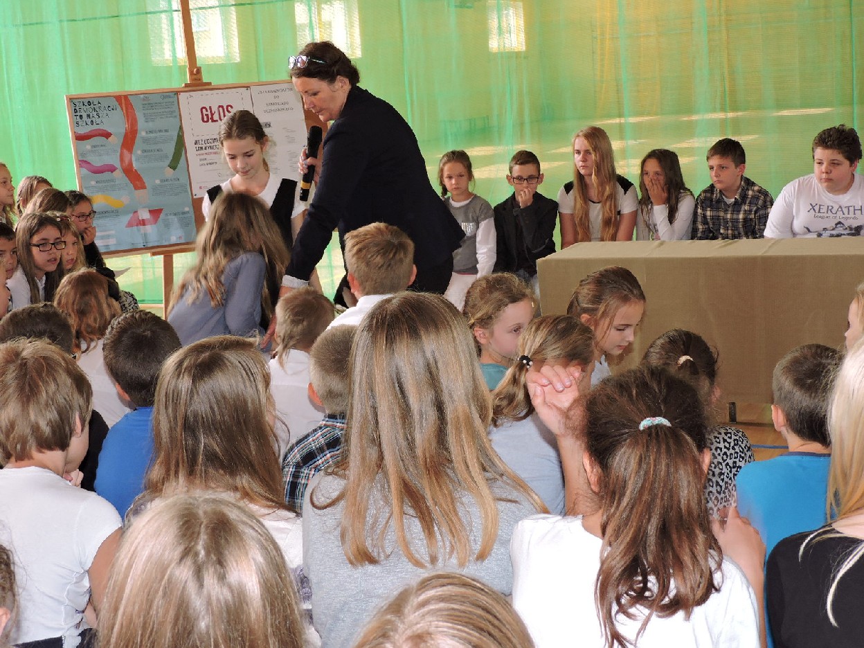O godzinie 11:40 kandydaci, uczniowie, z niektórych klas oraz nauczyciele zebrali się w sali gimnastycznej. Na początku spotkania głos zabrali przedstawiciele klasy 6e, którzy w krótkim przemówieniu przedstawili nam zasady i przybliżyli przebieg dzisiejszej debaty. Później osoby ubiegające się o dostanie do Samorządu Uczniowskiego po kolei, według ściśle określonej kolejności przedstawiali swoje pomysły i plany na to, jakie zmiany chcieliby wprowadzić w naszej szkole, aby nauka w niej była dla nas samą przyjemnością, a czas spędzony w jej murach łączył się również z zabawą. Najczęściej podawanymi propozycjami były : więcej dyskotek, przerw muzycznych, lekcji na świeżym powietrzu, wycieczek oraz ponownego otwarcia sklepiku szkolnego. Wszystkie pomysły były bardzo ciekawe i warte naszej uwagi. Następnie kandydaci zapisywali w kalendarzu, pod miesiącem propozycje zmian, które mieli za zadanie wymyśleć podczas debaty, przypisując im w ten sposób datę, z którą chcieliby je zrealizować. Wiele pomysłów było bardzo zaskakujących, a zrazem interesujących. Na koniec uczniowie przysłuchujący się prezentacjom kandydatów mogli osobiście skierować do nich swoje pytania. Najczęściej pytano o to, w jaki sposób zostaną wprowadzone w życie proponowane koncepcje. Po skończonej debacie wróciliśmy do swoich klas na lekcje.