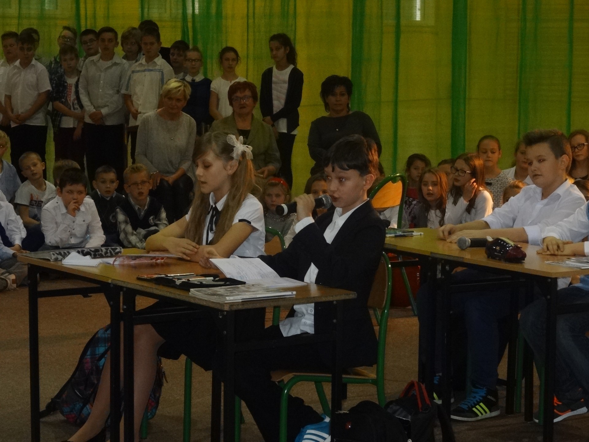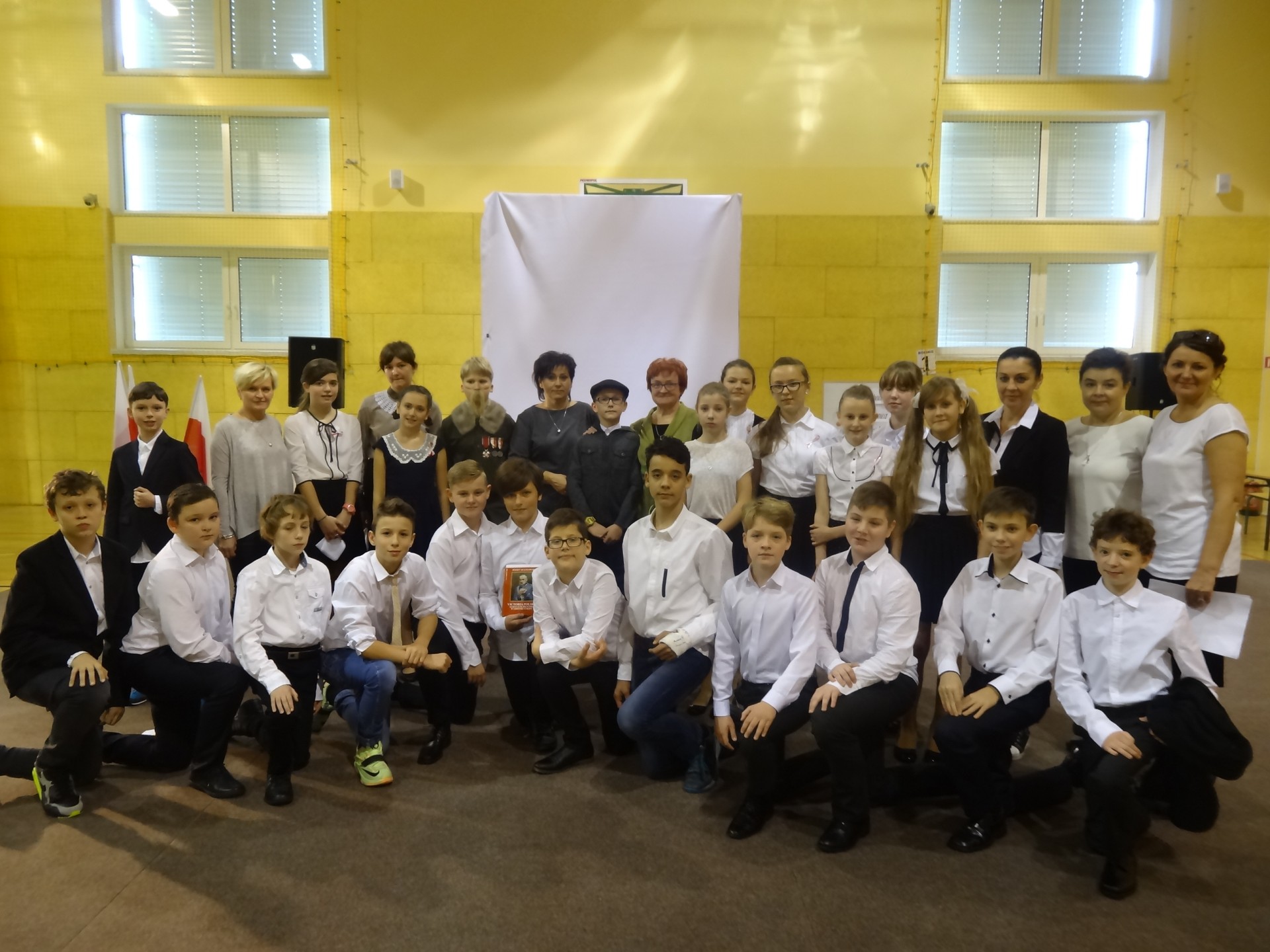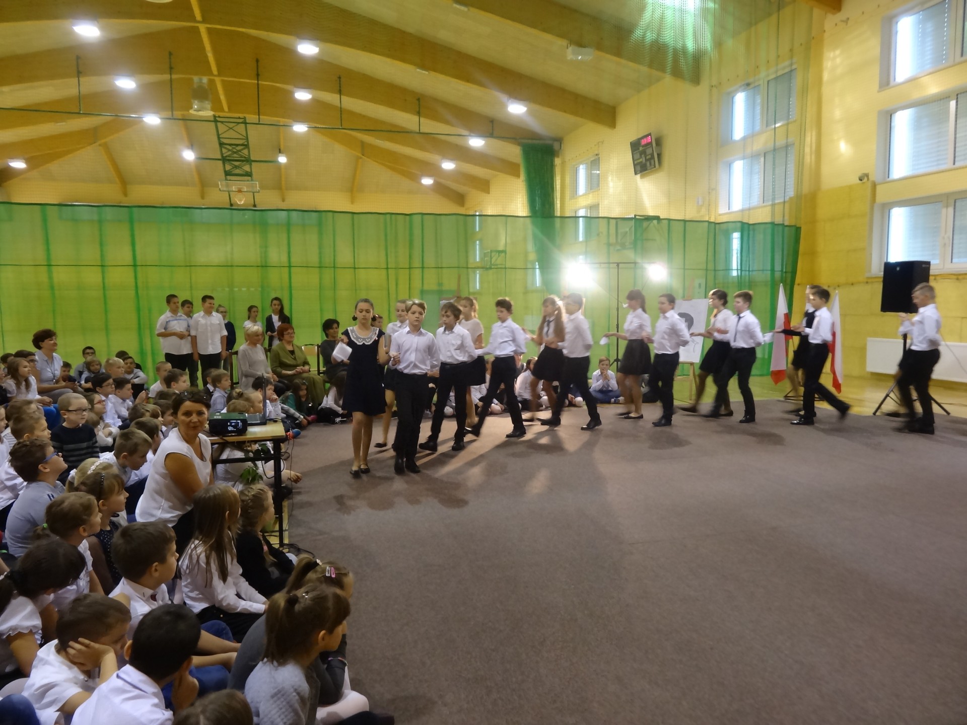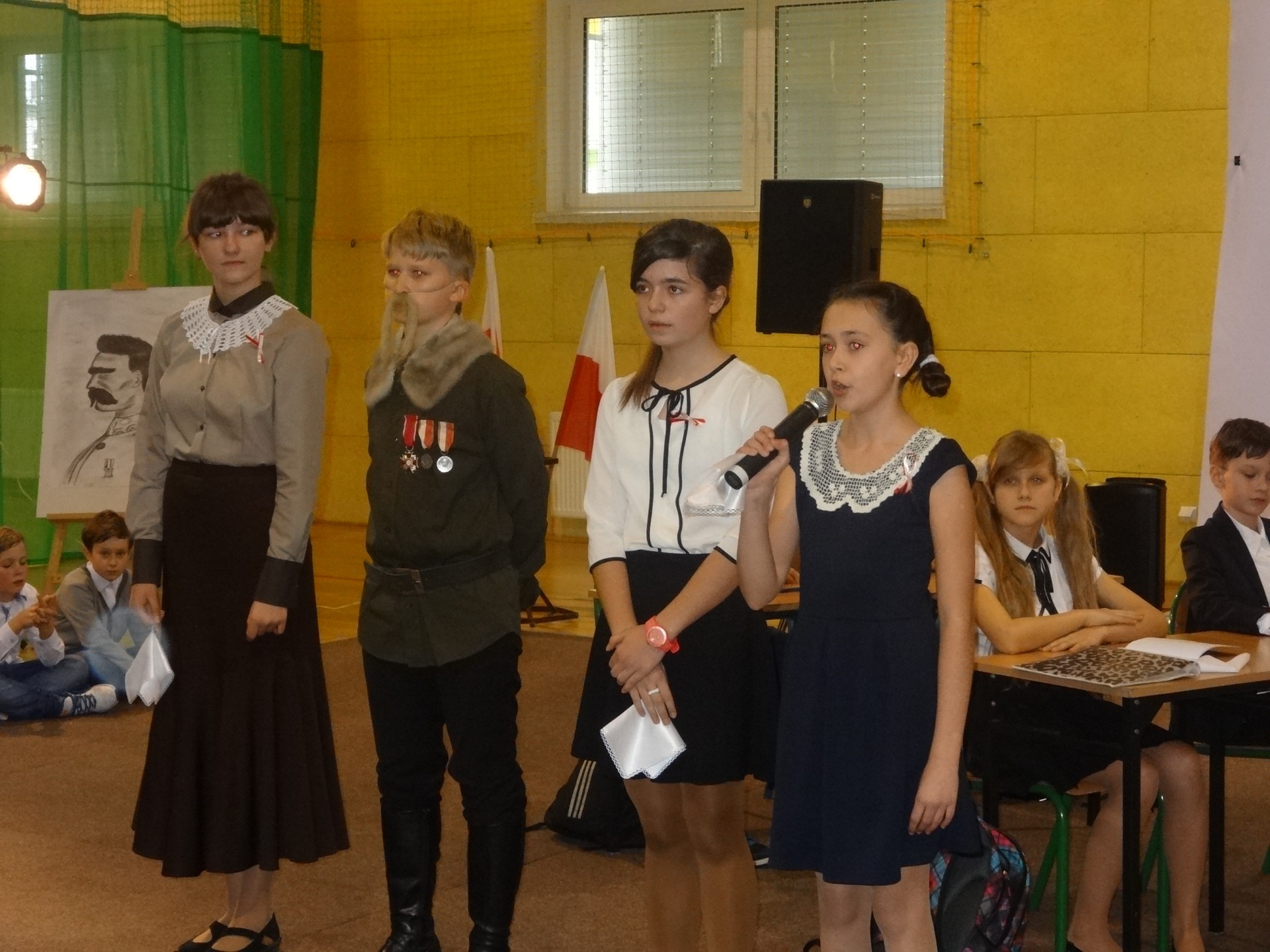 Na początku przewodnicząca Samorządu Uczniowskiego – Kinga Fijałkowska powitała wszystkich zebranych. Następnie zaprosiła na krótką lekcję historii, podczas której mieliśmy okazję przypomnieć ważne dla naszego kraju wydarzenia historyczne począwszy od pierwszego rozbioru Polski aż po odzyskanie niepodległości. Momentem kulminacyjnym uroczystości było pojawienie się na scenie Józef Piłsudskiego wraz z żoną i córkami. Majestatyczne ubrania przeniosły nas w początki XX wiek. Zwieńczeniem całej uroczystości był taniec polonez przygotowany przez uczniów klasy VIe. Wyszło im to wspaniale, a wszyscy zebrani byli pod dużym wrażeniem ich wdzięku. Po występie, goście zabrali głos.