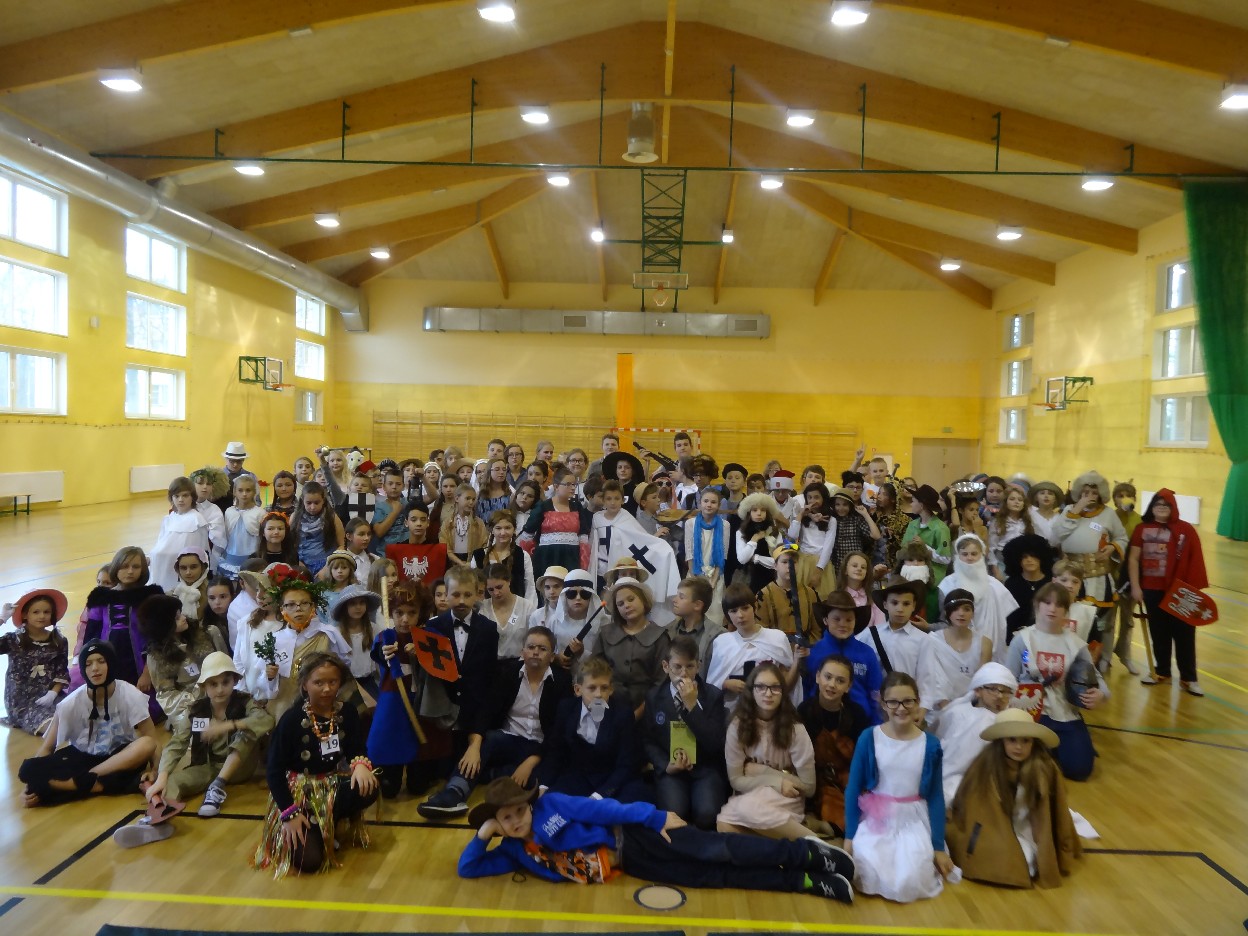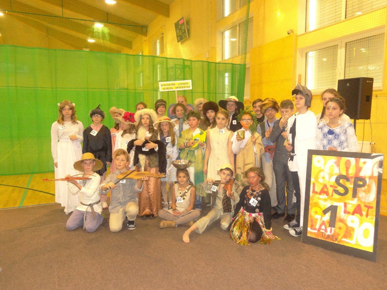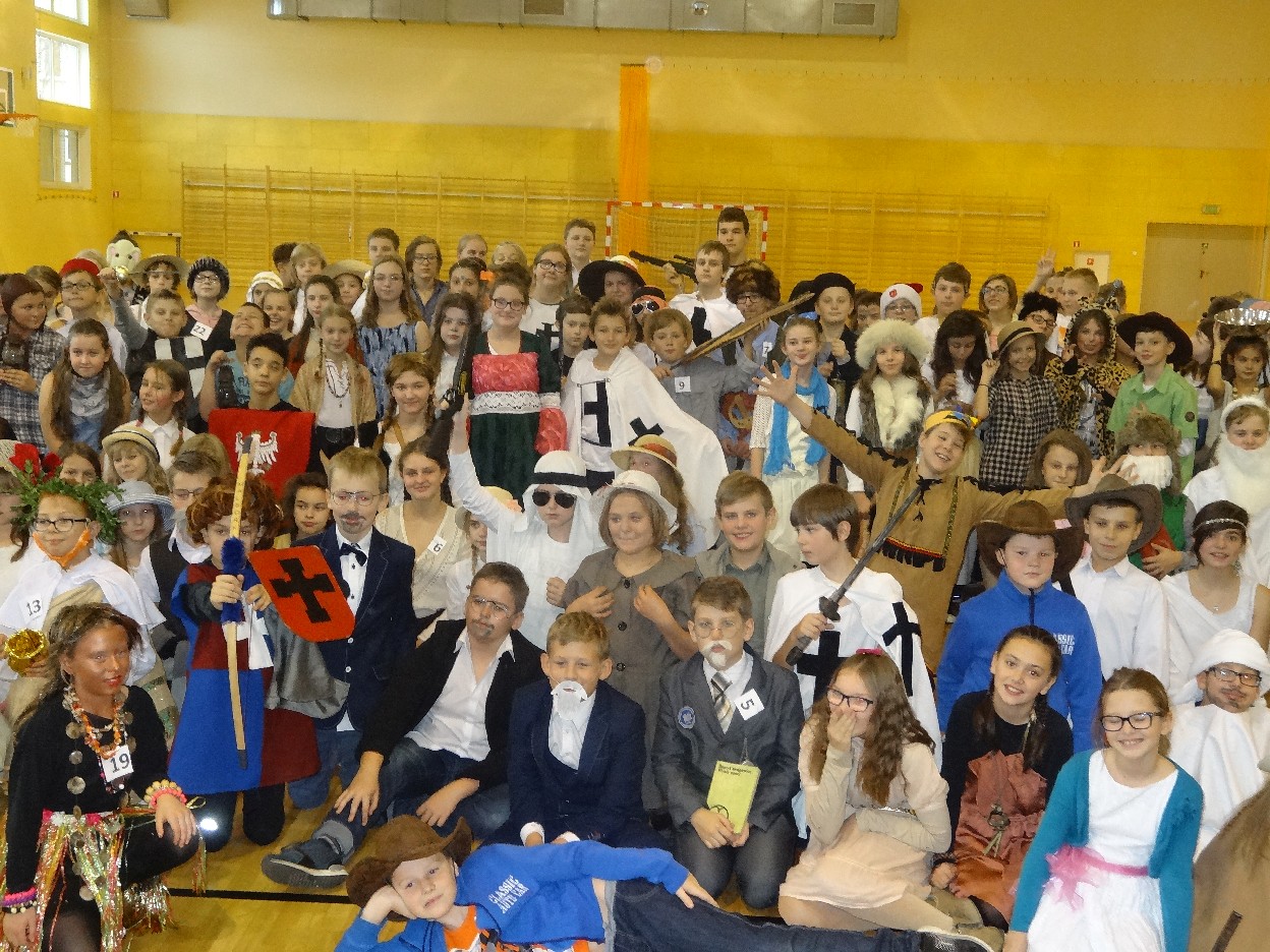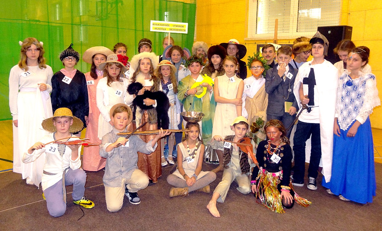 12 listopada było inaczej niż zazwyczaj w szkole. Od samego rana na szkolnych korytarzach można było spotkać bohaterów książek Henryka Sienkiewicza. Tym razem wśród uczniów byli: Staś, Nel, pani Oliwier, Latarnik, Krzyżacy, Murzyni, Oleńka Bilewiczówna, Neron, Ligia, Sachem a nawet pies Saba, słoń King. Póżniej wszyscy spotkali się w sali sportowej. Każda klasa wystawiła swoich reprezentantów do konkursu na najlepszą kreację bohatera. Kryteria oceny były surowe, jednak komisja konkursowa nie była w stanie wyłonić zwyciezców. Stwierdzono, że wszystkie postacie doskonale odzwierciedlają bohaterów z książek naszego Patrona. Wszyscy otrzymali zatem najwyższą liczbę punktów. W XIX w. trzeba byo wykazywać się odwagą i zwinnością. Aby to sprawdzić chętni bohaterowie utworów Henryka Sienkiewicza przystapili do konkurencji sportowych pod okiem nauczycieli w - fu. Było wesoło, okazało się, że nie jest łatwo wygrać, mając na sobie różne stroje. Dzień ten był wspaniały, stał sie zachetą do czytania utworów Henryka Sienkiewicza.