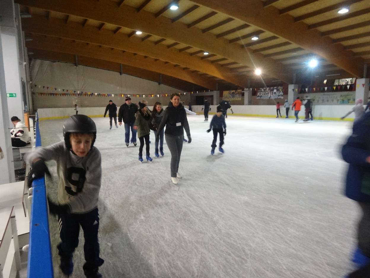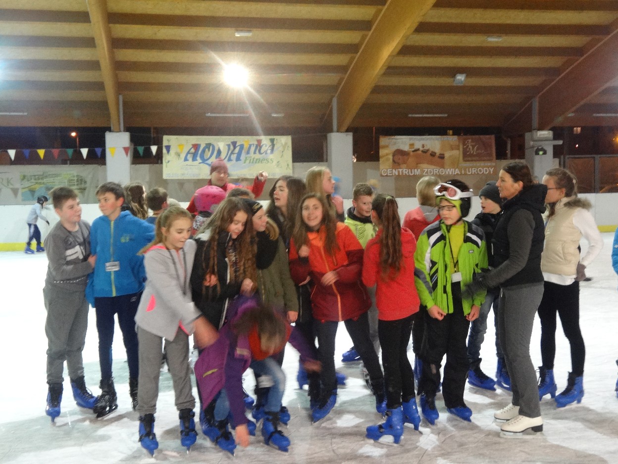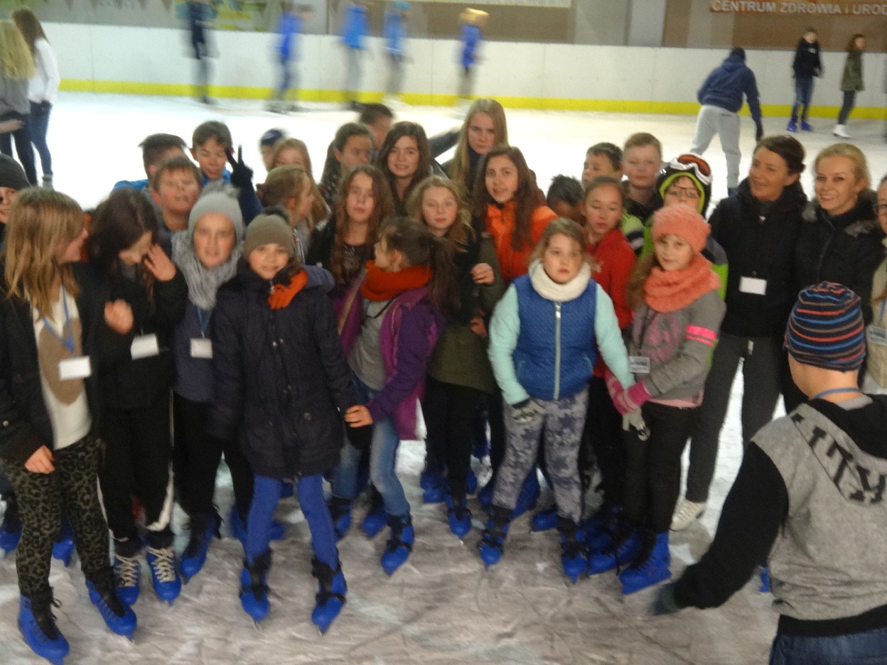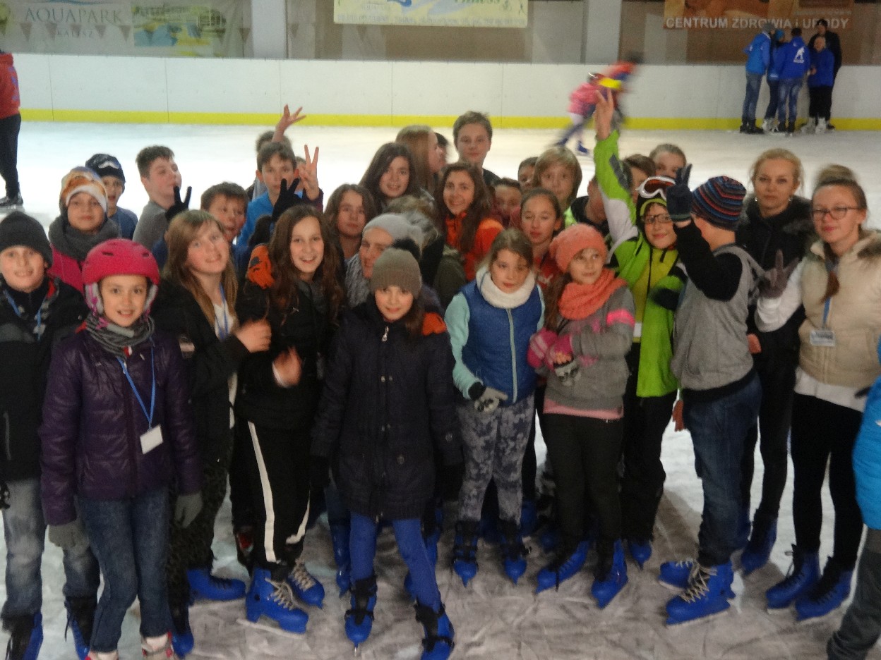 W ostatni poniedziałek listopada 2015 r. klasy czwarte, piąte i szóste udały się na lodowisko do Kalisza. Naszymi opiekunami były panie: Bożena Mielczarek, Agnieszka Koszykowska, Magdalena Sobczak. Sprzed szkoły wyruszyliśmy o godzinie 16.30. Po niespełna godzinie dotarliśmy do obiektu sportowego w którym mieści się lodowisko. Przygotowanie do wyjścia na lód zajęło nam trochę czasu. Wypożyczyliśmy łyżwy i po założeniu ich postanowiliśmy wejść na taflę, oczywiście pod czujnym okiem instruktora. Niektórzy mieli już za sobą pierwszą jazdę na łyżwach i sami postanowili oddać się szaleństwu jazdy. Początkujący łyżwiarze po kilku radach instruktora i niewielkich upadkach zaczęli sobie radzić. Z upływem czasu było coraz lepiej. Po godzinie jazdy musieliśmy schodzić z lodowiska. Wyjazd był bardzo udany. Podczas pobytu na lodowisku wzmocniliśmy naszą sprawność fizyczną. Był to czas wspólnej zabawy i rekreacji. Zrelaksowani i zadowoleni nie możemy doczekać się następnego wyjazdu, który będzie już za tydzień. Wyjazdy na lodowisko organizowane są przez Samorząd Uczniowski naszej szkoły.