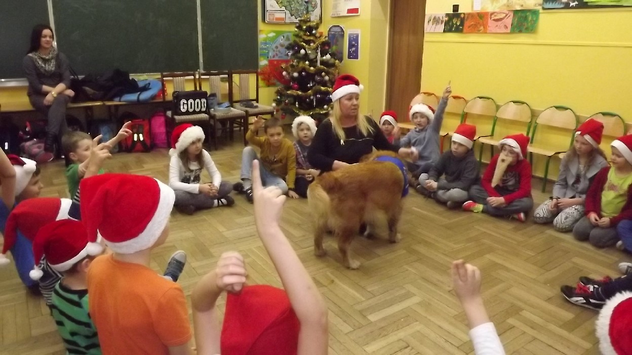 Rodzice dzieci z klasy 2 b przyzwyczaili swoje pociechy do różnych niezwykłości. W ubiegłym roku z okazji Mikołajek do dzieci przyszła pani florystka. W bieżącym roku wizyta była równie niezwykła. Gościem była pani Anna Mikołajczyk nauczyciel dogoterapeuta z suczką Gracją. Gracja jest dyplomowanym psem terapeutą, goldenem retriverem, a przede wszystkim sympatyczną suczką przyjaciółką dzieci.