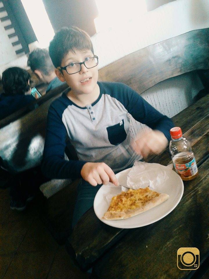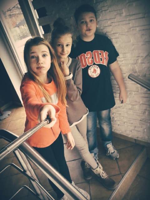 O godzinie 10:35 zebraliśmy się w szatni, a następnie udaliśmy się do naszego celu. Dumnie spacerowaliśmy po ulicach miasta ubrani w czerwone czapki św. Mikołaja. Rozmawialiśmy o prezentach, które dostaliśmy oraz o sposobie spędzania świąt Bożego Narodzenia. Po przybyciu usiedliśmy przy stołach. Wreszcie podano nam pizze i zabraliśmy się za jedzenie ich. Wszystko nam bardzo smakowało. Z pełnymi brzuchami zeszliśmy do piwnicy, a tam graliśmy w cymbergaja oraz wspólnie się śmialiśmy. Smutni wracaliśmy na lekcje rozpamiętując spędzone na rozmowach prawie dwie godziny. Zawitaliśmy jeszcze do muzeum w Turku, aby obejrzeć wystawę o naszej szkole. Zadziwiły nas stare zeszyty, pomoce, a najbardziej zdjęcia. Z trudem rozpoznawaliśmy na nich poszczególne pomieszczenia. Mimo to, miło wspominamy wizytę.