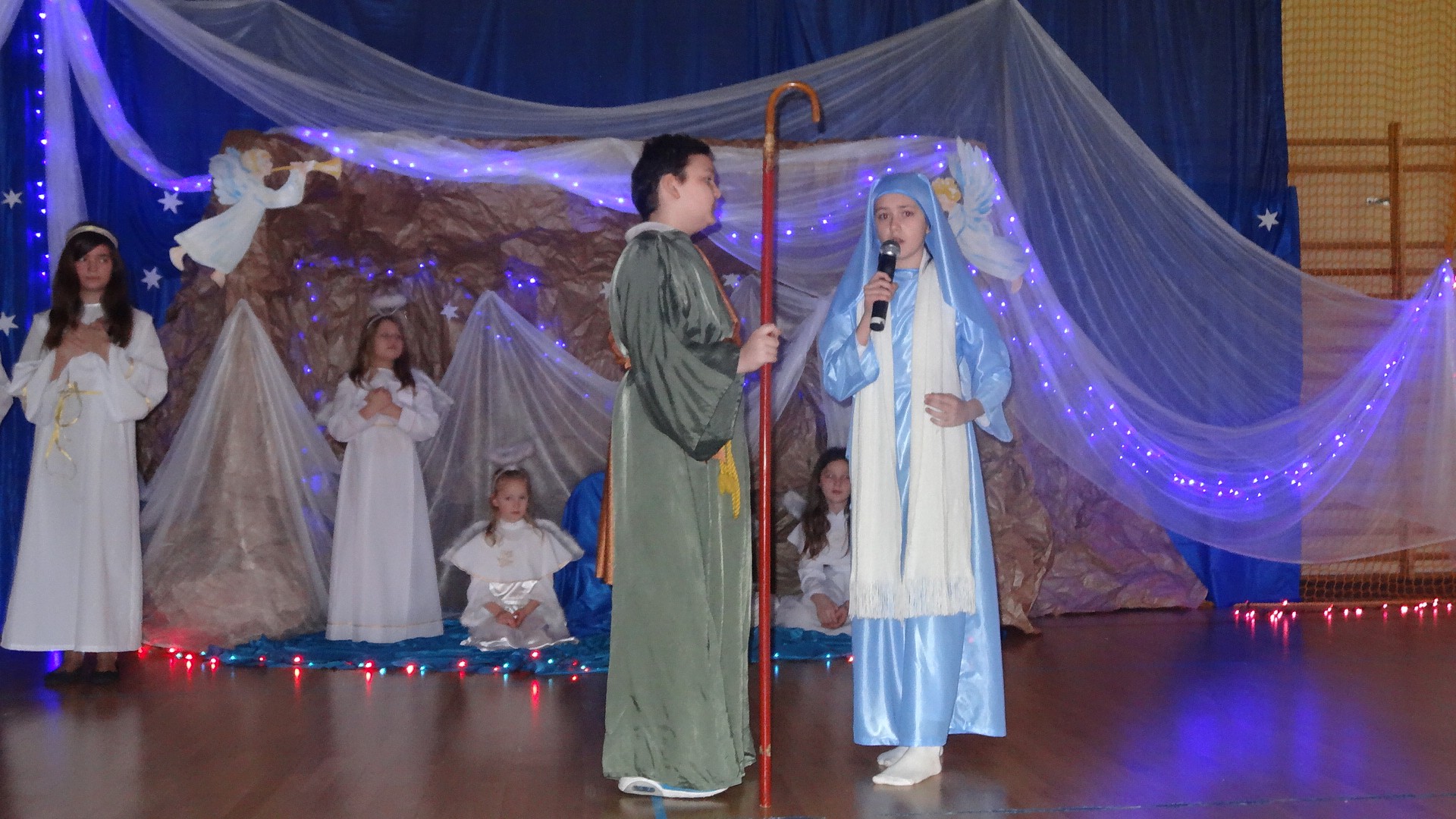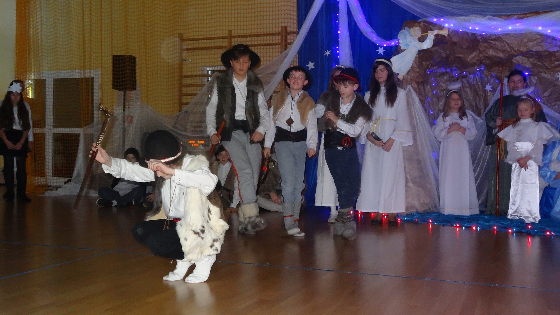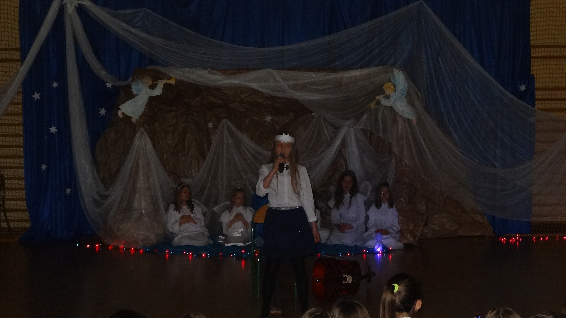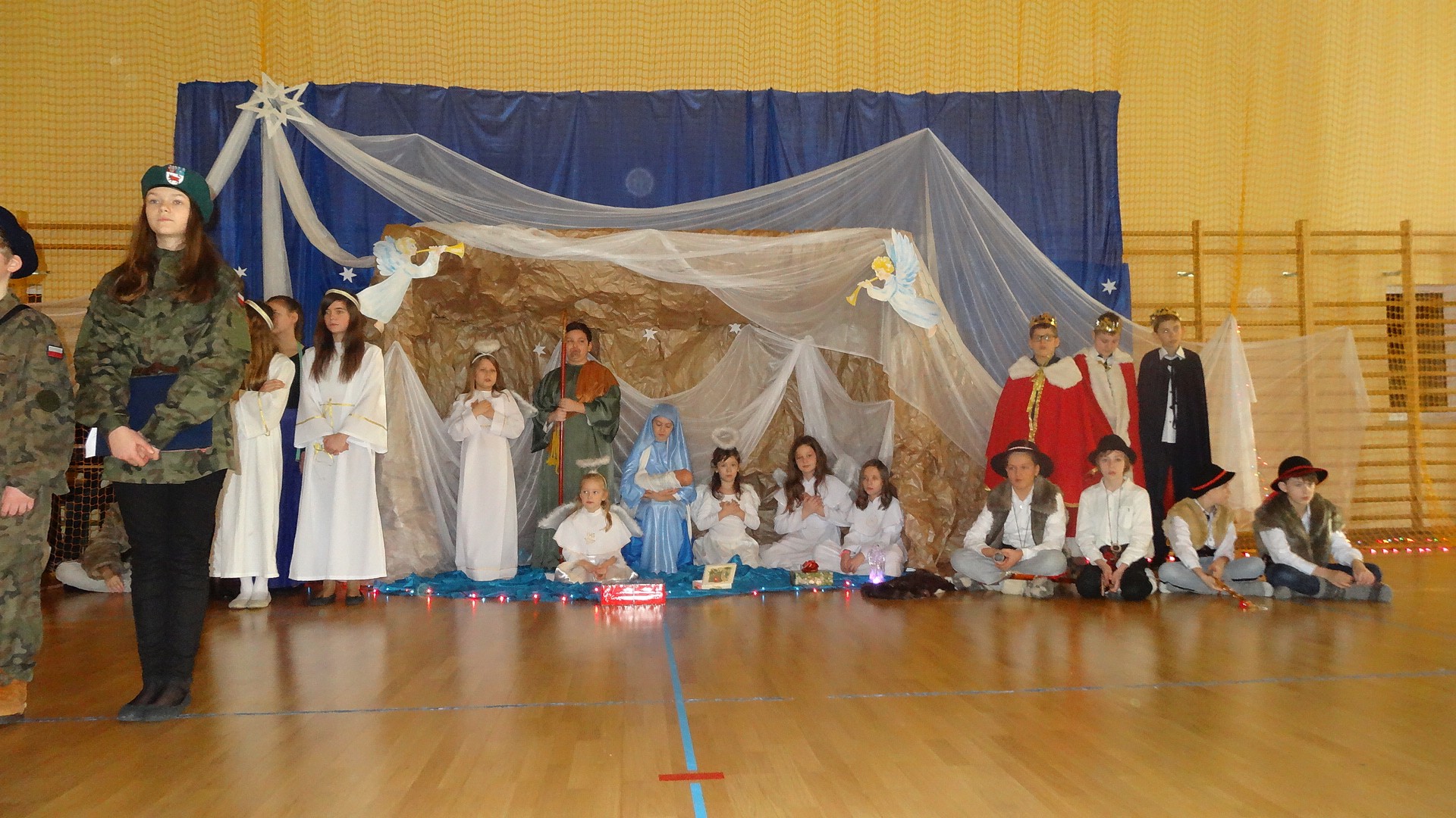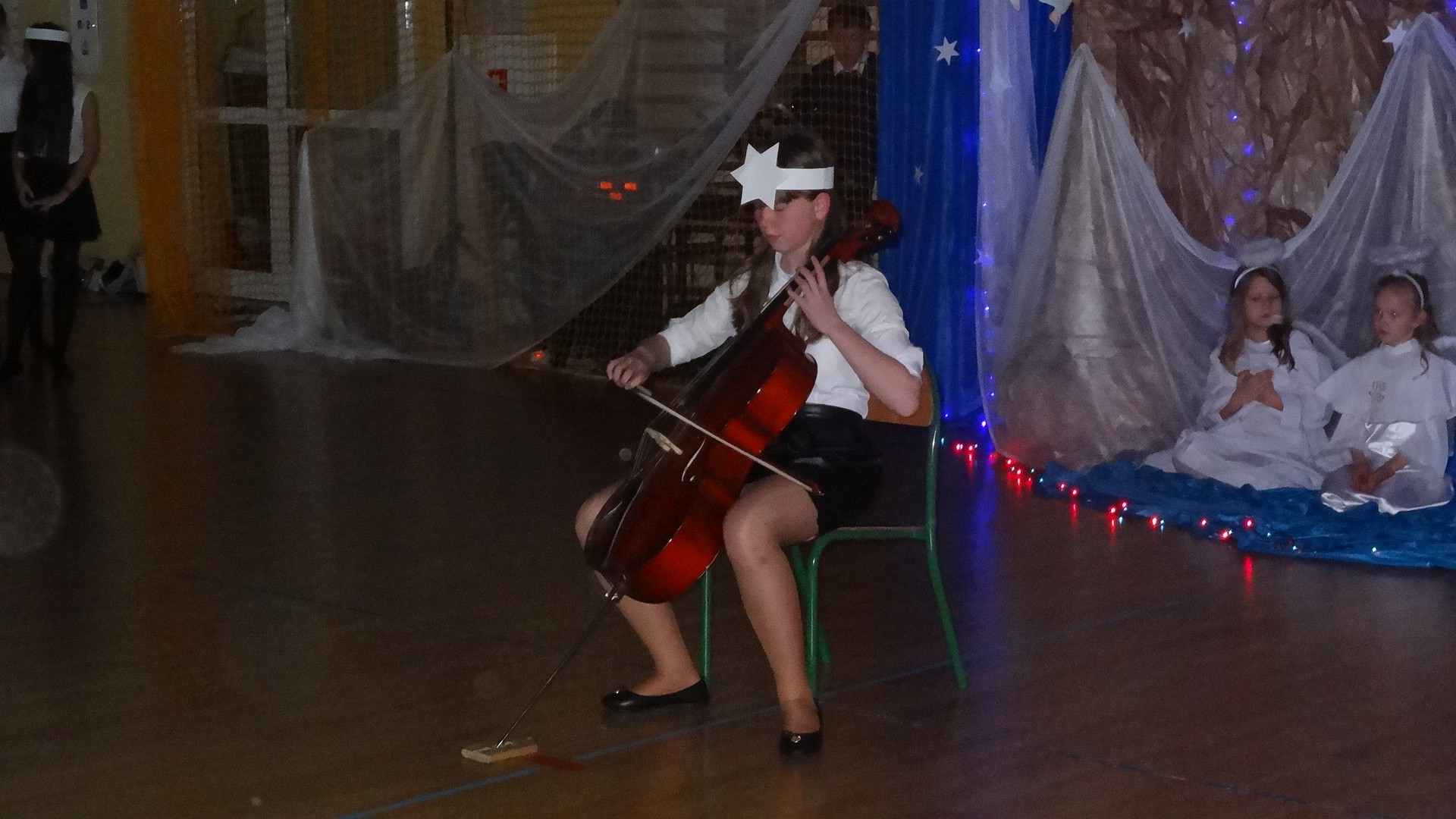 Po zebraniu się na hali gimnastycznej, Weronika Dziamara pięknie zagrała kolędę ,,Cicha noc na wiolonczeli. Następnie na scenę wyszedł anioł i ślicznie zaśpiewał pastorałkę. Później zobaczyliśmy niebiańską istotę przemawiającą do zgromadzonych. Ujrzeliśmy zmęczoną Maryję wraz z Józefem, którzy szukali noclegu, a ponieważ nigdzie go nie znaleźli, zatrzymali się w zubożałej stajence. Niedługo po tym, Matka kołysała już malutkiego Jezuska w swych ramionach pośród milczących aniołków. Jako pierwsi do szopy przybyli pastuszkowie, a po nich przybiegli weseli górale, zatańczyli charakterystyczny taniec z ciupagami oraz zaśpiewali. Do Świętej Rodziny zmierzali również szewcy i szwaczki, aby podarować trzewiki. Następnie ujrzeliśmy trzech królów, którzy nieśli skarby - kadzidło, mirrę oraz złoto. Po chwili na scenie pojawili się żołnierze. Uczennica klasy VIe - Klaudia Michalak, przeczytała wiersz o Bożym Narodzeniu, a Agata Drabina odmówiła ,,Modlitwę za Ojczyznę. Narrator złożył wszystkim życzenia. Cały występ pełen był kolęd oraz pastorałek. Śpiewaliśmy m. in. ,, Cichą noc, ,,Przybieżeli do Betlejem, ,,Wśród nocnej ciszy. Całe przedstawienie urok zawdzięczało również przepięknej scenerii. Białe lampeczki i gwiazdki przenosiły nas w niebiański świat, a błękitne tkaniny sprawiały wrażenie pobytu w mistycznym miejscu. Niezwykłe kostiumy zabierały zgromadzonych do Betlejem, abyśmy mogli ujrzeć cud, który zdarzył się przed wiekami, a nadal jest pamiętany i rozgłaszany.