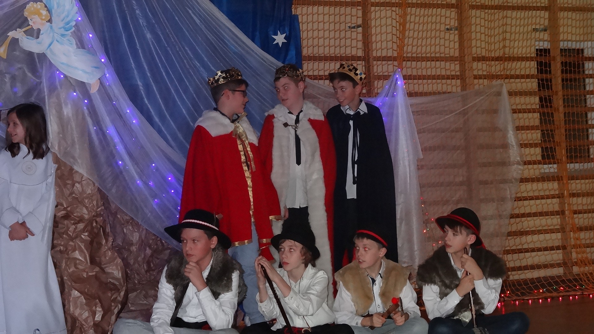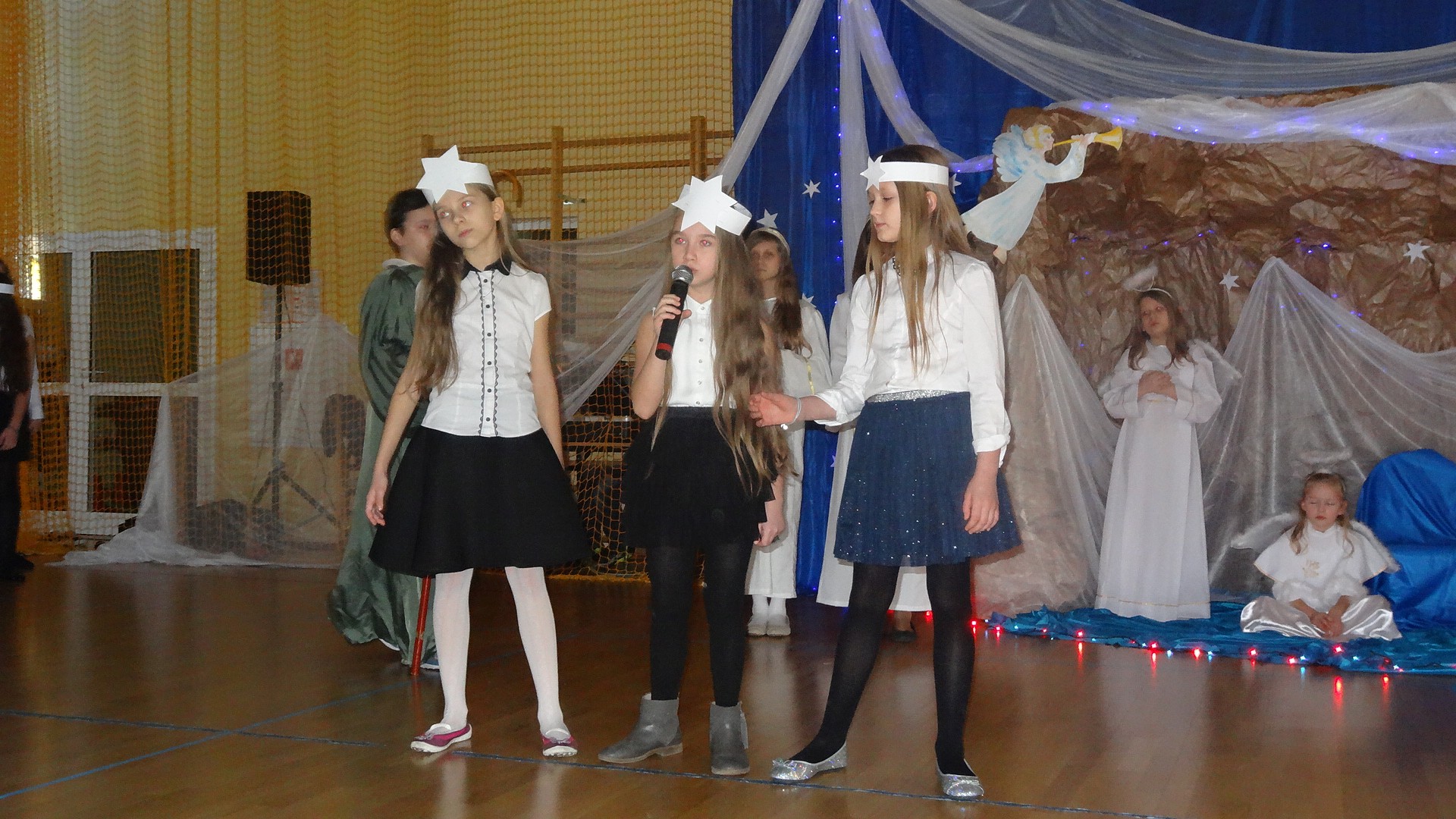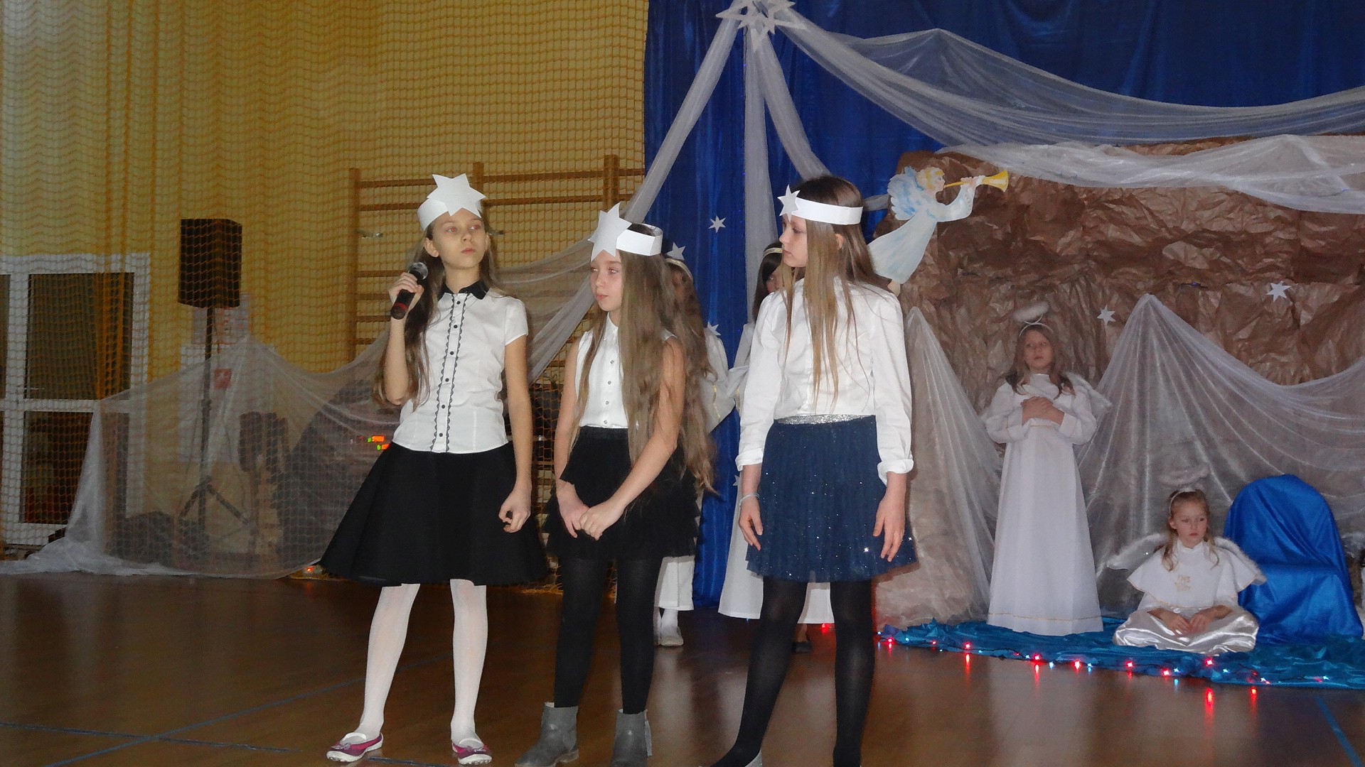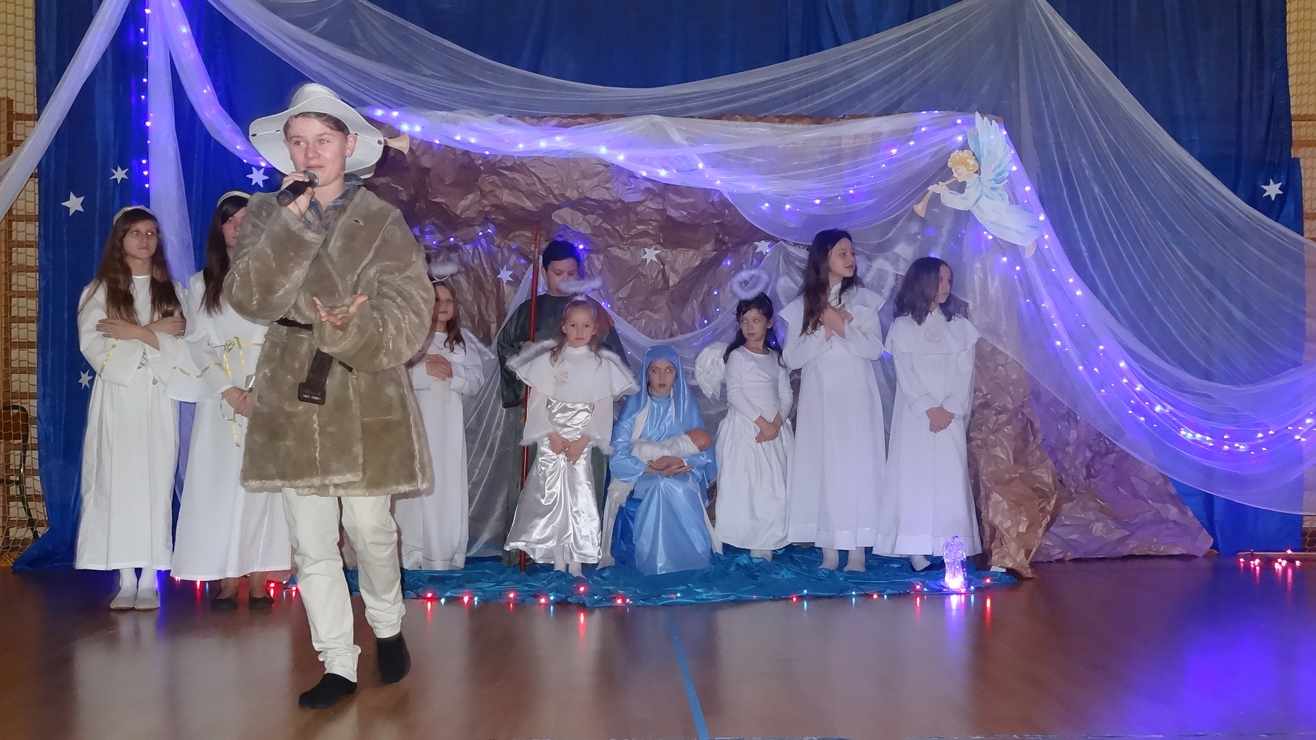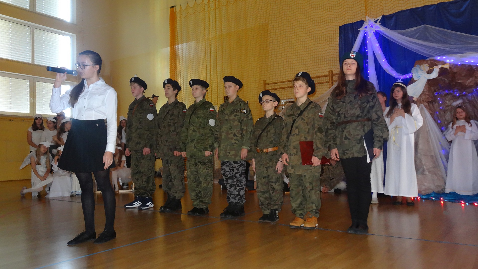 Po zebraniu się na hali gimnastycznej, Weronika Dziamara pięknie zagrała kolędę ,,Cicha noc na wiolonczeli. Następnie na scenę wyszedł anioł i ślicznie zaśpiewał pastorałkę. Później zobaczyliśmy niebiańską istotę przemawiającą do zgromadzonych. Ujrzeliśmy zmęczoną Maryję wraz z Józefem, którzy szukali noclegu, a ponieważ nigdzie go nie znaleźli, zatrzymali się w zubożałej stajence. Niedługo po tym, Matka kołysała już malutkiego Jezuska w swych ramionach pośród milczących aniołków. Jako pierwsi do szopy przybyli pastuszkowie, a po nich przybiegli weseli górale, zatańczyli charakterystyczny taniec z ciupagami oraz zaśpiewali. Do Świętej Rodziny zmierzali również szewcy i szwaczki, aby podarować trzewiki. Następnie ujrzeliśmy trzech królów, którzy nieśli skarby - kadzidło, mirrę oraz złoto. Po chwili na scenie pojawili się żołnierze. Uczennica klasy VIe - Klaudia Michalak, przeczytała wiersz o Bożym Narodzeniu, a Agata Drabina odmówiła ,,Modlitwę za Ojczyznę. Narrator złożył wszystkim życzenia. Cały występ pełen był kolęd oraz pastorałek. Śpiewaliśmy m. in. ,, Cichą noc, ,,Przybieżeli do Betlejem, ,,Wśród nocnej ciszy. Całe przedstawienie urok zawdzięczało również przepięknej scenerii. Białe lampeczki i gwiazdki przenosiły nas w niebiański świat, a błękitne tkaniny sprawiały wrażenie pobytu w mistycznym miejscu. Niezwykłe kostiumy zabierały zgromadzonych do Betlejem, abyśmy mogli ujrzeć cud, który zdarzył się przed wiekami, a nadal jest pamiętany i rozgłaszany.