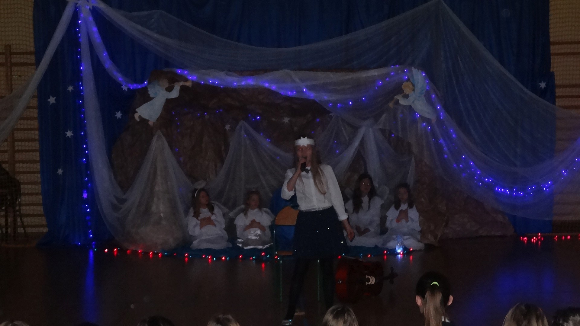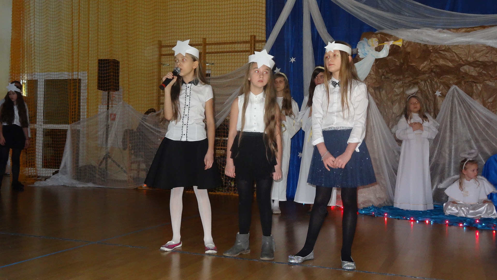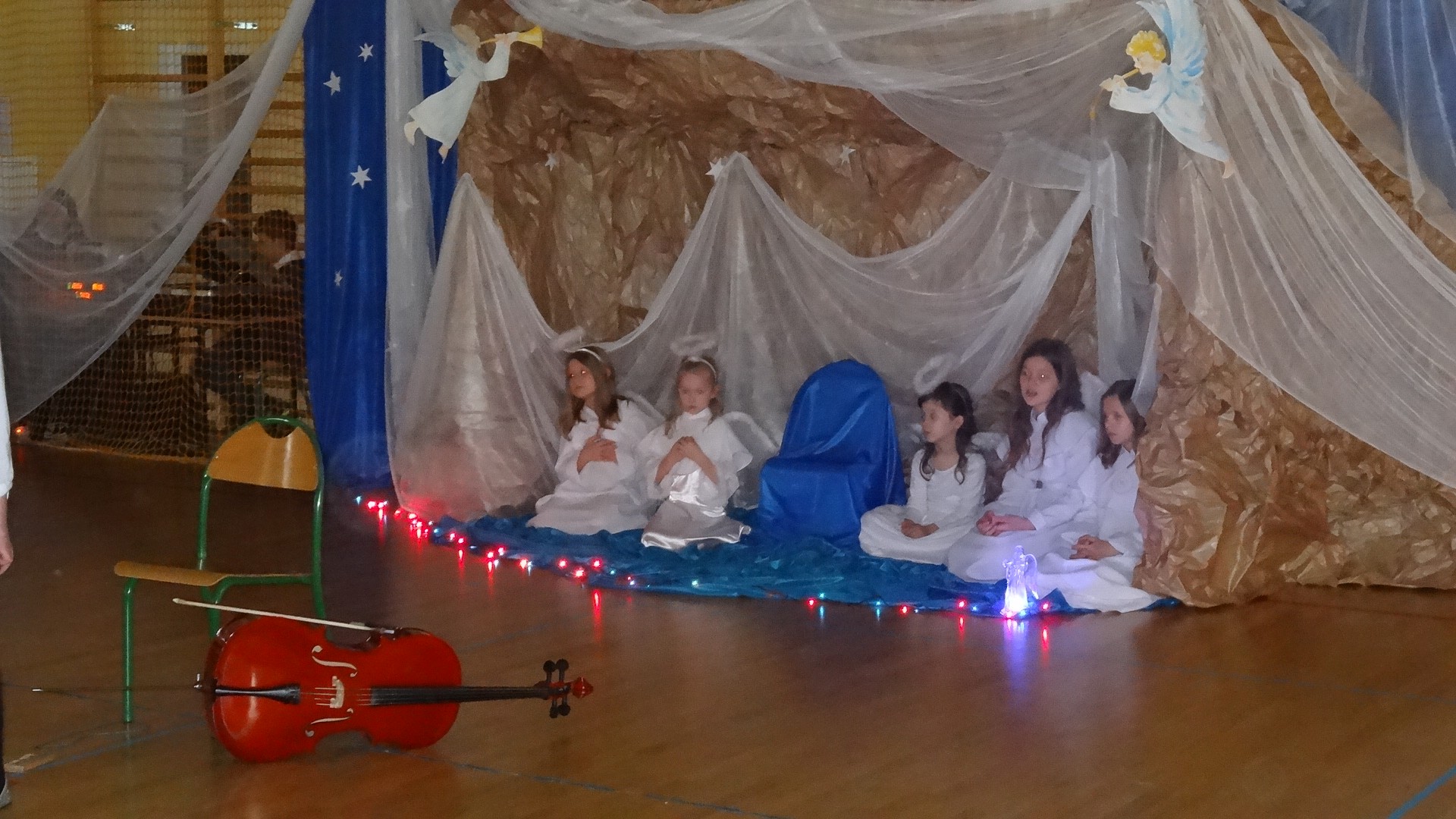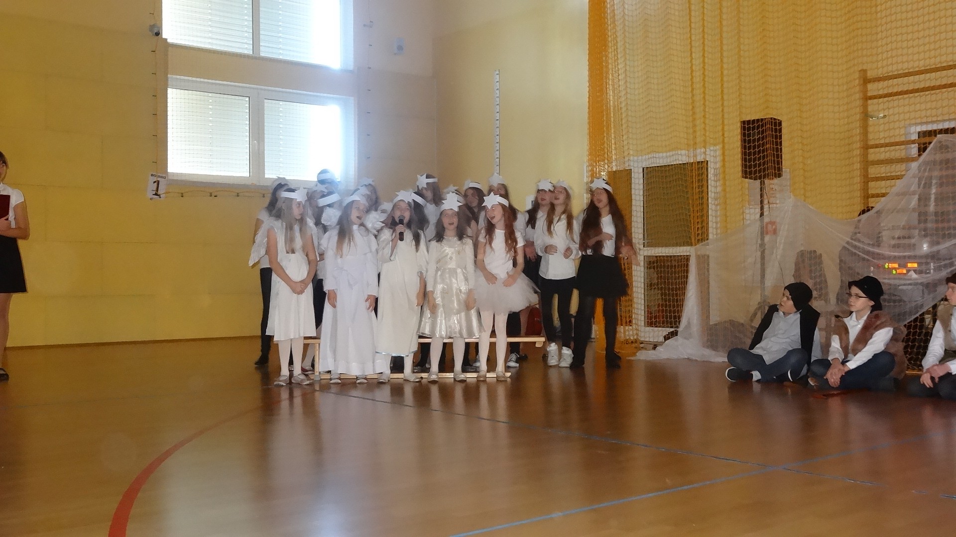 Po zebraniu się na hali gimnastycznej, Weronika Dziamara pięknie zagrała kolędę ,,Cicha noc na wiolonczeli. Następnie na scenę wyszedł anioł i ślicznie zaśpiewał pastorałkę. Później zobaczyliśmy niebiańską istotę przemawiającą do zgromadzonych. Ujrzeliśmy zmęczoną Maryję wraz z Józefem, którzy szukali noclegu, a ponieważ nigdzie go nie znaleźli, zatrzymali się w zubożałej stajence. Niedługo po tym, Matka kołysała już malutkiego Jezuska w swych ramionach pośród milczących aniołków. Jako pierwsi do szopy przybyli pastuszkowie, a po nich przybiegli weseli górale, zatańczyli charakterystyczny taniec z ciupagami oraz zaśpiewali. Do Świętej Rodziny zmierzali również szewcy i szwaczki, aby podarować trzewiki. Następnie ujrzeliśmy trzech królów, którzy nieśli skarby - kadzidło, mirrę oraz złoto. Po chwili na scenie pojawili się żołnierze. Uczennica klasy VIe - Klaudia Michalak, przeczytała wiersz o Bożym Narodzeniu, a Agata Drabina odmówiła ,,Modlitwę za Ojczyznę. Narrator złożył wszystkim życzenia. Cały występ pełen był kolęd oraz pastorałek. Śpiewaliśmy m. in. ,, Cichą noc, ,,Przybieżeli do Betlejem, ,,Wśród nocnej ciszy. Całe przedstawienie urok zawdzięczało również przepięknej scenerii. Białe lampeczki i gwiazdki przenosiły nas w niebiański świat, a błękitne tkaniny sprawiały wrażenie pobytu w mistycznym miejscu. Niezwykłe kostiumy zabierały zgromadzonych do Betlejem, abyśmy mogli ujrzeć cud, który zdarzył się przed wiekami, a nadal jest pamiętany i rozgłaszany.