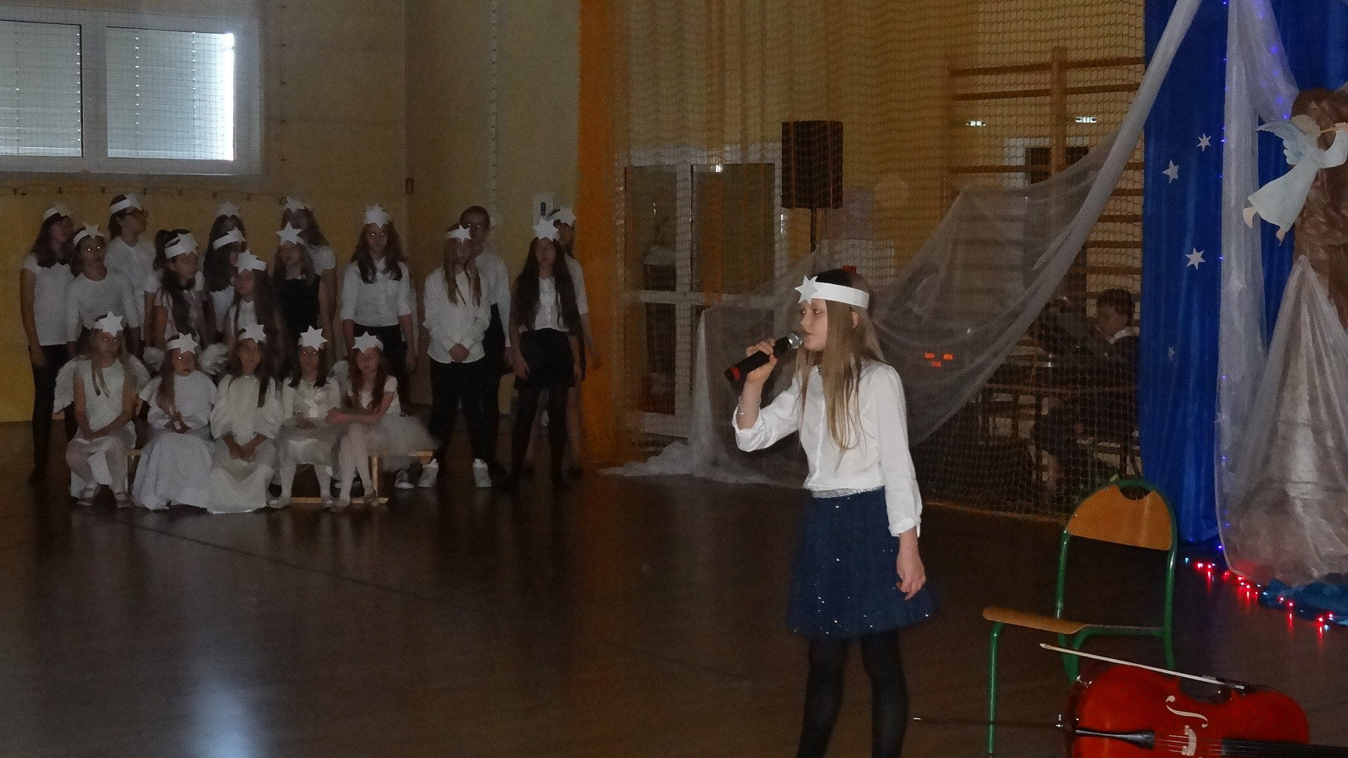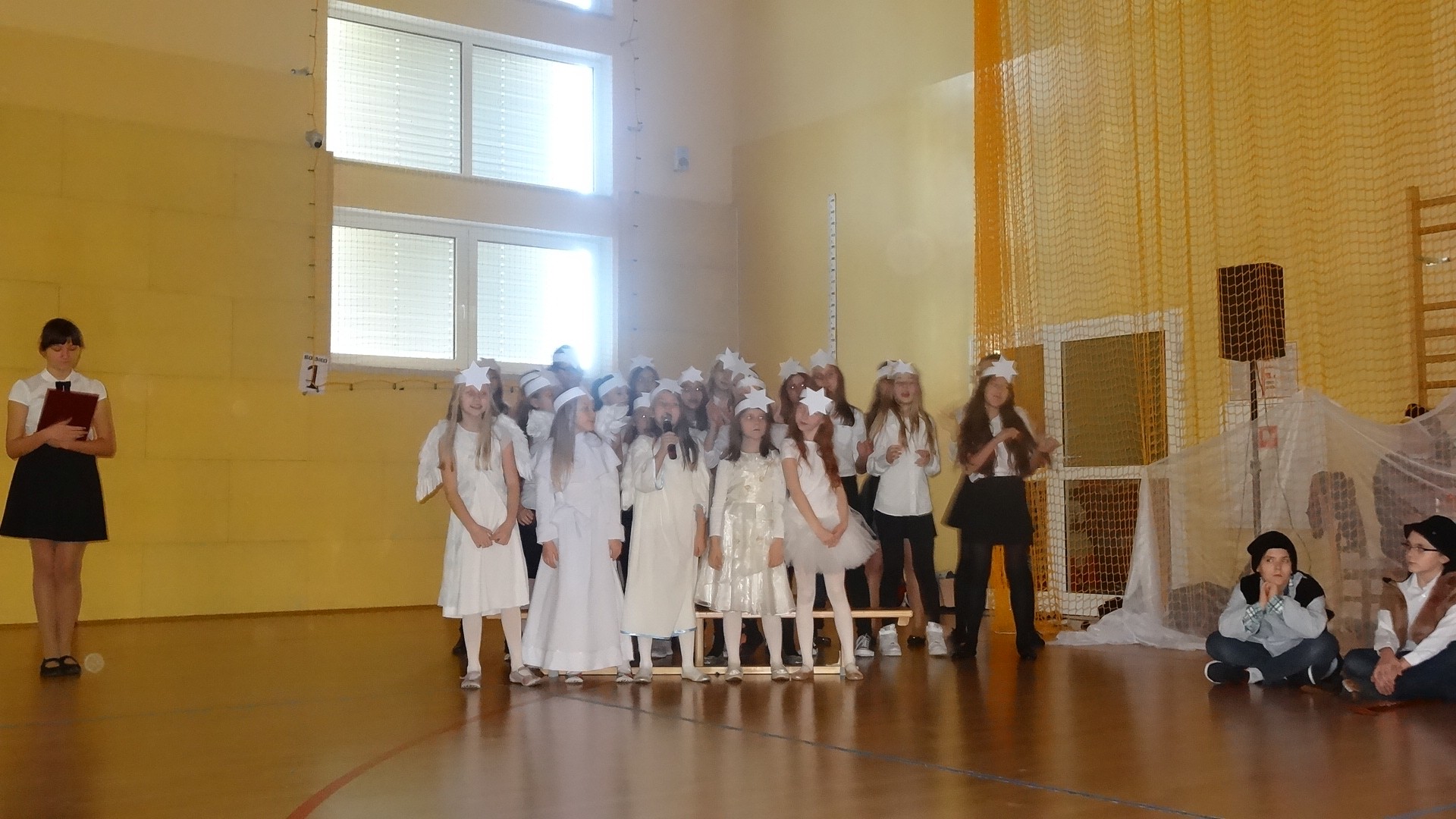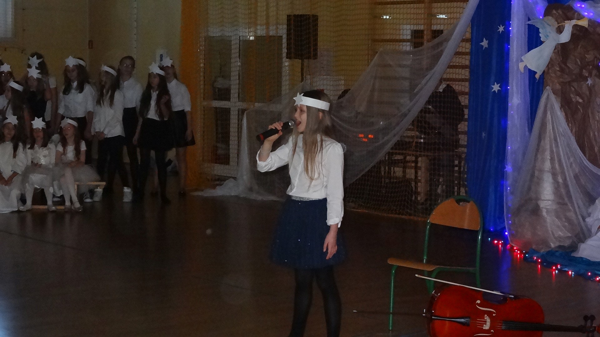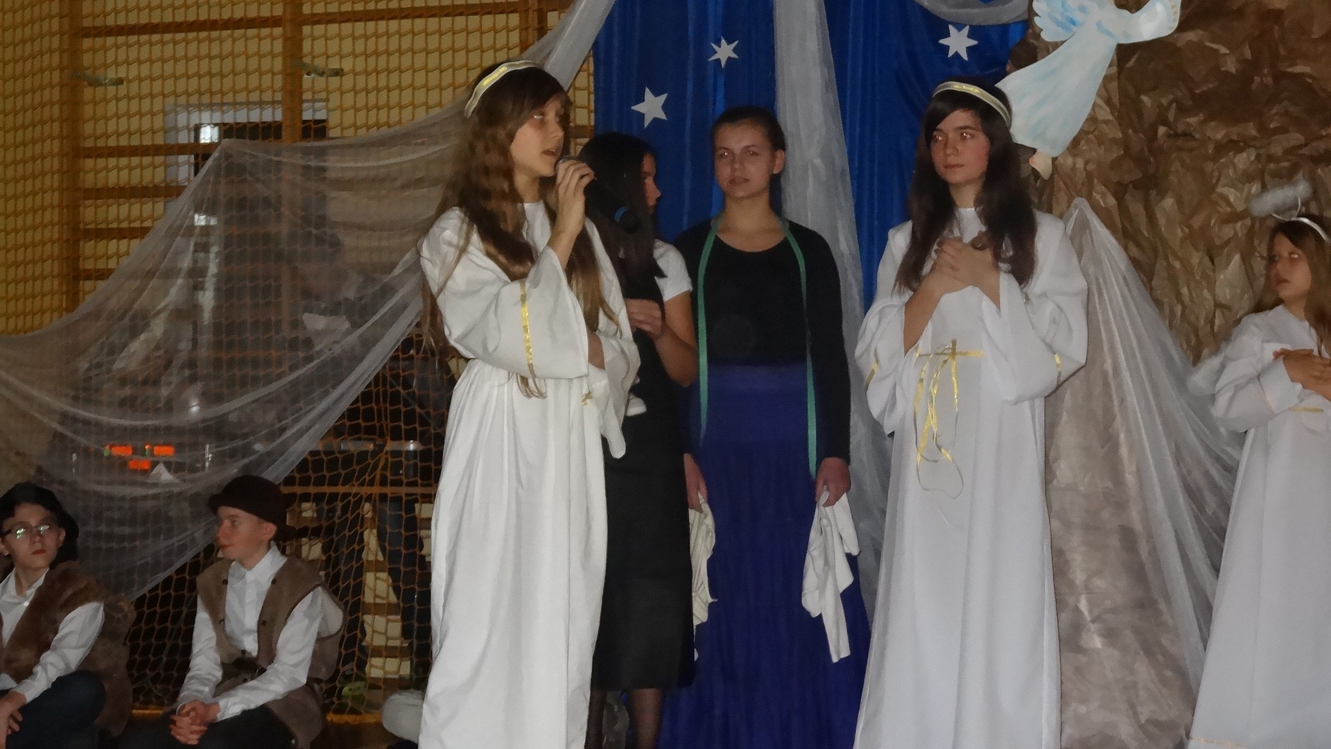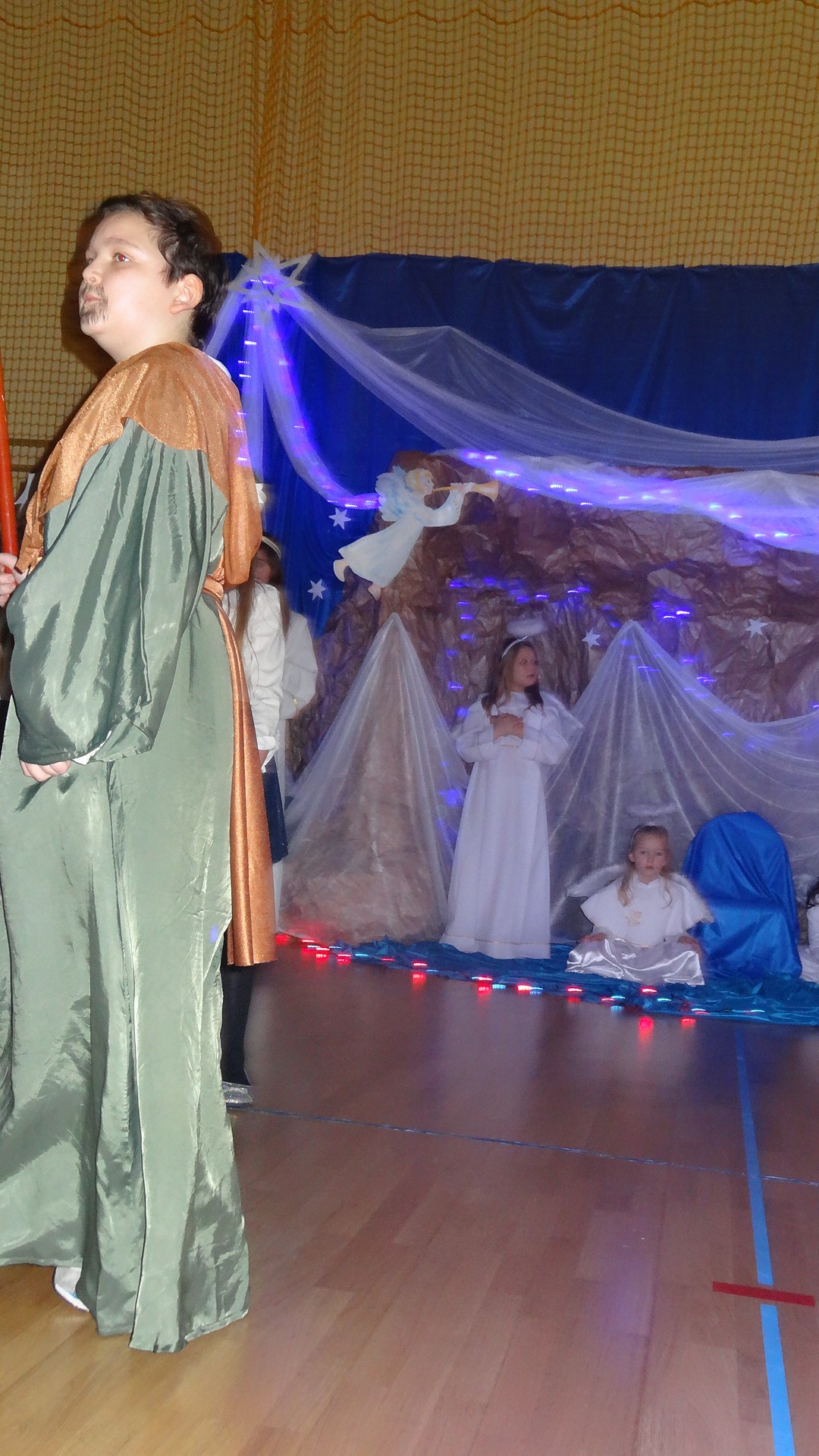 Po zebraniu się na hali gimnastycznej, Weronika Dziamara pięknie zagrała kolędę ,,Cicha noc na wiolonczeli. Następnie na scenę wyszedł anioł i ślicznie zaśpiewał pastorałkę. Później zobaczyliśmy niebiańską istotę przemawiającą do zgromadzonych. Ujrzeliśmy zmęczoną Maryję wraz z Józefem, którzy szukali noclegu, a ponieważ nigdzie go nie znaleźli, zatrzymali się w zubożałej stajence. Niedługo po tym, Matka kołysała już malutkiego Jezuska w swych ramionach pośród milczących aniołków. Jako pierwsi do szopy przybyli pastuszkowie, a po nich przybiegli weseli górale, zatańczyli charakterystyczny taniec z ciupagami oraz zaśpiewali. Do Świętej Rodziny zmierzali również szewcy i szwaczki, aby podarować trzewiki. Następnie ujrzeliśmy trzech królów, którzy nieśli skarby - kadzidło, mirrę oraz złoto. Po chwili na scenie pojawili się żołnierze. Uczennica klasy VIe - Klaudia Michalak, przeczytała wiersz o Bożym Narodzeniu, a Agata Drabina odmówiła ,,Modlitwę za Ojczyznę. Narrator złożył wszystkim życzenia. Cały występ pełen był kolęd oraz pastorałek. Śpiewaliśmy m. in. ,, Cichą noc, ,,Przybieżeli do Betlejem, ,,Wśród nocnej ciszy. Całe przedstawienie urok zawdzięczało również przepięknej scenerii. Białe lampeczki i gwiazdki przenosiły nas w niebiański świat, a błękitne tkaniny sprawiały wrażenie pobytu w mistycznym miejscu. Niezwykłe kostiumy zabierały zgromadzonych do Betlejem, abyśmy mogli ujrzeć cud, który zdarzył się przed wiekami, a nadal jest pamiętany i rozgłaszany.