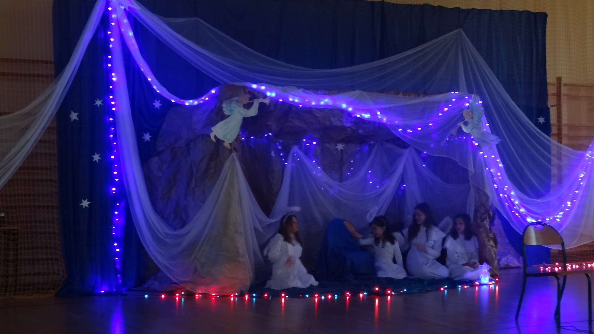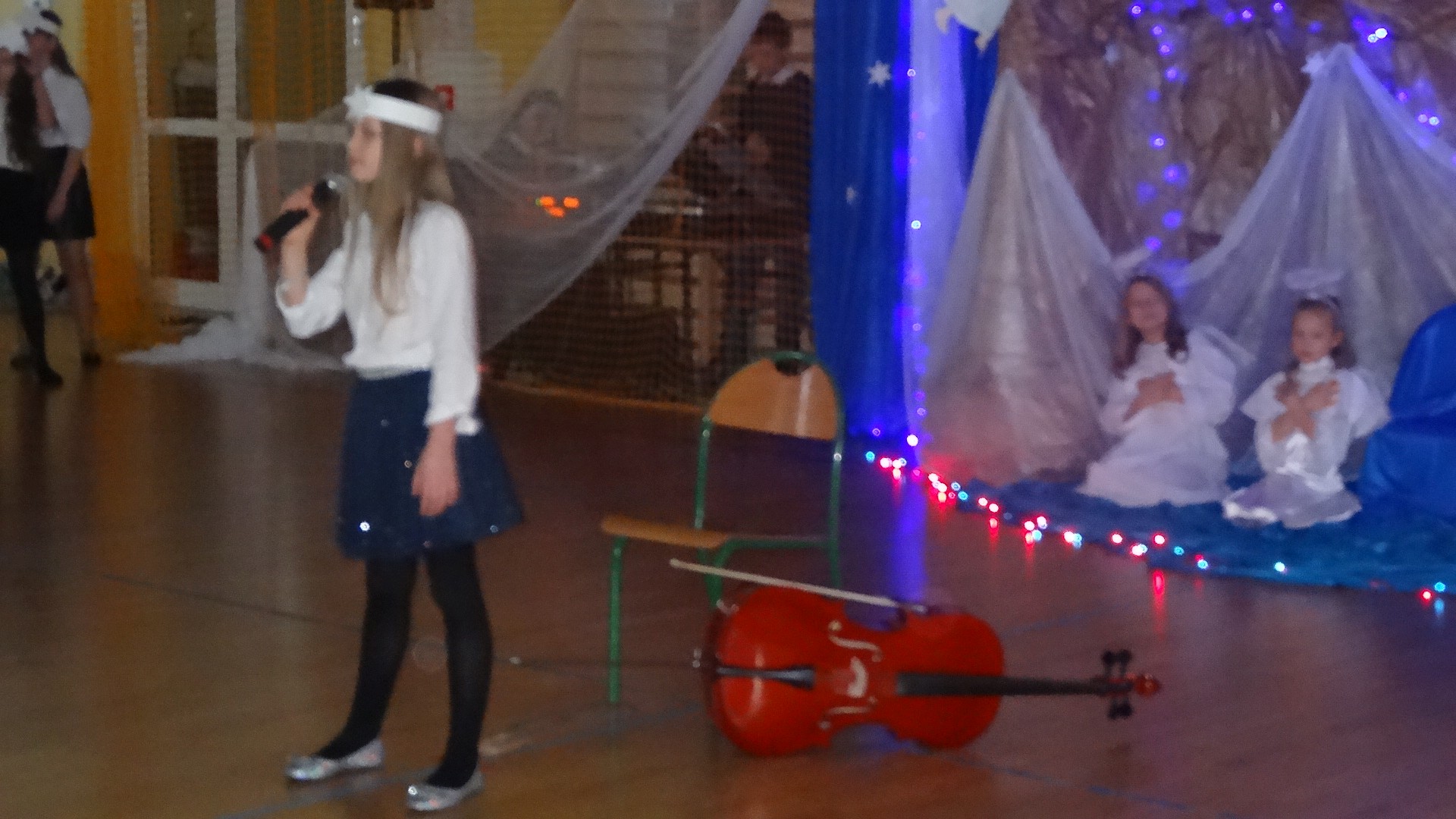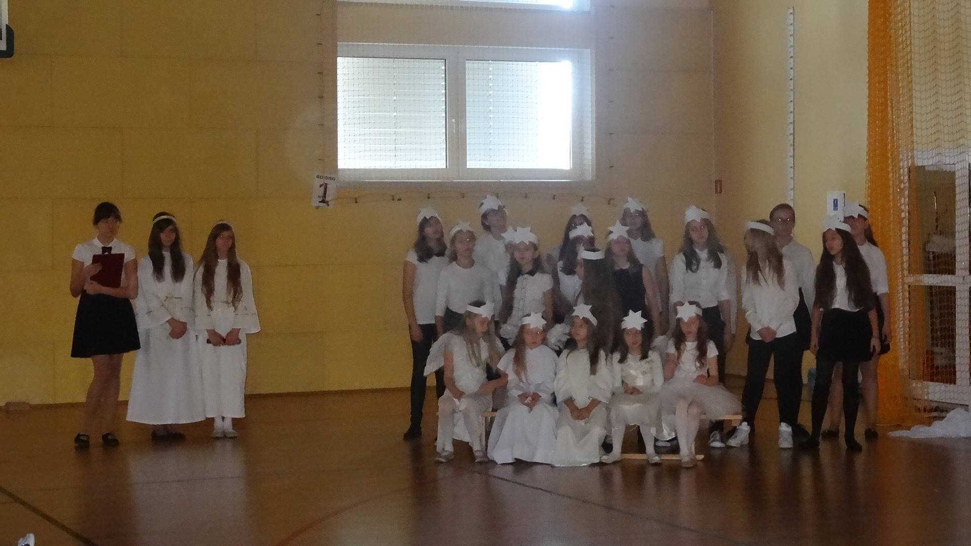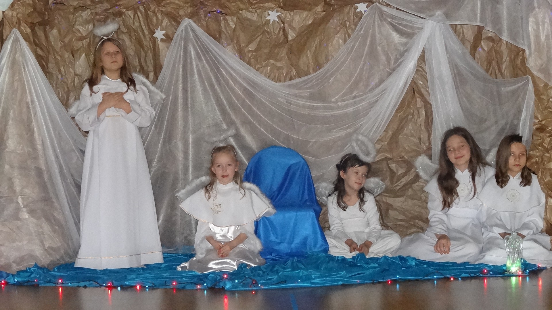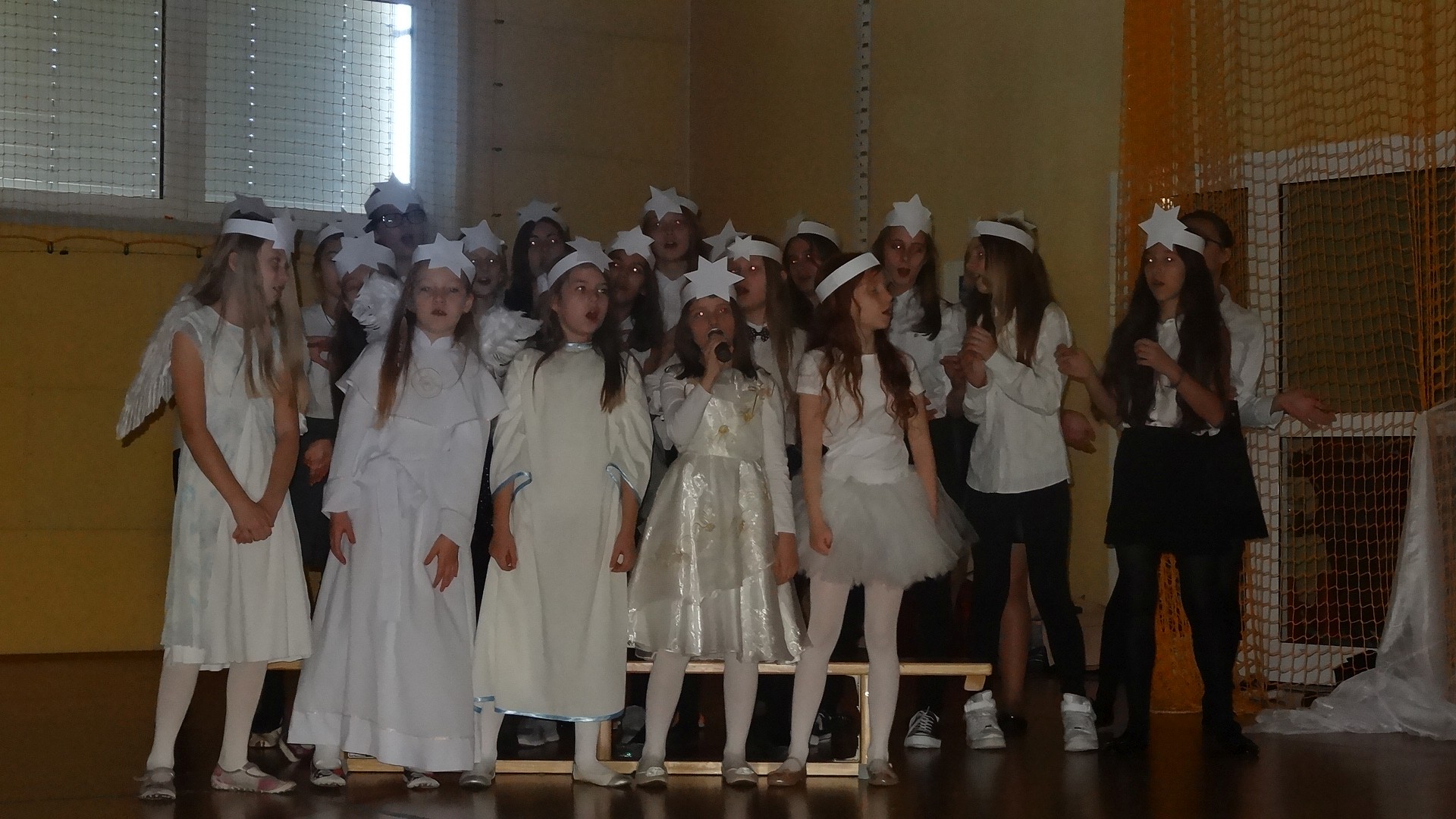 Po zebraniu się na hali gimnastycznej, Weronika Dziamara pięknie zagrała kolędę ,,Cicha noc na wiolonczeli. Następnie na scenę wyszedł anioł i ślicznie zaśpiewał pastorałkę. Później zobaczyliśmy niebiańską istotę przemawiającą do zgromadzonych. Ujrzeliśmy zmęczoną Maryję wraz z Józefem, którzy szukali noclegu, a ponieważ nigdzie go nie znaleźli, zatrzymali się w zubożałej stajence. Niedługo po tym, Matka kołysała już malutkiego Jezuska w swych ramionach pośród milczących aniołków. Jako pierwsi do szopy przybyli pastuszkowie, a po nich przybiegli weseli górale, zatańczyli charakterystyczny taniec z ciupagami oraz zaśpiewali. Do Świętej Rodziny zmierzali również szewcy i szwaczki, aby podarować trzewiki. Następnie ujrzeliśmy trzech królów, którzy nieśli skarby - kadzidło, mirrę oraz złoto. Po chwili na scenie pojawili się żołnierze. Uczennica klasy VIe - Klaudia Michalak, przeczytała wiersz o Bożym Narodzeniu, a Agata Drabina odmówiła ,,Modlitwę za Ojczyznę. Narrator złożył wszystkim życzenia. Cały występ pełen był kolęd oraz pastorałek. Śpiewaliśmy m. in. ,, Cichą noc, ,,Przybieżeli do Betlejem, ,,Wśród nocnej ciszy. Całe przedstawienie urok zawdzięczało również przepięknej scenerii. Białe lampeczki i gwiazdki przenosiły nas w niebiański świat, a błękitne tkaniny sprawiały wrażenie pobytu w mistycznym miejscu. Niezwykłe kostiumy zabierały zgromadzonych do Betlejem, abyśmy mogli ujrzeć cud, który zdarzył się przed wiekami, a nadal jest pamiętany i rozgłaszany.