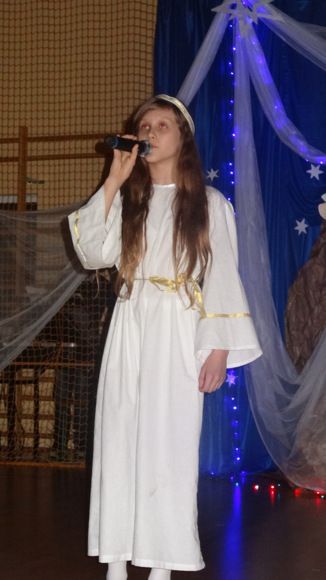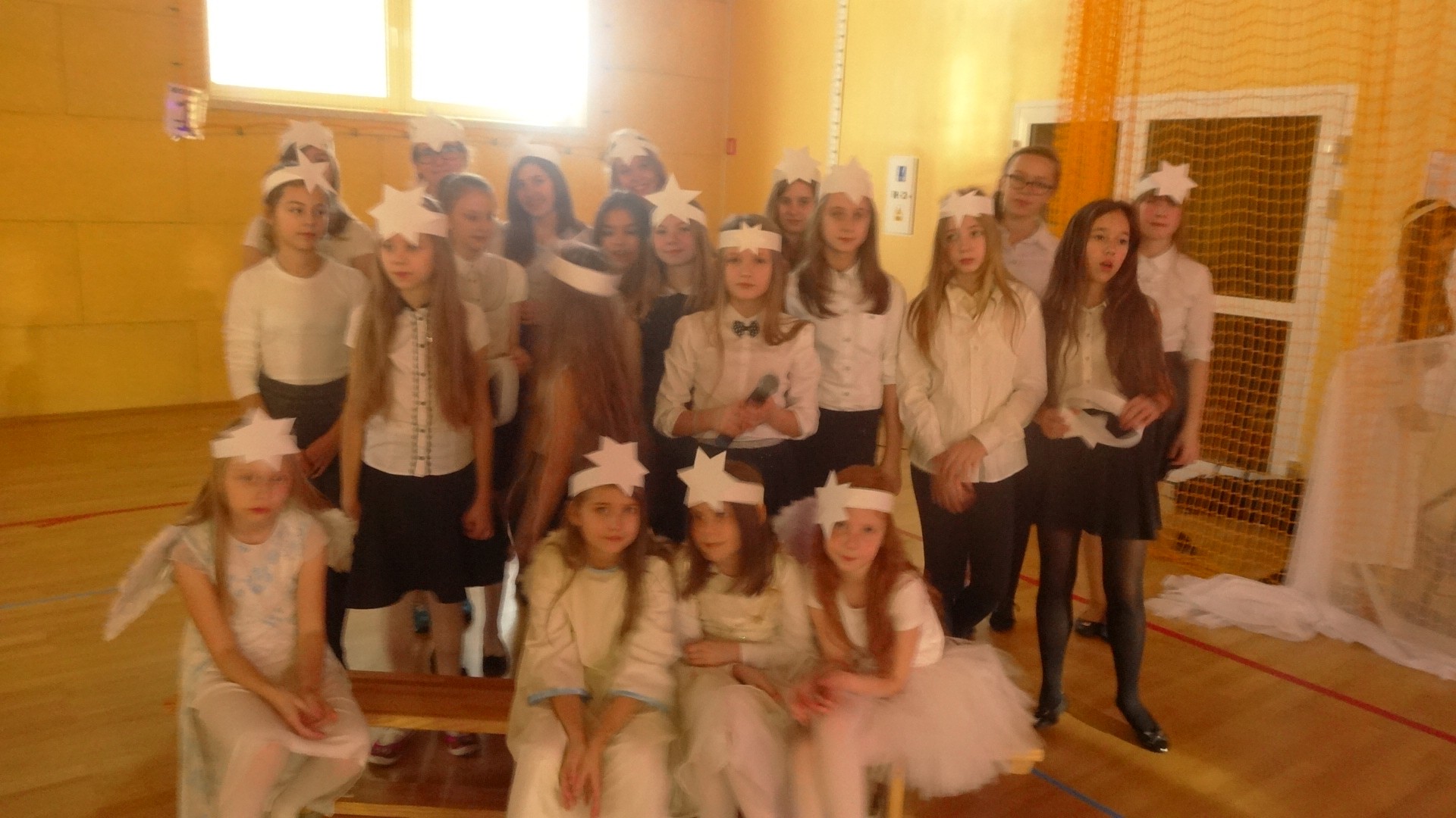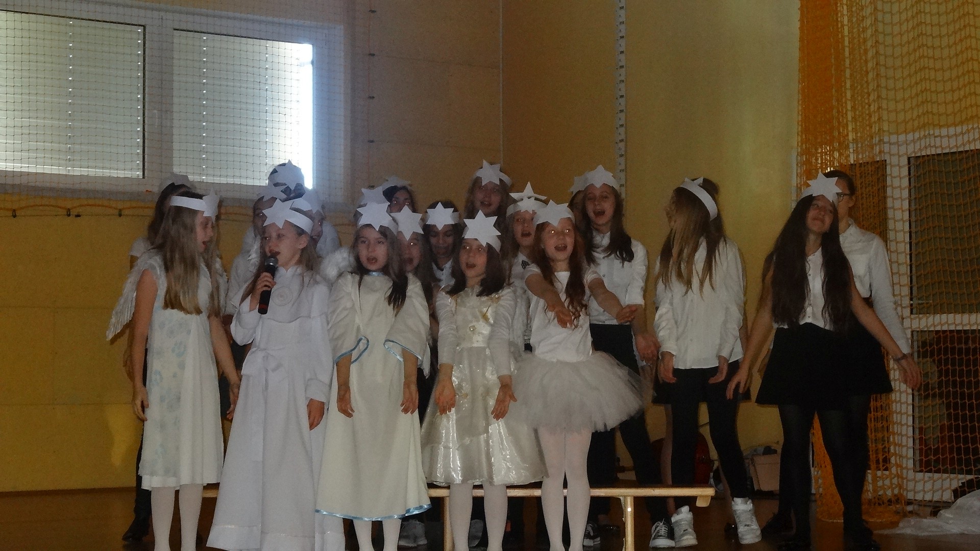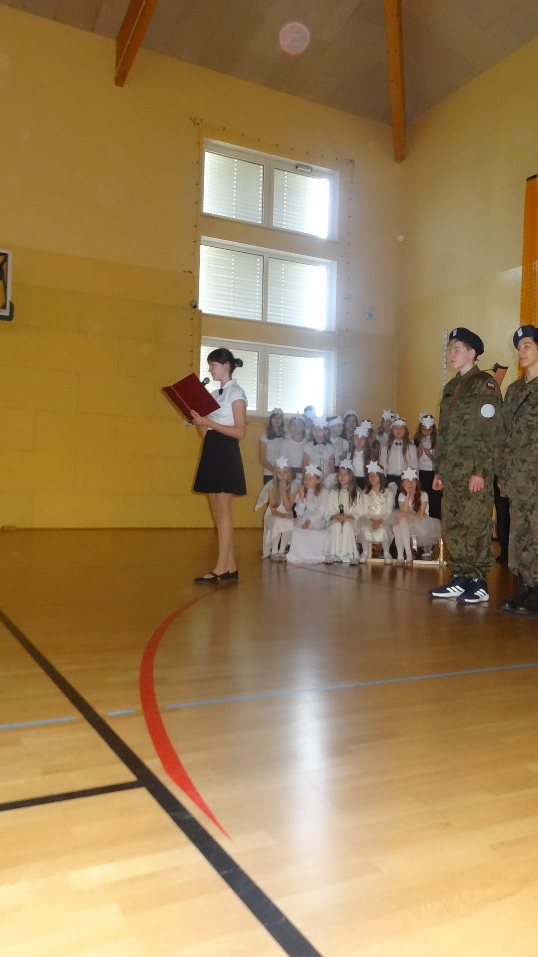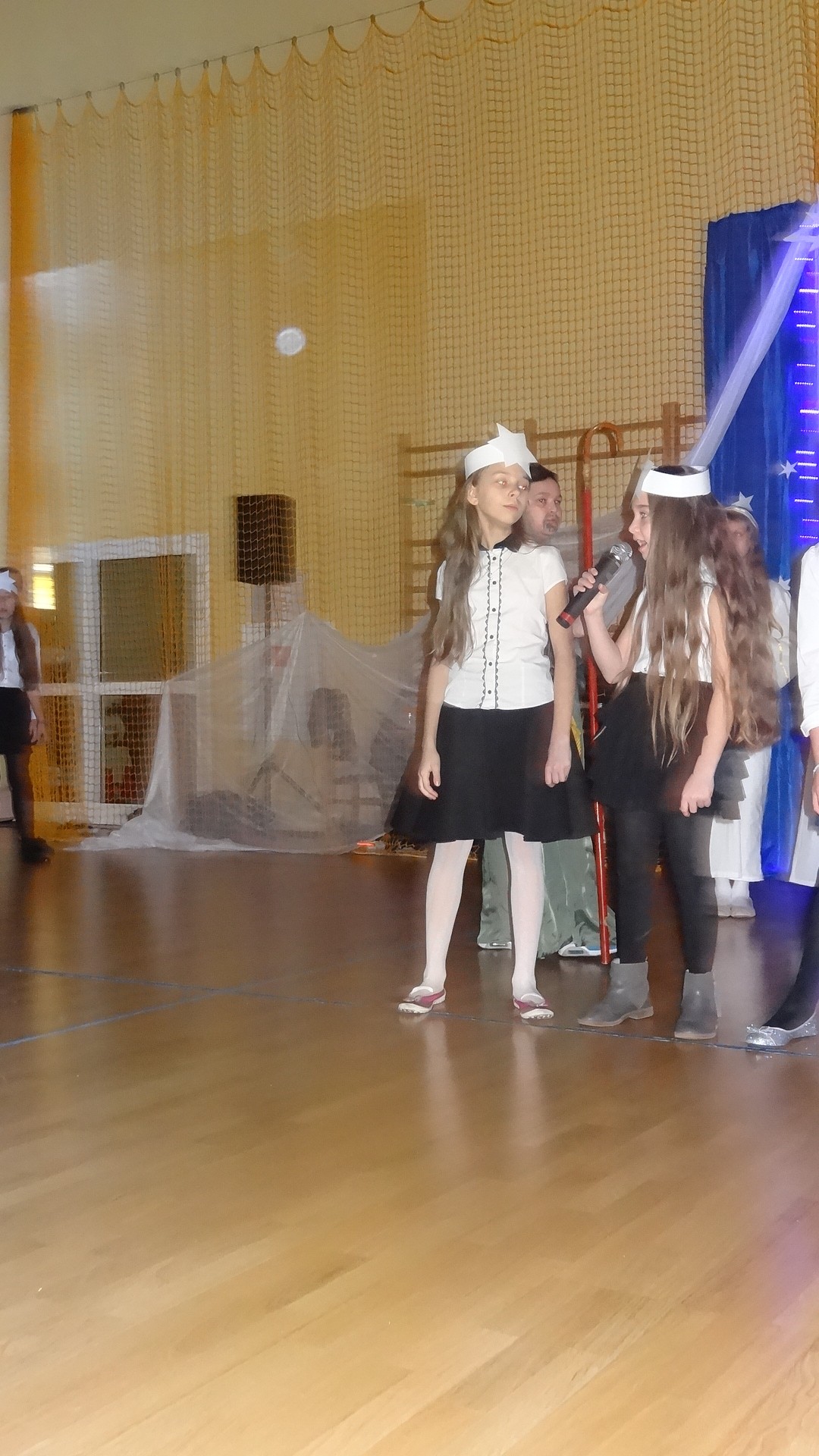 Po zebraniu się na hali gimnastycznej, Weronika Dziamara pięknie zagrała kolędę ,,Cicha noc na wiolonczeli. Następnie na scenę wyszedł anioł i ślicznie zaśpiewał pastorałkę. Później zobaczyliśmy niebiańską istotę przemawiającą do zgromadzonych. Ujrzeliśmy zmęczoną Maryję wraz z Józefem, którzy szukali noclegu, a ponieważ nigdzie go nie znaleźli, zatrzymali się w zubożałej stajence. Niedługo po tym, Matka kołysała już malutkiego Jezuska w swych ramionach pośród milczących aniołków. Jako pierwsi do szopy przybyli pastuszkowie, a po nich przybiegli weseli górale, zatańczyli charakterystyczny taniec z ciupagami oraz zaśpiewali. Do Świętej Rodziny zmierzali również szewcy i szwaczki, aby podarować trzewiki. Następnie ujrzeliśmy trzech królów, którzy nieśli skarby - kadzidło, mirrę oraz złoto. Po chwili na scenie pojawili się żołnierze. Uczennica klasy VIe - Klaudia Michalak, przeczytała wiersz o Bożym Narodzeniu, a Agata Drabina odmówiła ,,Modlitwę za Ojczyznę. Narrator złożył wszystkim życzenia. Cały występ pełen był kolęd oraz pastorałek. Śpiewaliśmy m. in. ,, Cichą noc, ,,Przybieżeli do Betlejem, ,,Wśród nocnej ciszy. Całe przedstawienie urok zawdzięczało również przepięknej scenerii. Białe lampeczki i gwiazdki przenosiły nas w niebiański świat, a błękitne tkaniny sprawiały wrażenie pobytu w mistycznym miejscu. Niezwykłe kostiumy zabierały zgromadzonych do Betlejem, abyśmy mogli ujrzeć cud, który zdarzył się przed wiekami, a nadal jest pamiętany i rozgłaszany.
