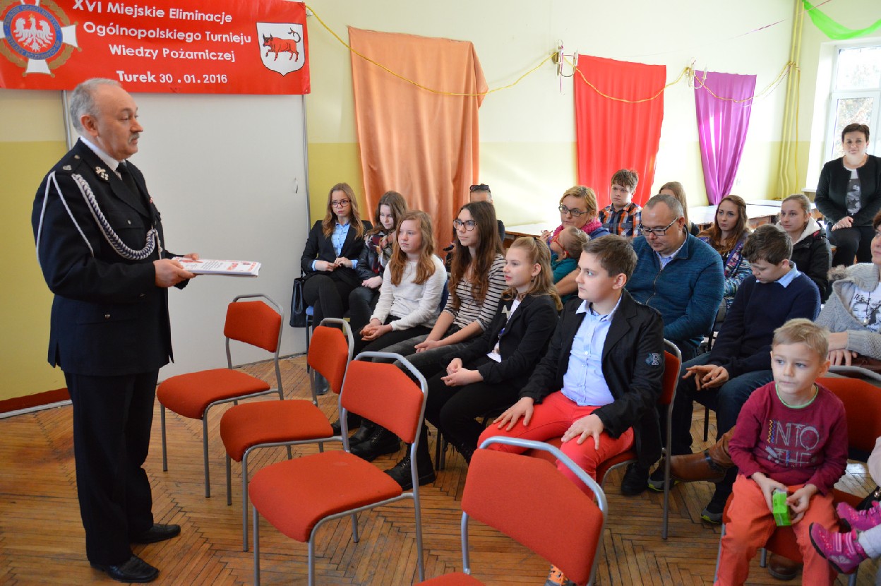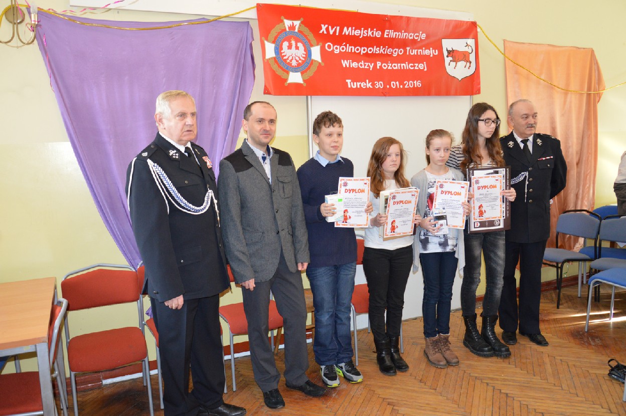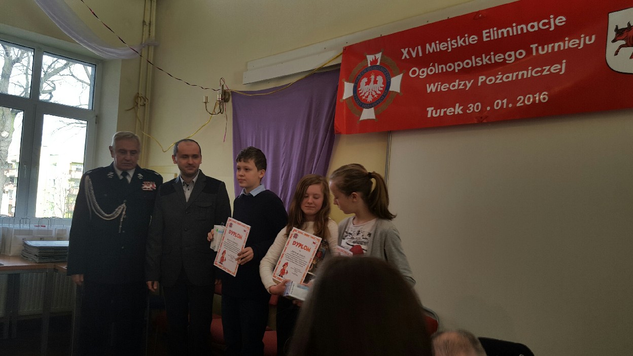 W dniu 30 stycznia 2016r. w siedzibie OSP w Turku odbyły się XVI miejskie eliminacje Ogólnopolskiego Turnieju Wiedzy Pożarniczej „Młodzież zapobiega pożarom”. Szkołę Podstawową Nr 1 reprezentował Wojciech Werbiński z klasy 6e, którego opiekunem jest pani Irena Dominiak. Uzyskał on najlepszy wynik w mieście w kategorii szkół podstawowych i tym samym zakwalifikował się do etapu powiatowego. Jest to turniej w którym należy wykazać się znajomością specjalistycznej wiedzy o pożarnictwie, dlatego tylko prawdziwi pasjonaci zajmują najwyżasze lokaty. Tym bardziej gratulujemy naszemu uczniowi i życzymy sukcesu w kolejnych etapach.