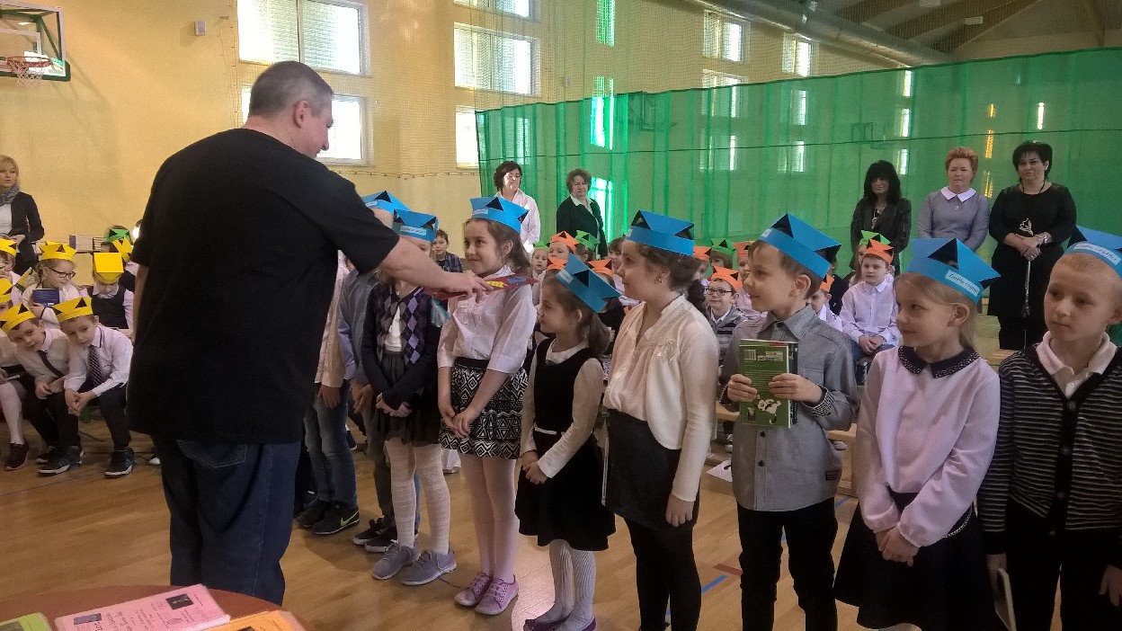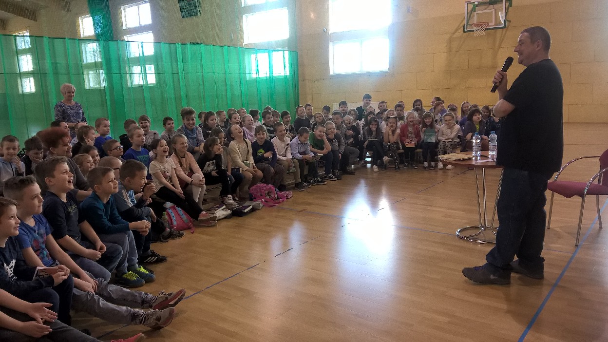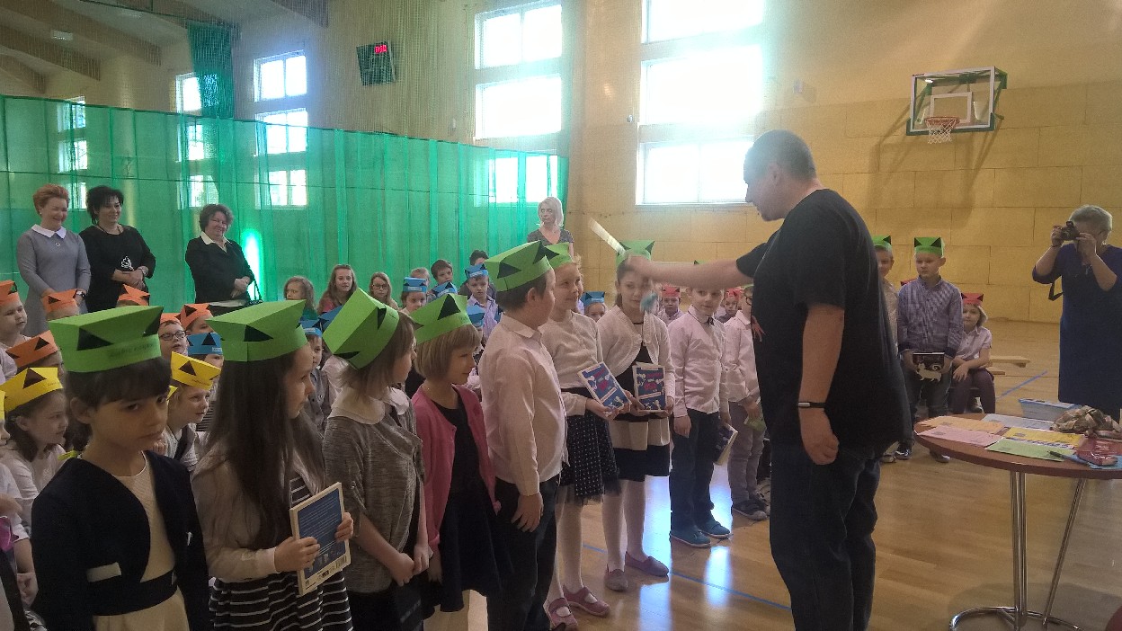 Wizyta specjalnego gościa była niesamowitym przeżyciem dla uczniów klas I, którzy zostali Pasowani na Czytelnika biblioteki szkolnej przez samego Marcina Pałasza. Ten wyjątkowy pisarz, obdarzony ogromnym poczuciem humoru i znajomością dziecięcej psychiki sprawił, że wszyscy zachłannie słuchali jego opowieści, wybuchając co chwilę serdecznym śmiechem.