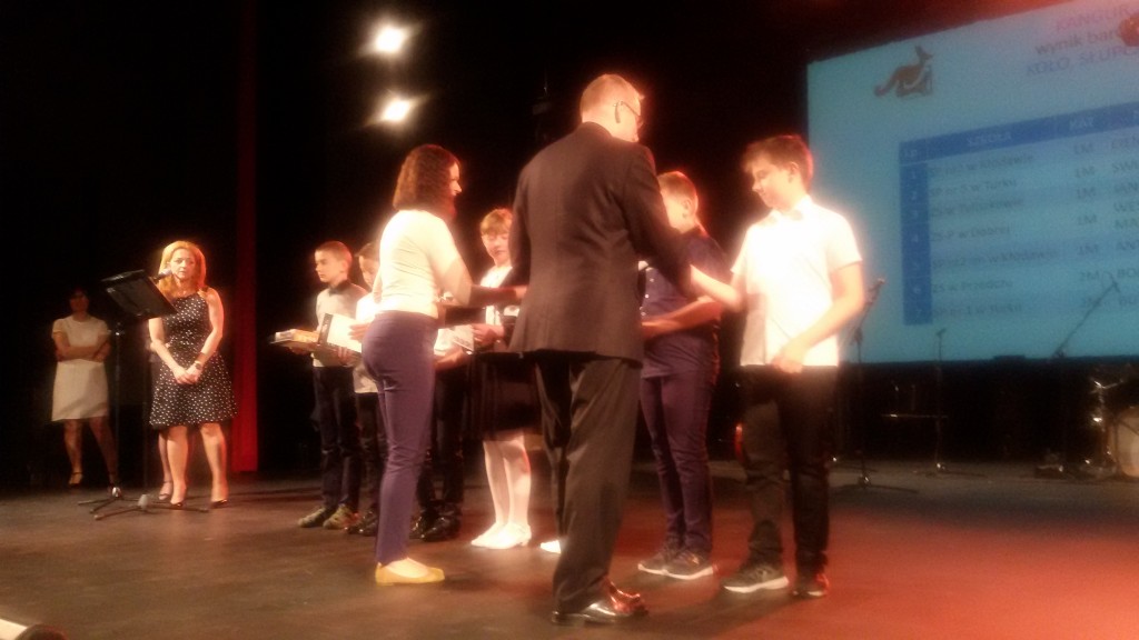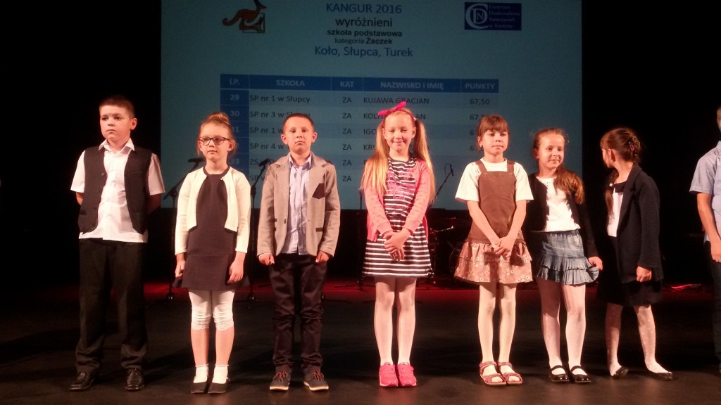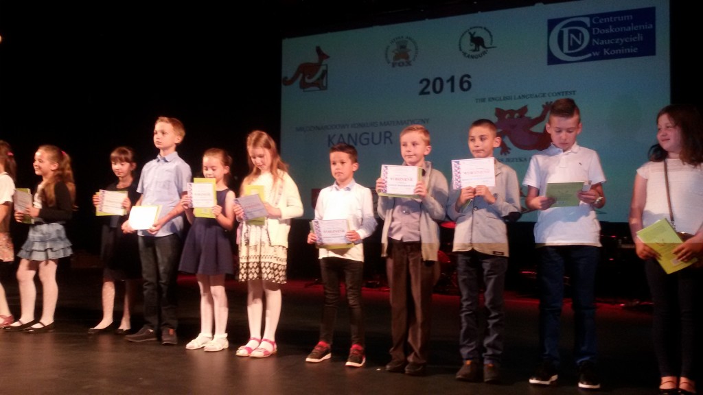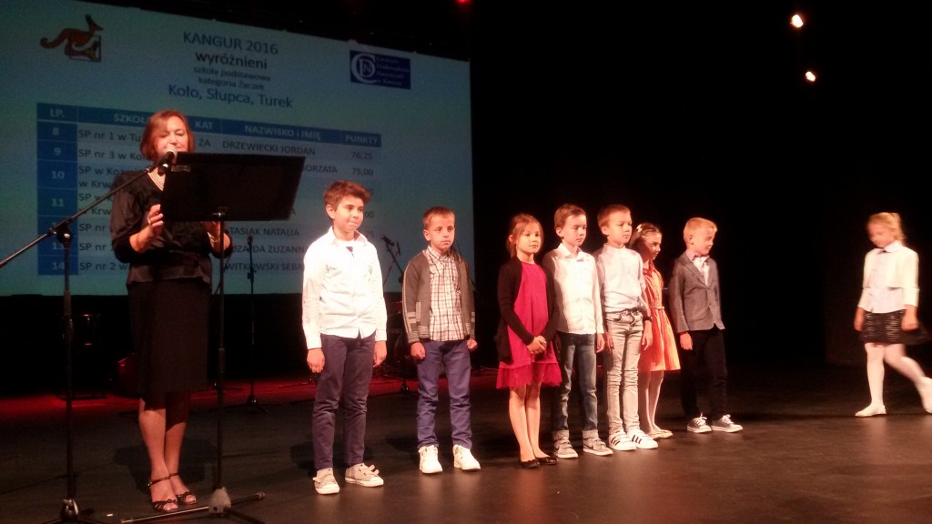 Wszyscy wiemy, że w naszej szkole jest bardzo dużo dzieci uzdolnionych matematycznie.Potwierdzeniem tego są nagrody zdobywane corocznie w różnego rodzaju konkursach matematycznych. Szczególnym konkursem jest Międzynarodowy Konkurs Matematyczny KANGUR. Szczególny, bo jest nietypowy i trudny. Każdego roku mamy kilkunastu nagrodzonych uczniów z klas 2 – 6. Jak trudne są zadania Kangura wiedzą dokładnie dzieci biorące udział w konkursie oraz nauczyciele przygotowujący dzieci. Zadania wymagają talentu, logicznego myślenia oraz dużo pracy i dobrego przygotowania, gdyż są zupełnie inne od tych rozwiązywanych na lekcjach matematyki. Potwierdzeniem prestiżu i wyjątkowości Kangura jest również odbywająca się w Koninie uroczystość wręczania nagród, przebiegająca w niezwykłej oprawie artystycznej. Tak było i w tym roku. 13 czerwca zwycięzcy odbierali dyplomy i nagrody z rąk konińskiego koordynatora konkursu Kangur. Miłym i ważnym momentem uroczystości było podkreślenie przez prowadzących , że w tym roku zdecydowanie triumfuje SP 1 z Turku. Mieliśmy bowiem aż 20 nagrodzonych uczniów. Oto oni: Klasy drugie – wyróżnienia – 2b: W. Zygoń, J. Drzewiecki, P.Potyralski, I. Stasiak, 2 d: N. Sidorowicz, 2 e: P. Majewski. Klasy trzecie – wyróżnienia – 3b: M. Adamski, 3c: N. Misiek. Klasy czwarte – bardzo dobry – 4 b: M. Buda, - wyróżnienia - 4b: J. Paszak, 4d: M. Ryczyński, Sz. Kurzawa. Klasy piąte – laureat – 5d: A.Białas, -wyróżnienia - 5d: N. Kałużna, Z. Skiba, A. Kukuła, N. Grabara, M. Rosiak, 5b: F.Staszak, 5c: M. Biskup. Nauczycielki, które przygotowały dzieci to panie: A.Koszykowska: 5b, 5c, 4d, A. Majtka: 5d, W. Trocha: 4b, E. Frasunkiewicz: 2e, I.Ochota: 2d, L. Pasturek: 2b, D. Hynas: 3b, A. Perlińska: 3c.
