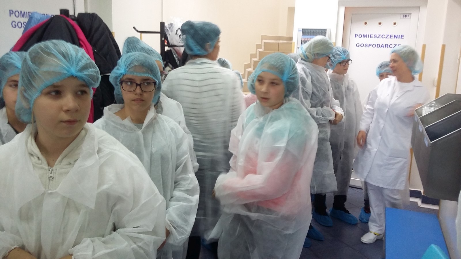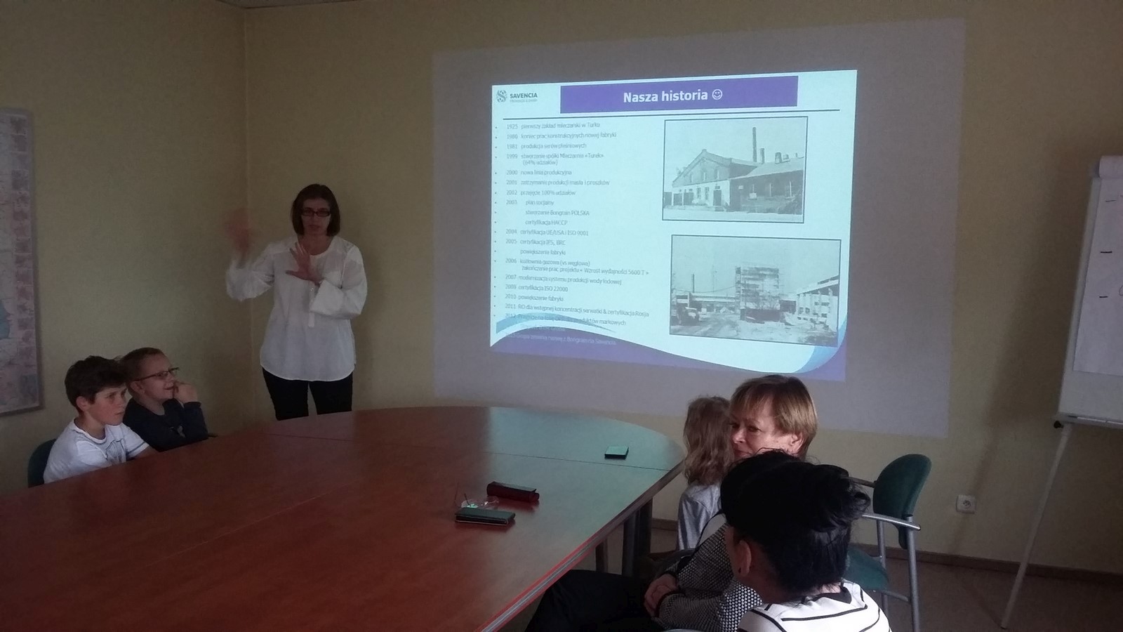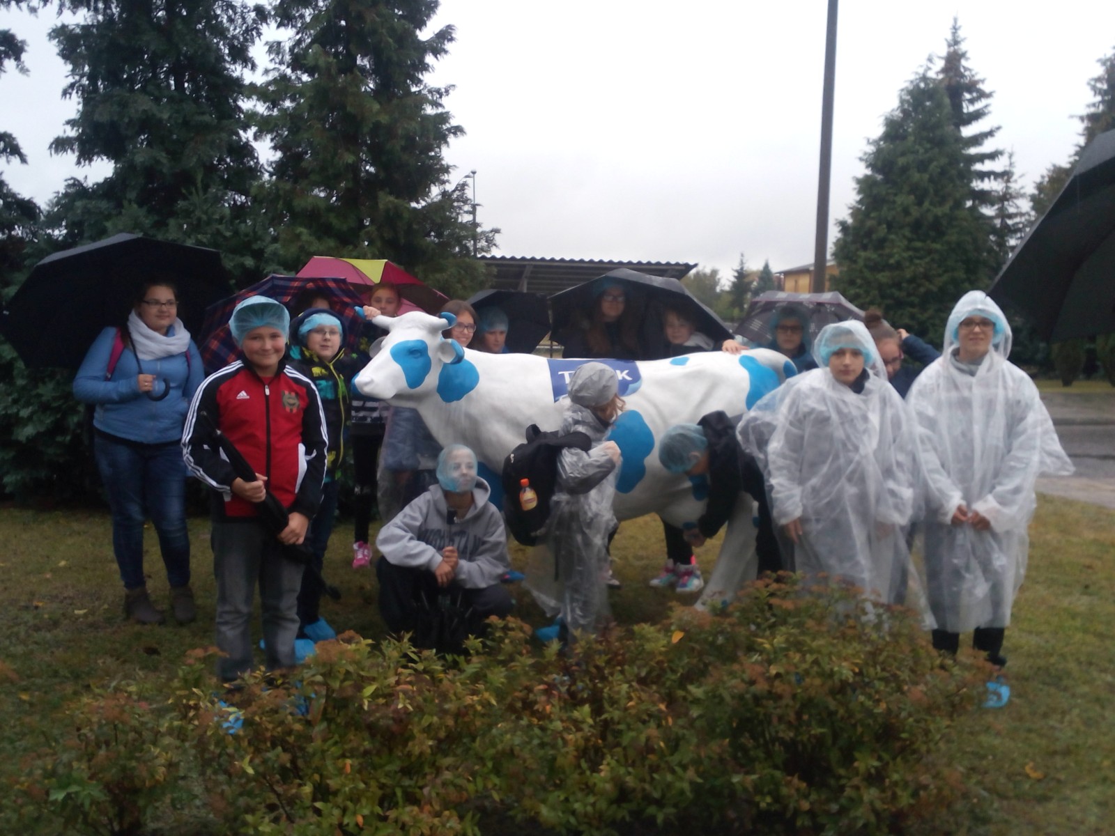 Spotkaliśmy się wszyscy przed szkołą o godzinie 11:25 i wyruszyliśmy na wyprawę. Padało, na szczęście mieliśmy parasole oraz płaszcze przeciwdeszczowe. Dotarliśmy do budynku, zdjęliśmy kurtki, a jedna z pracowniczek zaprowadziła nas do sali. W pokoju stał ogromny stół, przy którym usiedliśmy. Przedstawiciele firmy opowiedzieli nam o produkcji sera i osobach przy niej pracujących. Poznaliśmy historię zakładu. Zobaczyliśmy, w jaki sposób są wykonane opakowania. Dowiedzieliśmy się również, kto zarządza całą mleczarnią i poszczególnymi działami oraz jak i skąd dostarczane jest mleko. Następnie przeszliśmy do budynku, gdzie są wyrabiane sery. Musieliśmy ubrać specjalne czepki, płaszcze i osłony na buty, ponieważ zakład przywiązuje dużą wagę do czystości. Weszliśmy na korytarz, z którego mogliśmy obejrzeć produkcję. Pożegnaliśmy się z pracownikami i wróciliśmy do szkoły.