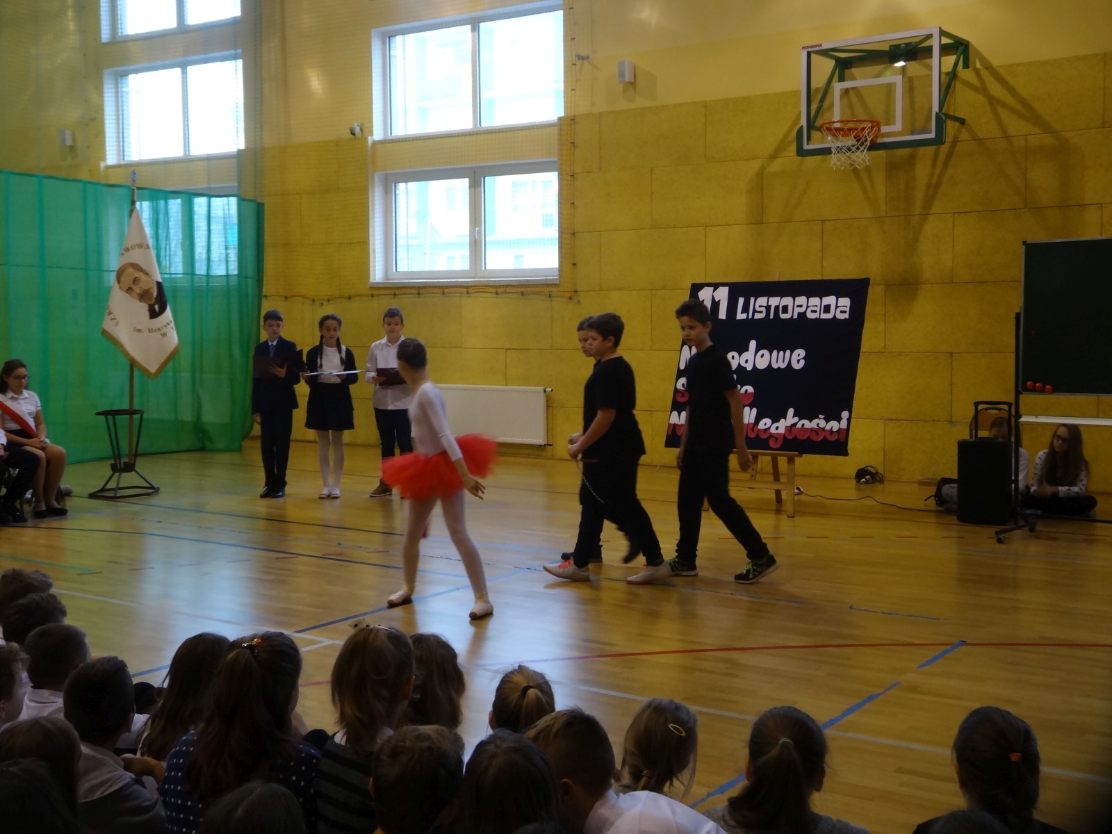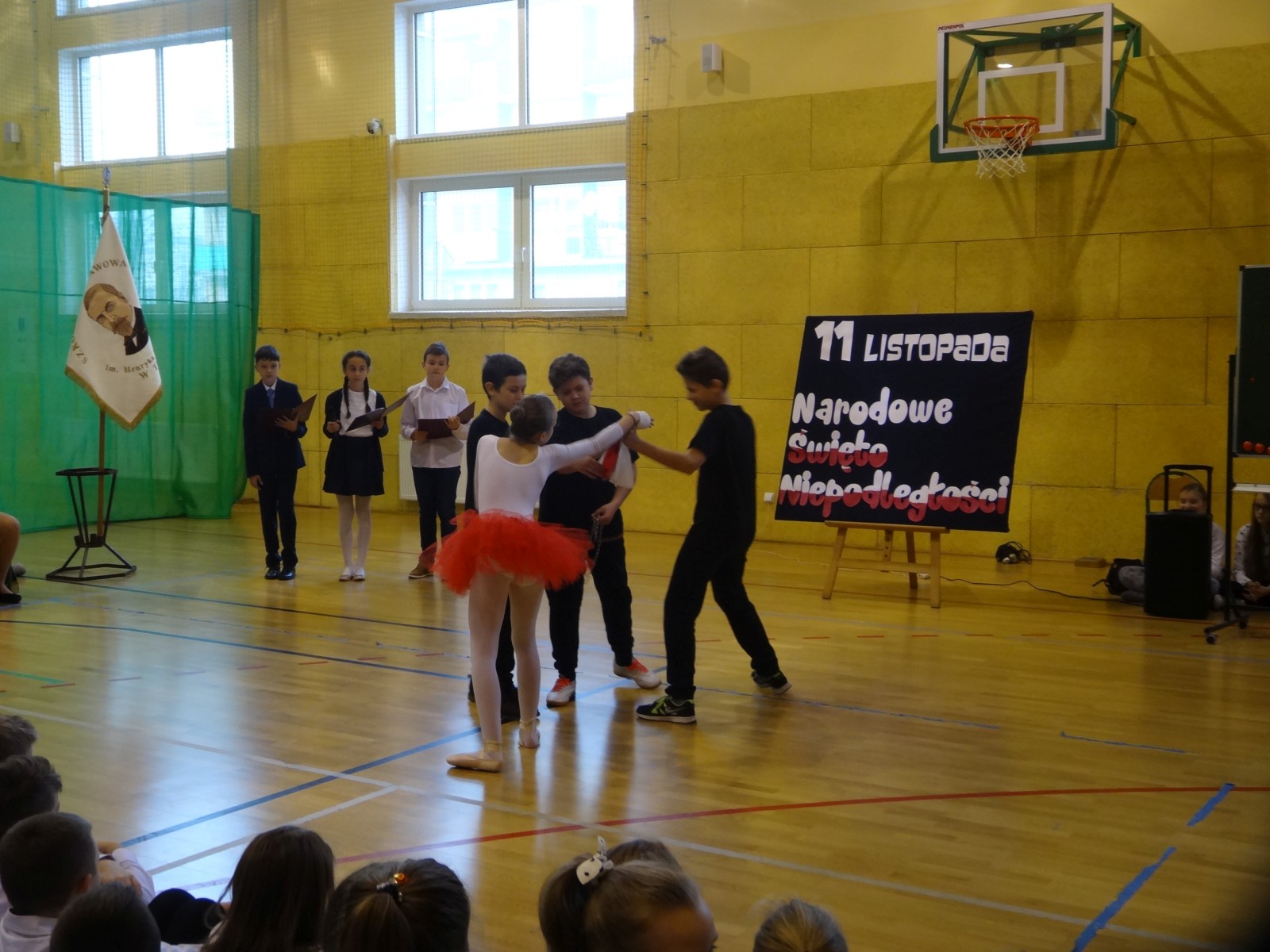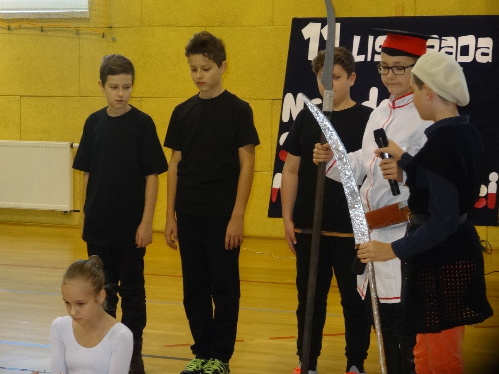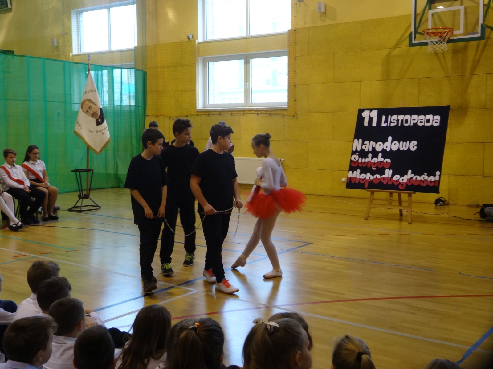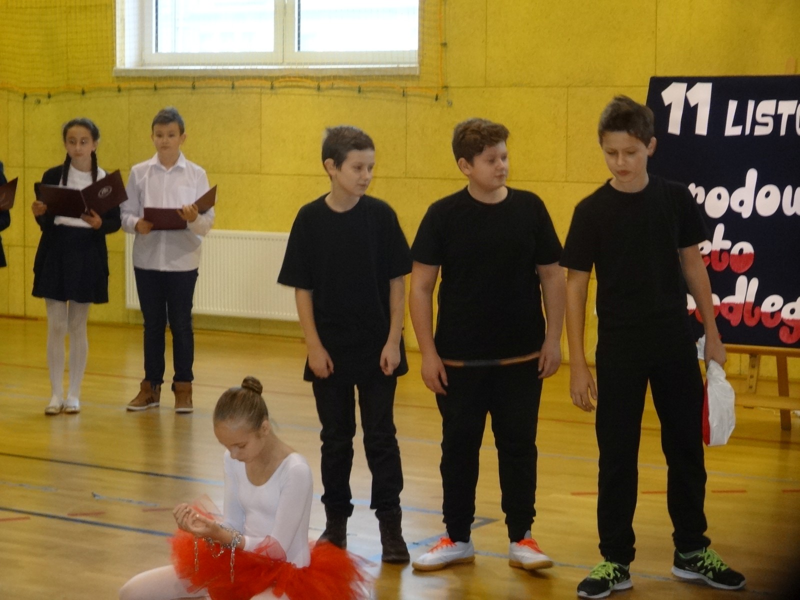 Na scenie można było zobaczyć upersonifikowaną Polskę. W tę rolę wcieliła się jedna z uczennic naszej szkoły Oliwia Bartosik. Głównym punktem przedstawienia był taniec klasyczny(balet) w wykonaniu tej uczennicy. Uczniowie odgrywali także rolę kosynierów i zaborców. W całym przedstawieniu nie zabrakło wierszy i popularnych pieśni patriotycznych.Apel miał uświadomić uczniom, jak ważnym i upragnionym przez naszych przodków wydarzeniem było odzyskanie przez Polskę niepodległości. Dzień 11 listopada stał się dla nas symbolem miłości do ojczyzny, walki o wolność, symbolem wiary i zwycięstwa.Apel przygotowali uczniowie klas VIc i kółka historycznego pod okiem nauczycielek p. Małgorzaty Pakuły i p. Bożeny Mielczarek.