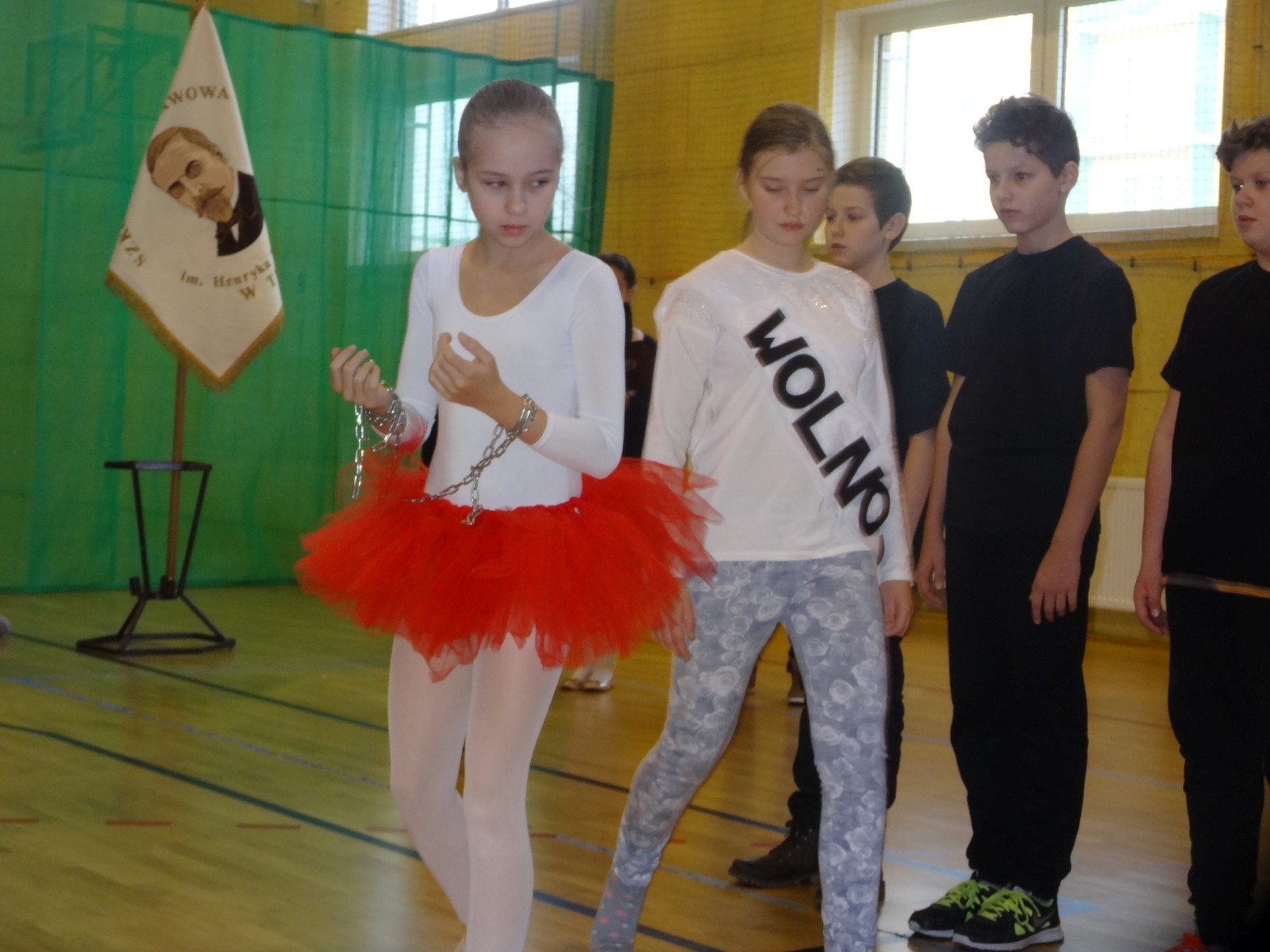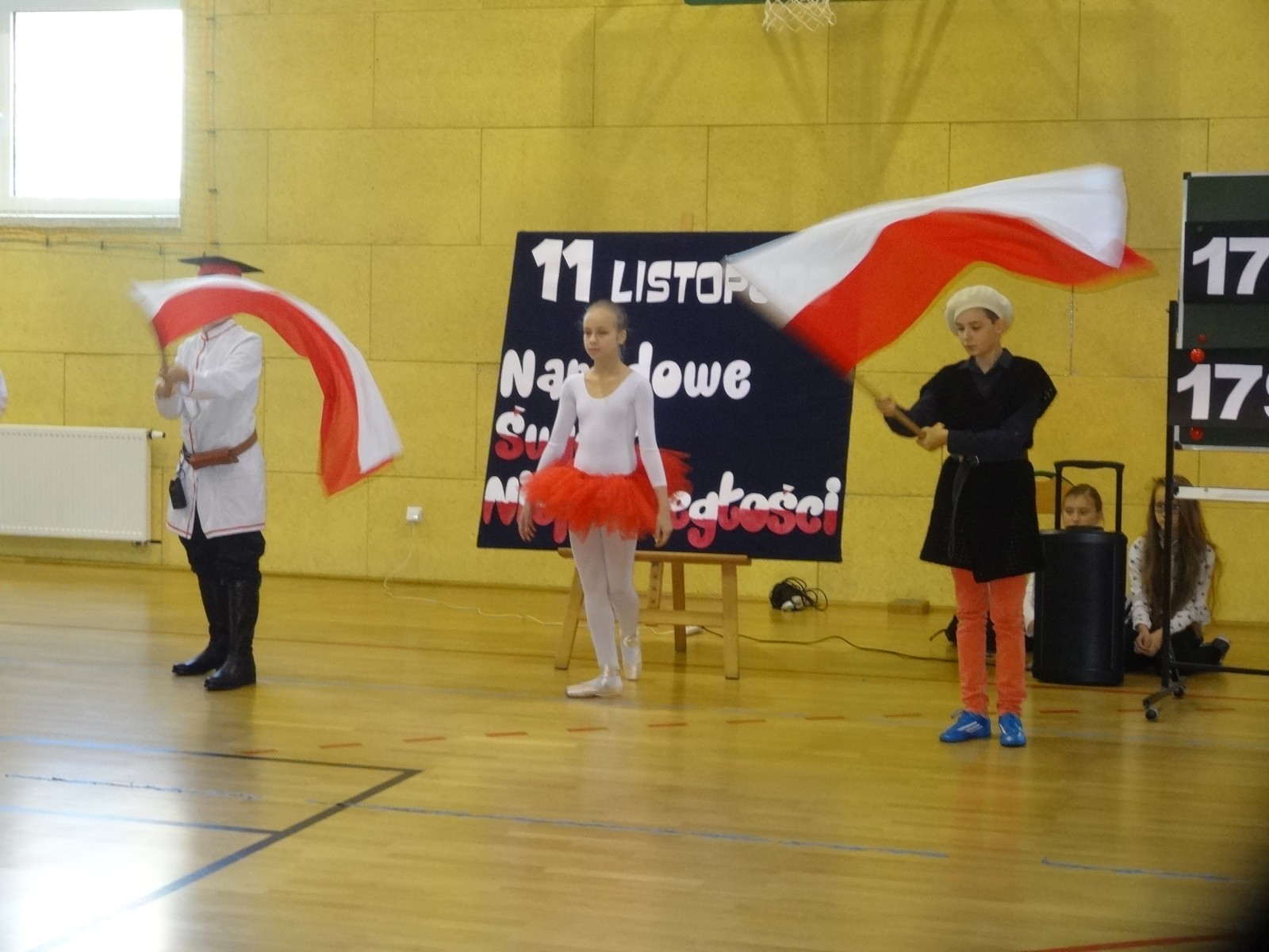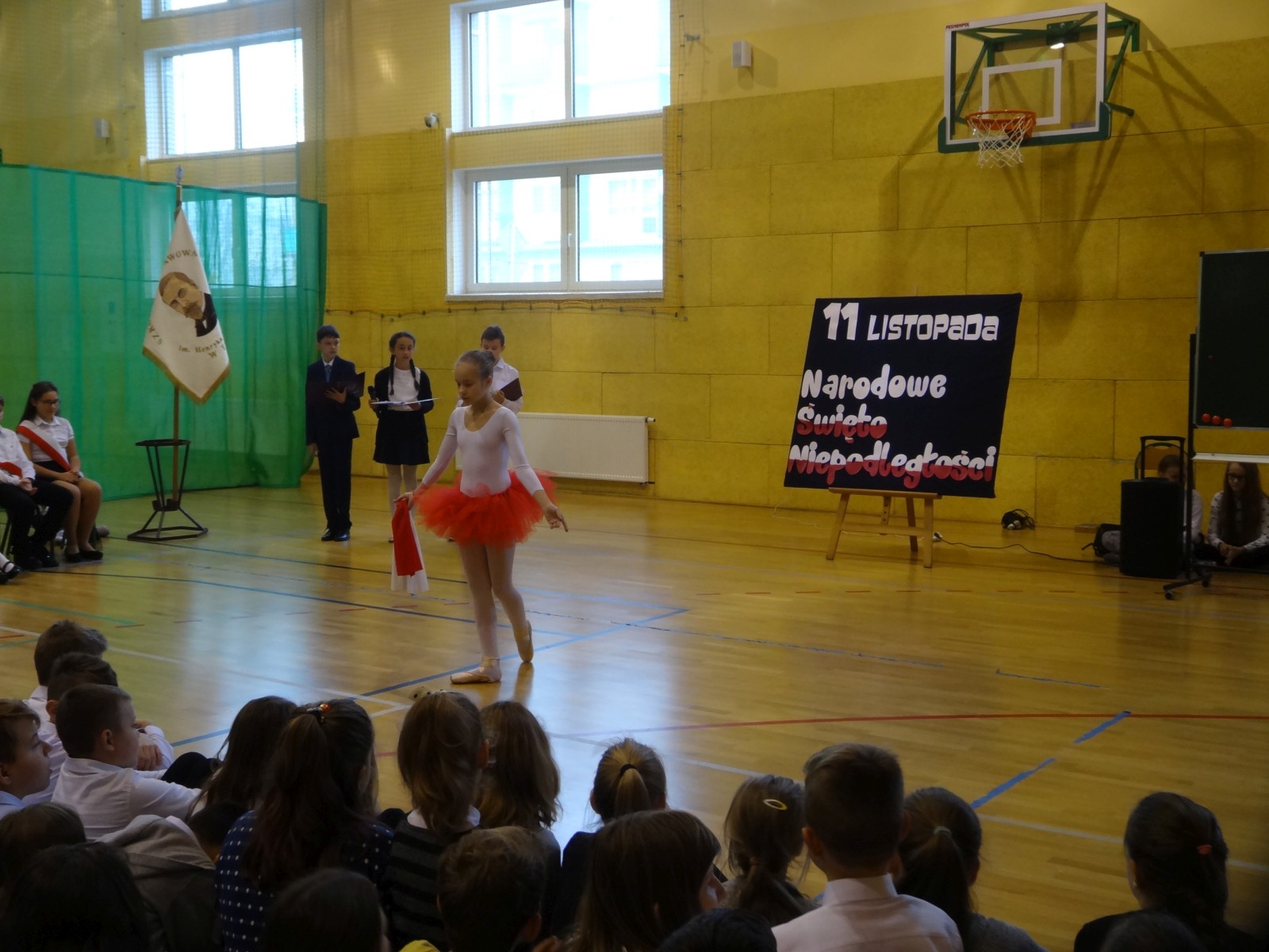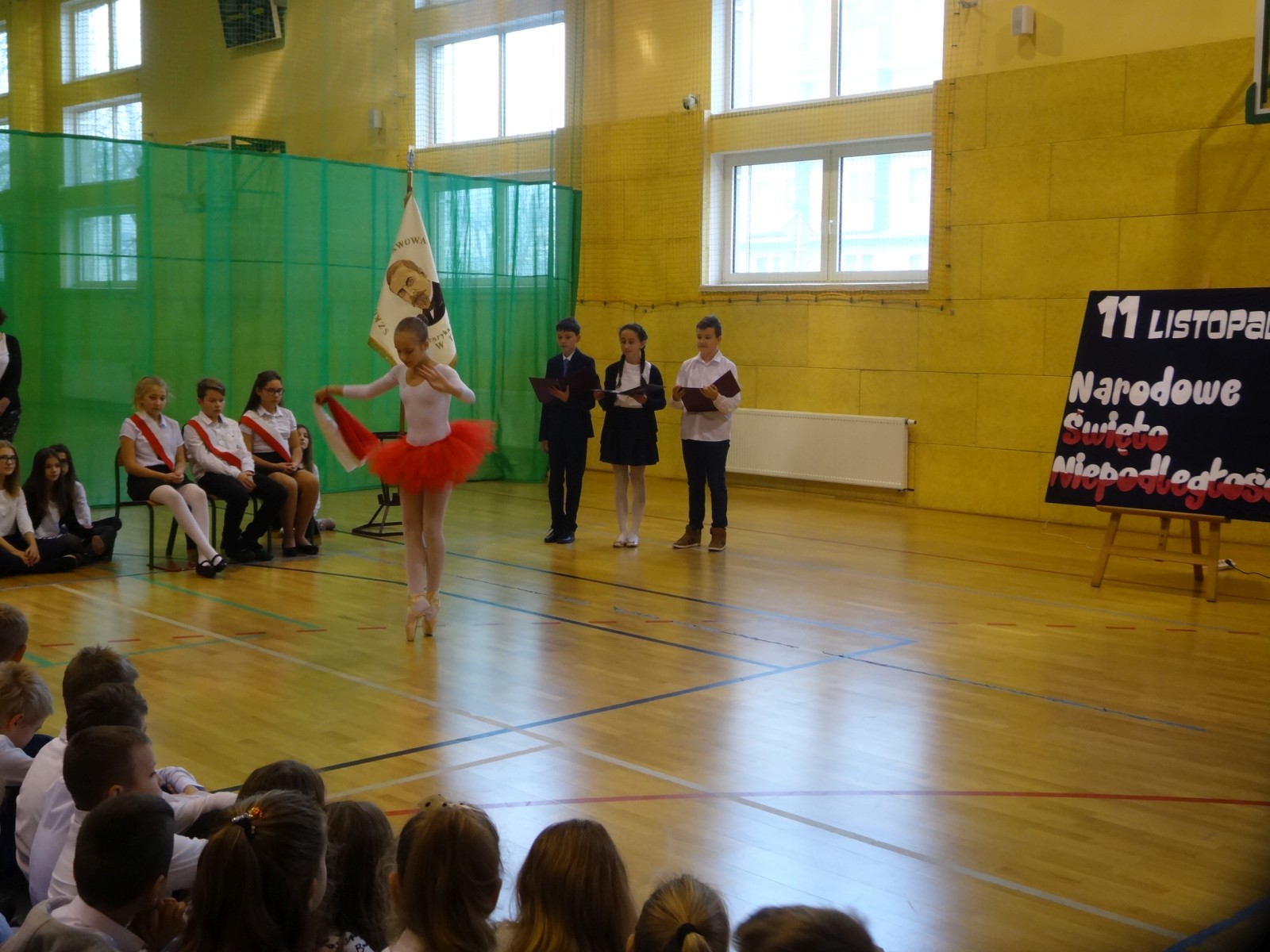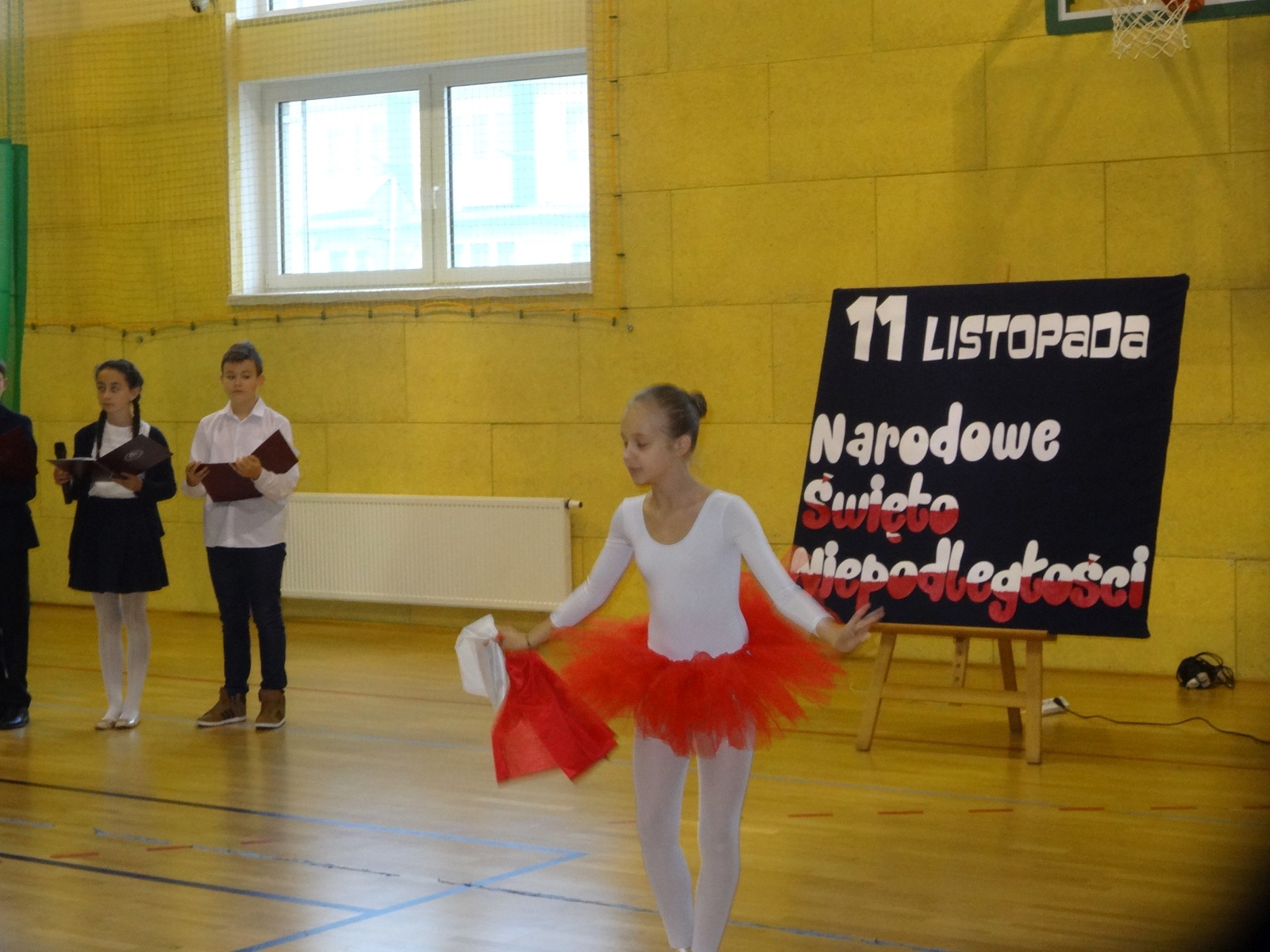 Na scenie można było zobaczyć upersonifikowaną Polskę. W tę rolę wcieliła się jedna z uczennic naszej szkoły Oliwia Bartosik. Głównym punktem przedstawienia był taniec klasyczny(balet) w wykonaniu tej uczennicy. Uczniowie odgrywali także rolę kosynierów i zaborców. W całym przedstawieniu nie zabrakło wierszy i popularnych pieśni patriotycznych.Apel miał uświadomić uczniom, jak ważnym i upragnionym przez naszych przodków wydarzeniem było odzyskanie przez Polskę niepodległości. Dzień 11 listopada stał się dla nas symbolem miłości do ojczyzny, walki o wolność, symbolem wiary i zwycięstwa.Apel przygotowali uczniowie klas VIc i kółka historycznego pod okiem nauczycielek p. Małgorzaty Pakuły i p. Bożeny Mielczarek.