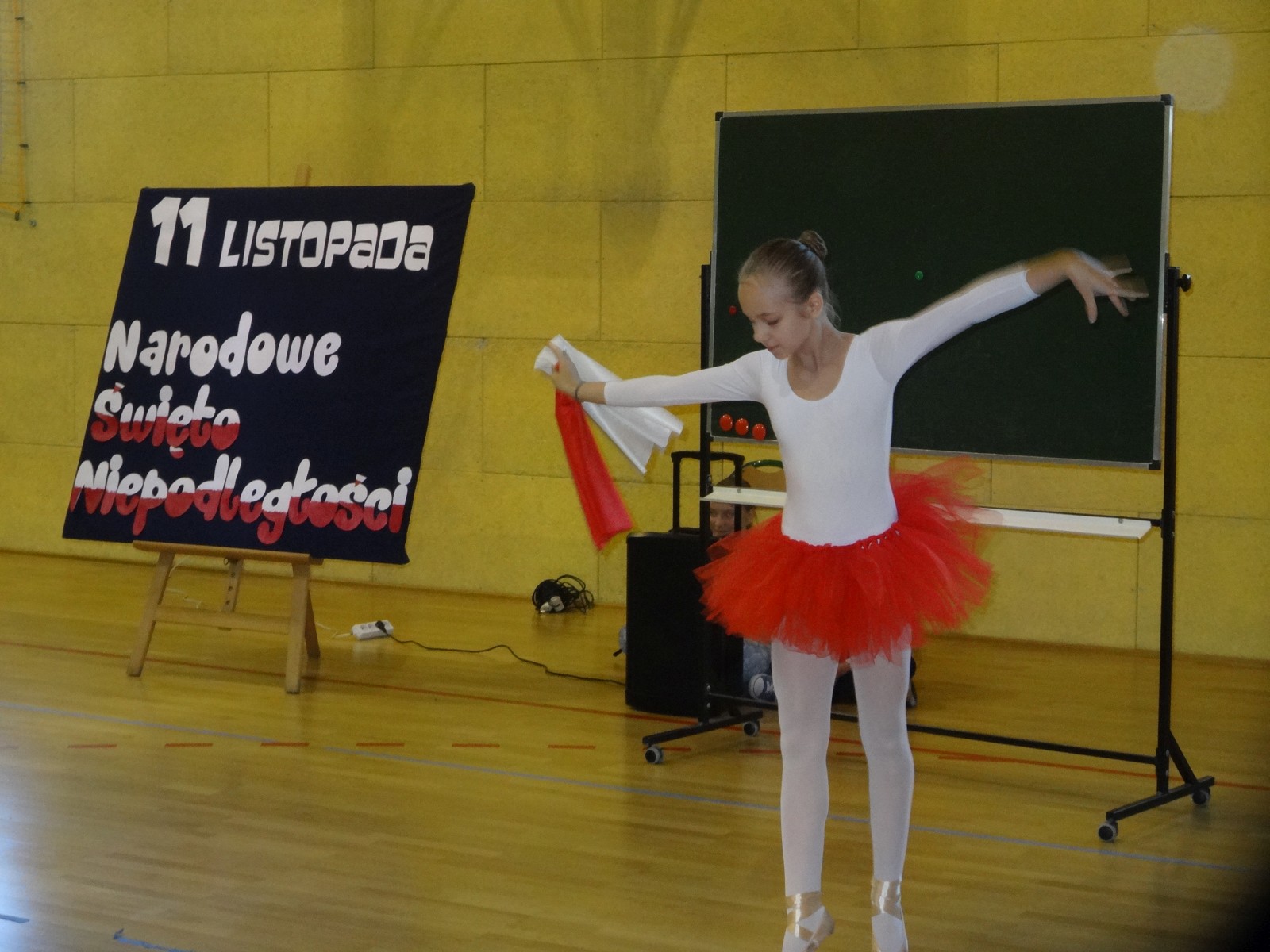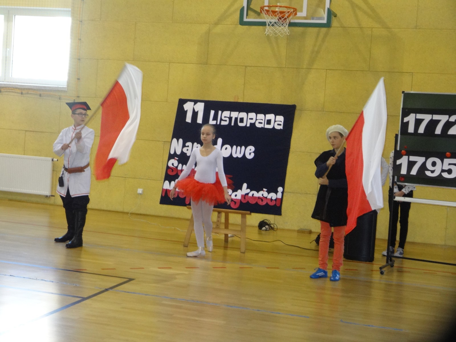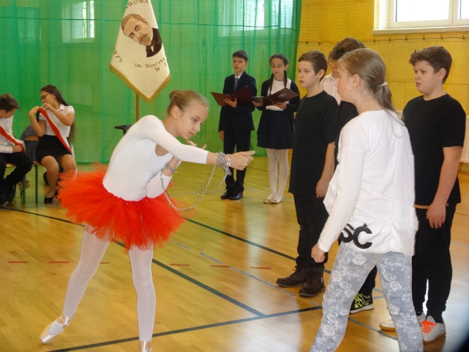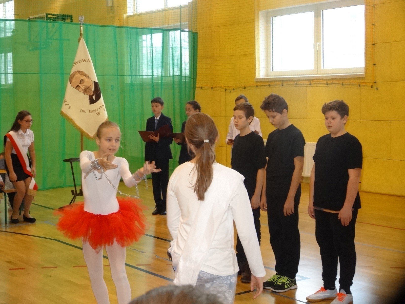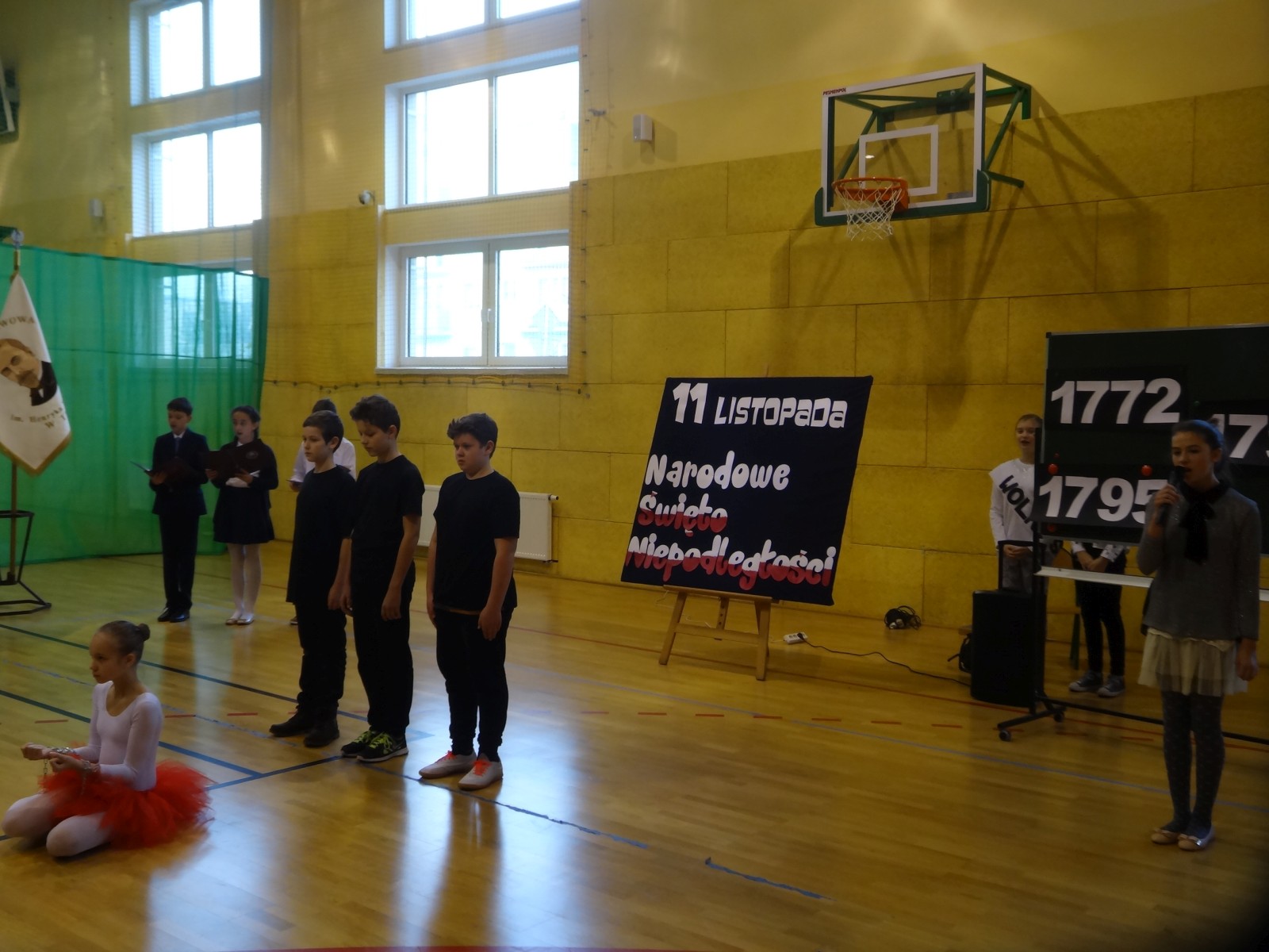 Na scenie można było zobaczyć upersonifikowaną Polskę. W tę rolę wcieliła się jedna z uczennic naszej szkoły Oliwia Bartosik. Głównym punktem przedstawienia był taniec klasyczny(balet) w wykonaniu tej uczennicy. Uczniowie odgrywali także rolę kosynierów i zaborców. W całym przedstawieniu nie zabrakło wierszy i popularnych pieśni patriotycznych.Apel miał uświadomić uczniom, jak ważnym i upragnionym przez naszych przodków wydarzeniem było odzyskanie przez Polskę niepodległości. Dzień 11 listopada stał się dla nas symbolem miłości do ojczyzny, walki o wolność, symbolem wiary i zwycięstwa.Apel przygotowali uczniowie klas VIc i kółka historycznego pod okiem nauczycielek p. Małgorzaty Pakuły i p. Bożeny Mielczarek.