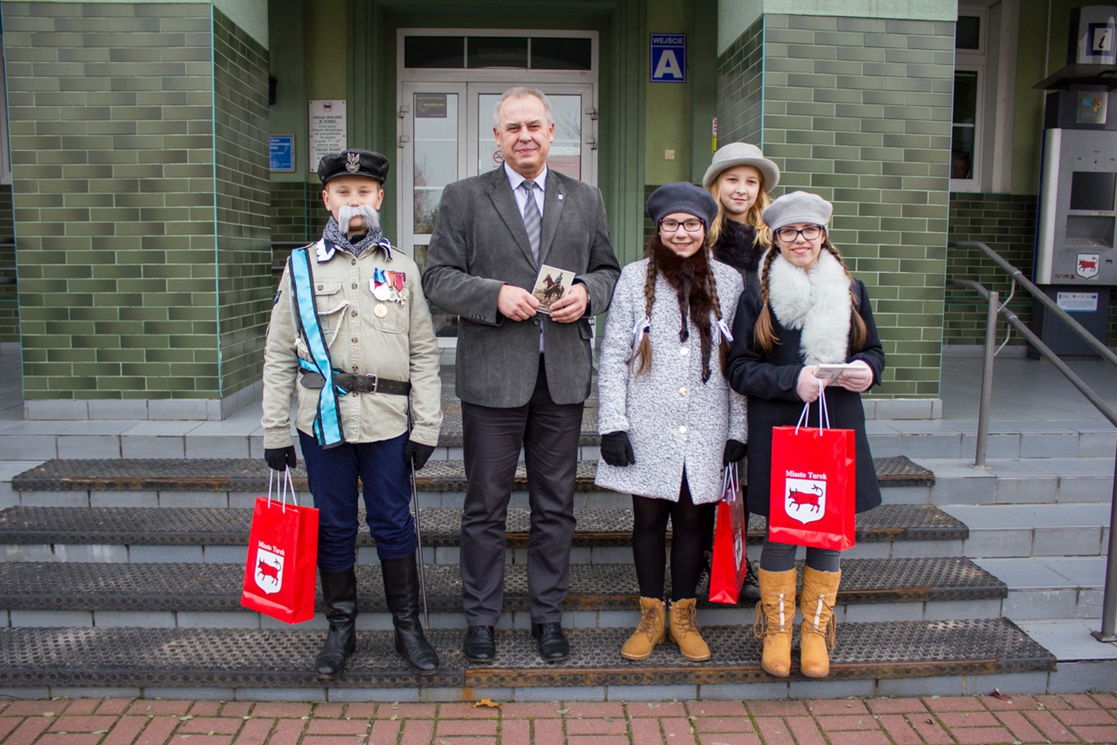 postaci historyczne marszałka Polski Józefa Piłsudskiego i jego rodzinę. Rolę Józefa Piłsudskiego zagrał Adam Białas, Aleksandry Piłsudskiej – Zuzia Skiba, córki Wandy – Michalina Rosiak, córki Jadwigi – Nina Grabara. Korzystają z uprzejmości p. Marcina Klinkiewicza – właściciela stadniny wybrali się bryczką na przejażdżkę po naszym mieście. Marszałek i jego rodzina pozdrawiali mieszkańców Turku z okazji 98 rocznicy odzyskania niepodległości przez Polskę. Rozdawali okolicznościowe pocztówki z podobizną Marszałka, życząc radosnego przeżywania święta. Uczniowie odwiedzili włodarza naszego miasta.