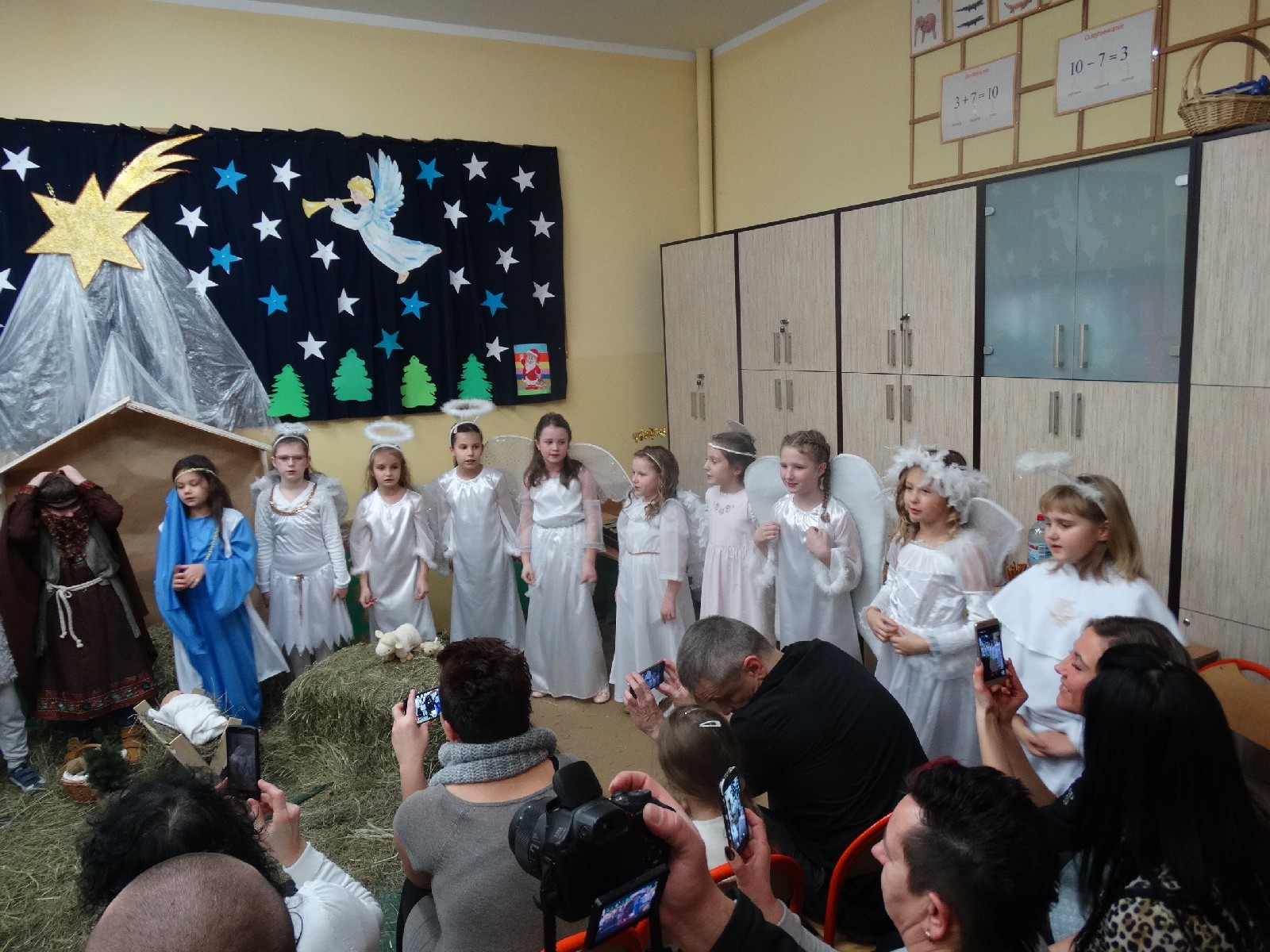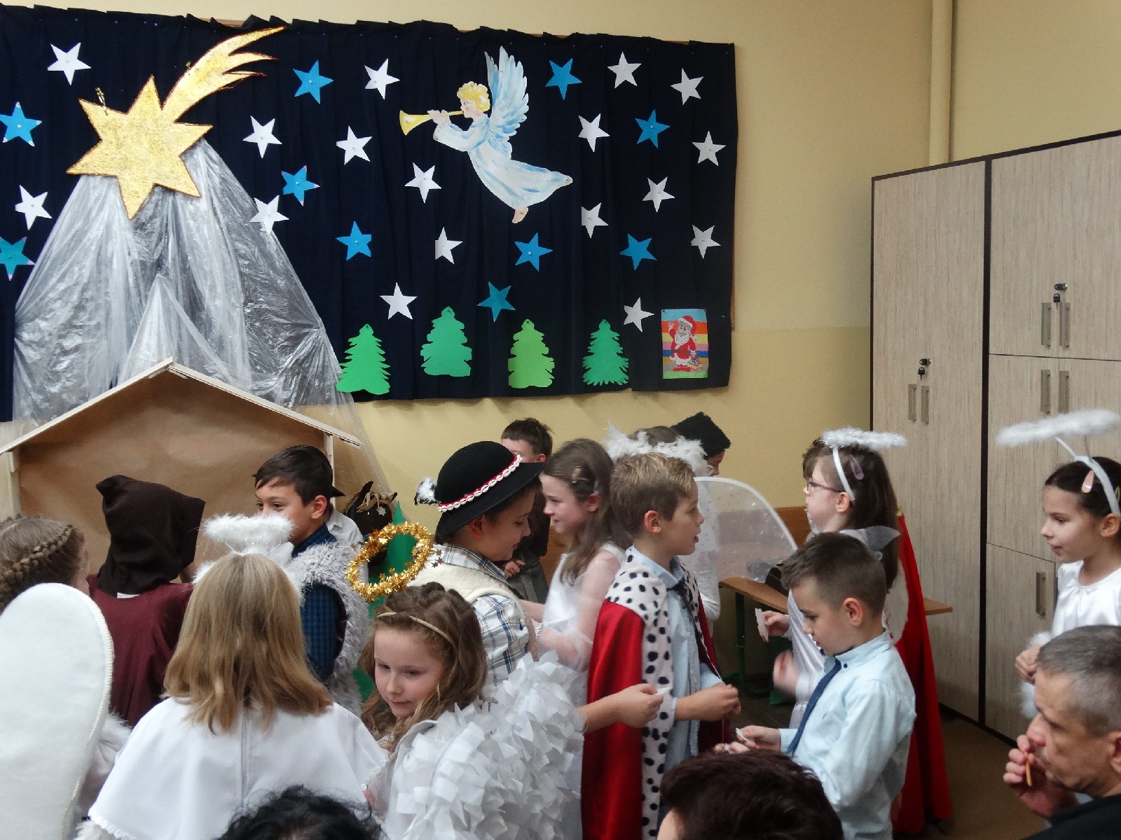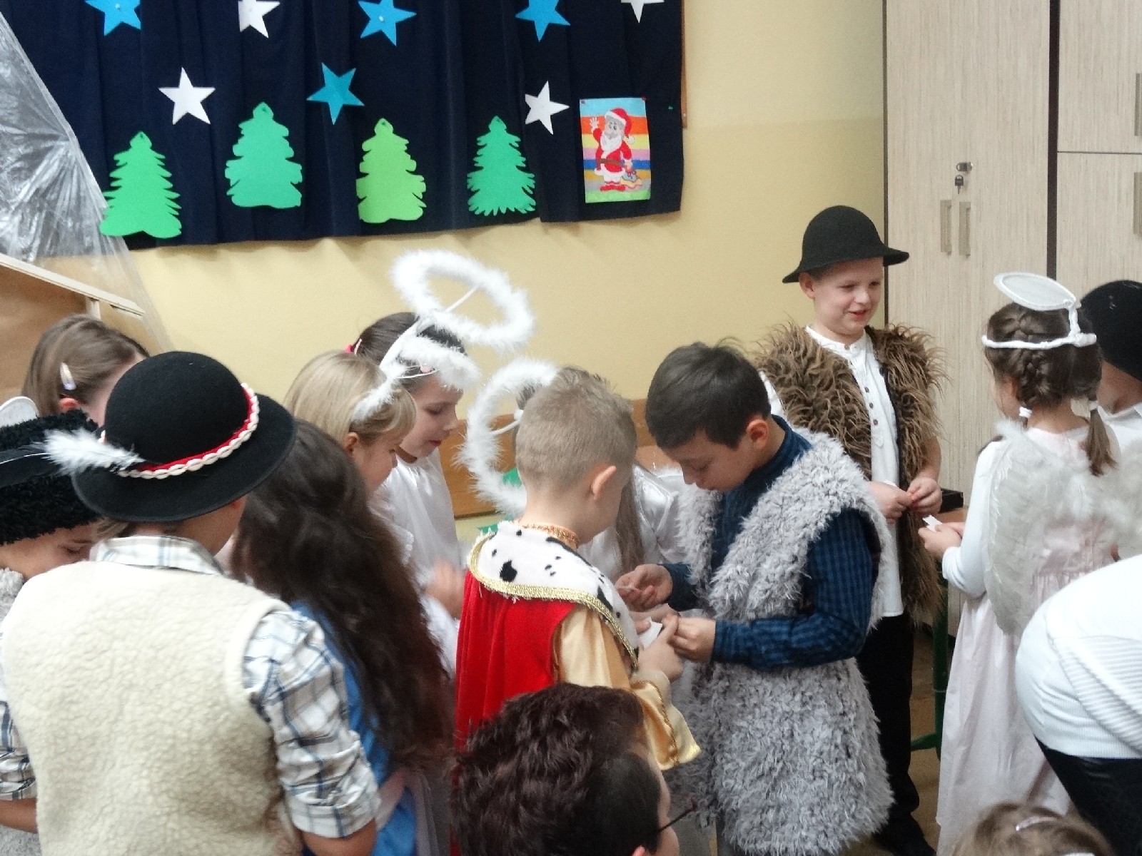 Święta Bożego Narodzenia to wyjątkowy okres w roku, na który długo czekają nie tylko dorośli, ale również dzieci. W piątek 16grudnia tradycyjnie, jak co roku odbyły się nasze klasowe Jasełka Bożonarodzeniowe. Przepiękna sceneria, nastrojowe kolędy, pastorałki i piosenki świątecznew wykonaniu dzieci stworzyły niepowtarzalny, radosny nastrój wprowadzający w atmosferę Świąt Bożego Narodzenia.Dzieci w specjalnie przygotowanych strojach z dużym zaangażowaniem i przejęciem odtwarzały swoje role. Po raz kolejny mogliśmy przeżyć historię narodzin Jezusa.Był św. Józef, Maryja, aniołowie,pasterze ze swoimi darami oraz Trzej Królowie, którzy oddali hołd małemu dzieciątku. Rodzicom występ bardzo się podobał, o czym świadczyły gromkie brawa. Na koniec zgodnie z tradycją były świąteczne życzenia i słodki poczęstunek.