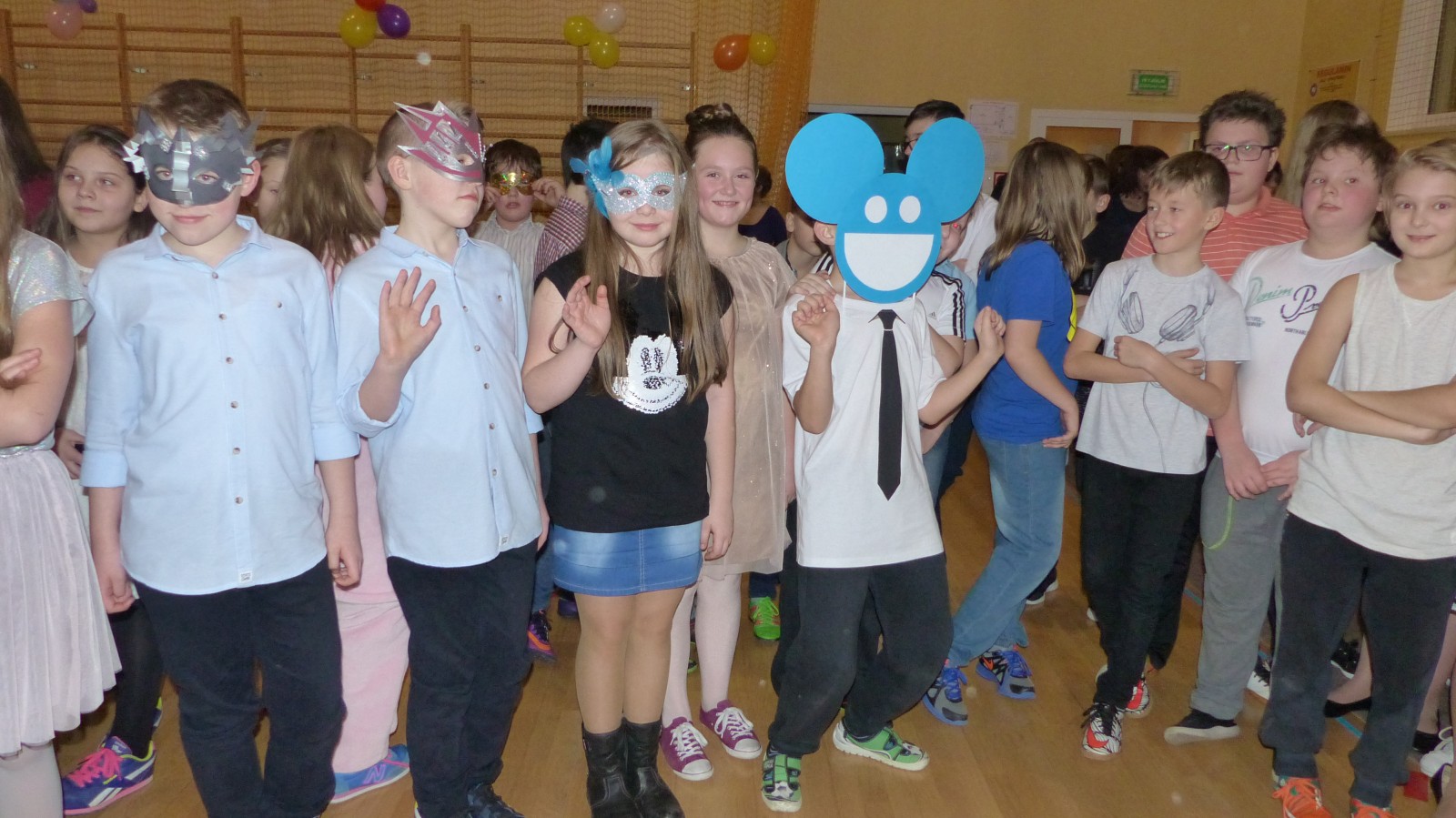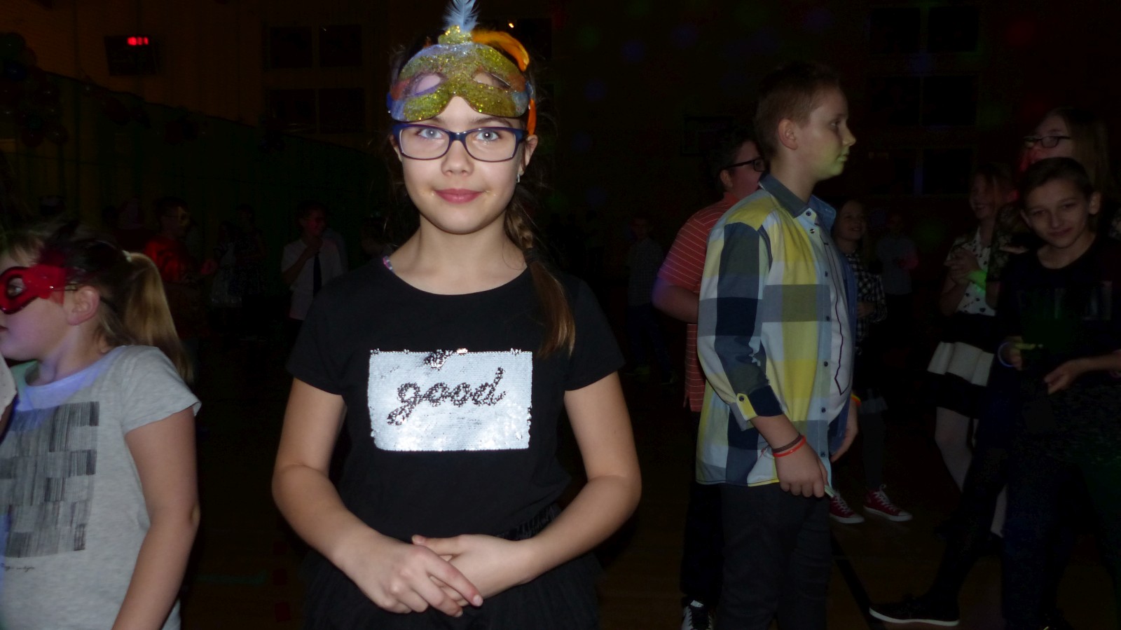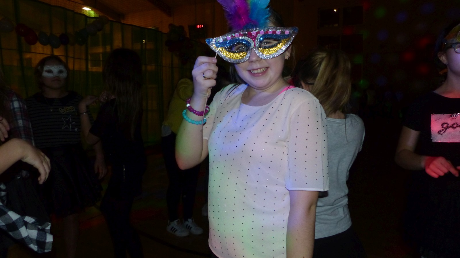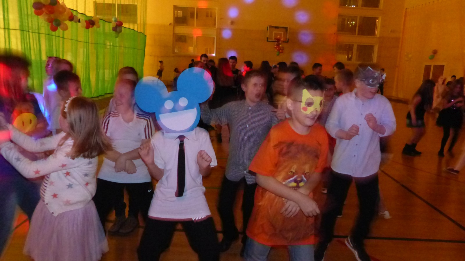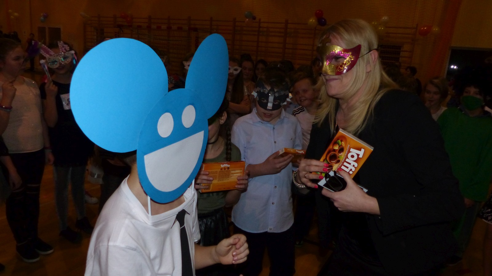 Chętni przystapili do konkursu na najciekawszą maskę. Komisja konkursowa, w skład której wchodzili uczniowie, rodzice i nauczyciele mieli trudny orzech do zgryzienia, ponieważ maski były kolorowe, tajemnicze, naprawdę wspaniałe. Ostatecznie wybrano 3 maski, a ich właściciele otrzymali słodkie upominki. Maski są po to, aby się za nimi ukryć, więc nie znamy nazwisk tajemniczych osób. Komisja zgodnie orzekła, że wyróżniała się myszka Miki, fantastyczna postać z kosmosu oraz dama prosto z Wenecji. Po konkursie DJ Adrian ponownie porwał nas do zabawy przy najnowszych i lubianych hitach muzycznych. Każda klasa o umówionej godzinie znikała z sali na choinkowy poczęstunek. Dominowała pizza, ale nie brakowało innych zdrowych przekąsek. Starań w przygotowaniu choinki dołożyli rodzice naszych uczniów, którym dziękujemy za opiekę, aktywny udział i przygotowanie choikowych paczek, które zawsze miło otrzymać. W naszej szkole bardzo lubimy takie wspólne imprezy. W tym roku bal maskowy był super! Szkoda, że wielu uczniów było nieobecnych ze względu na sezonowe zachorowania. Do zobaczenia za rok!