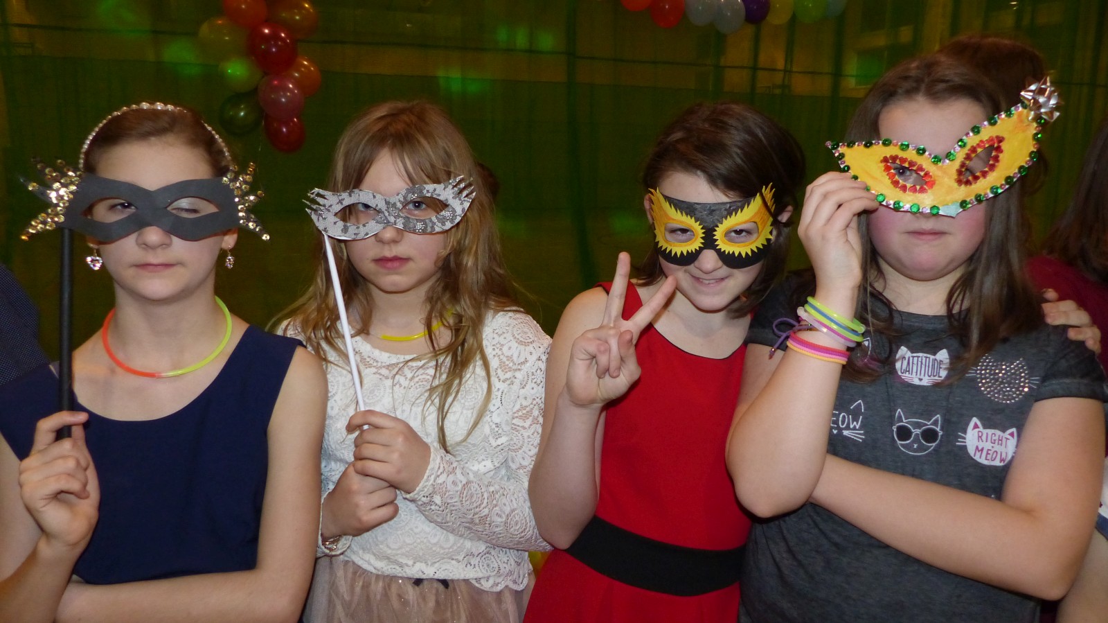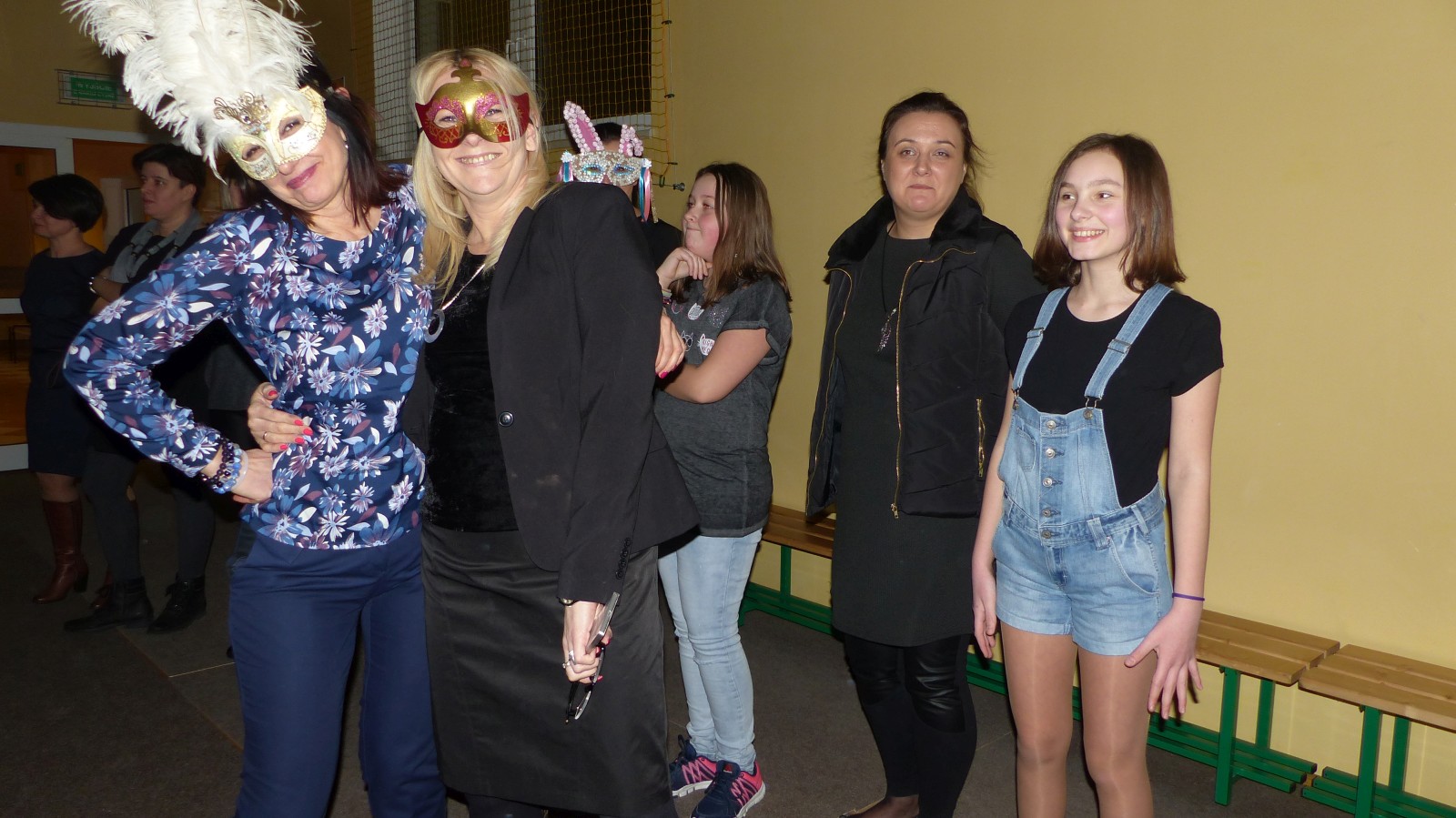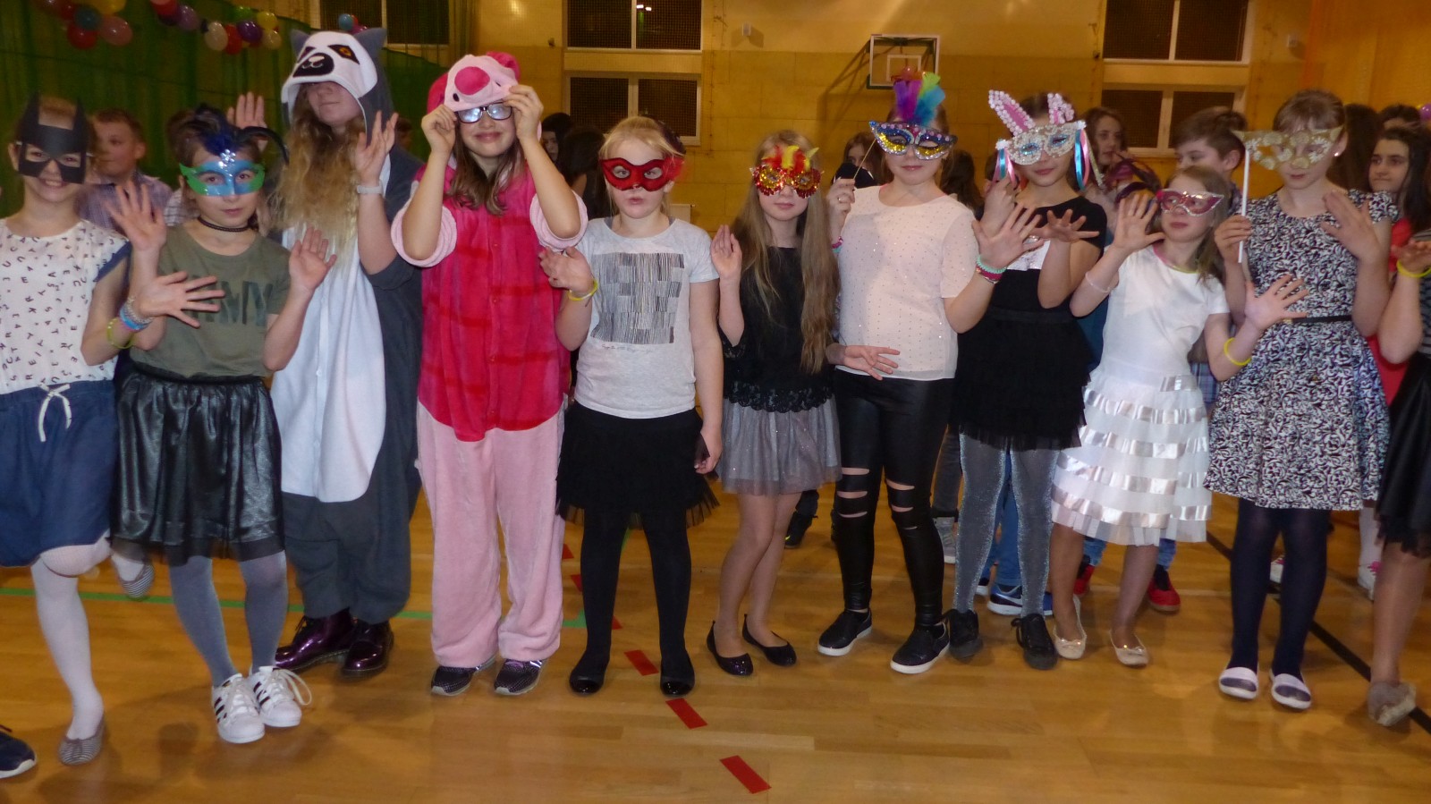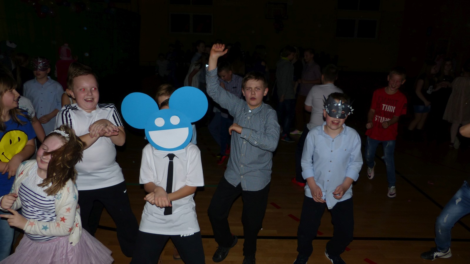 Chętni przystapili do konkursu na najciekawszą maskę. Komisja konkursowa, w skład której wchodzili uczniowie, rodzice i nauczyciele mieli trudny orzech do zgryzienia, ponieważ maski były kolorowe, tajemnicze, naprawdę wspaniałe. Ostatecznie wybrano 3 maski, a ich właściciele otrzymali słodkie upominki. Maski są po to, aby się za nimi ukryć, więc nie znamy nazwisk tajemniczych osób. Komisja zgodnie orzekła, że wyróżniała się myszka Miki, fantastyczna postać z kosmosu oraz dama prosto z Wenecji. Po konkursie DJ Adrian ponownie porwał nas do zabawy przy najnowszych i lubianych hitach muzycznych. Każda klasa o umówionej godzinie znikała z sali na choinkowy poczęstunek. Dominowała pizza, ale nie brakowało innych zdrowych przekąsek. Starań w przygotowaniu choinki dołożyli rodzice naszych uczniów, którym dziękujemy za opiekę, aktywny udział i przygotowanie choikowych paczek, które zawsze miło otrzymać. W naszej szkole bardzo lubimy takie wspólne imprezy. W tym roku bal maskowy był super! Szkoda, że wielu uczniów było nieobecnych ze względu na sezonowe zachorowania. Do zobaczenia za rok!