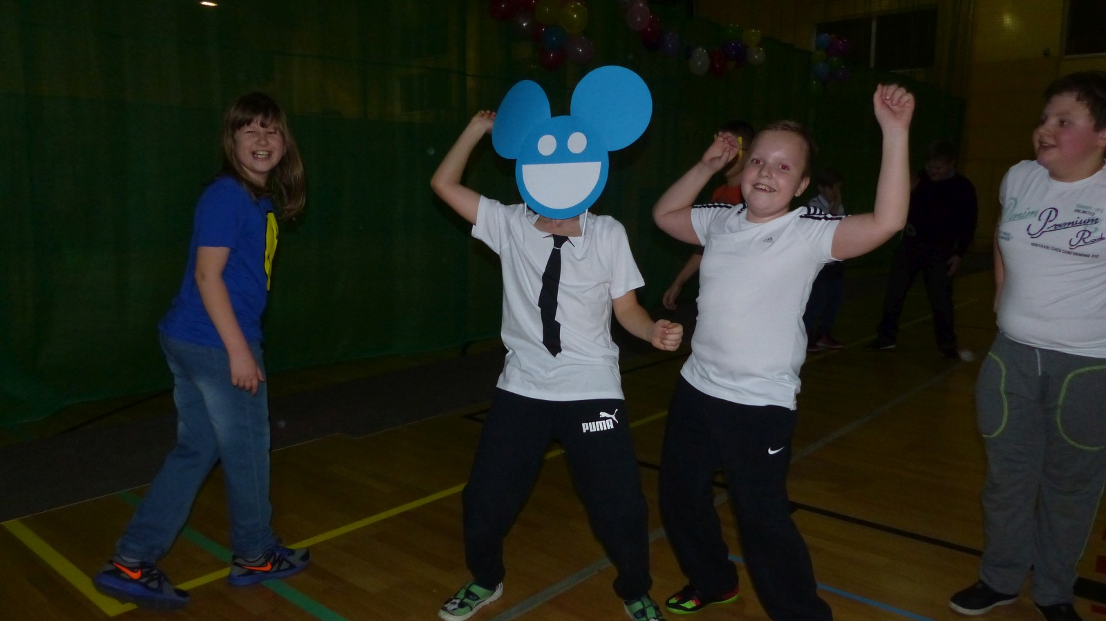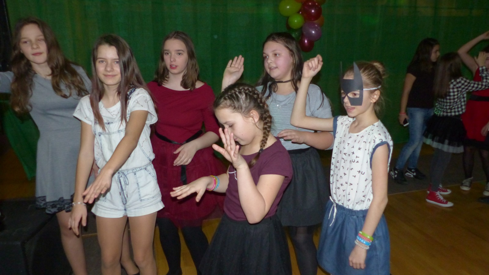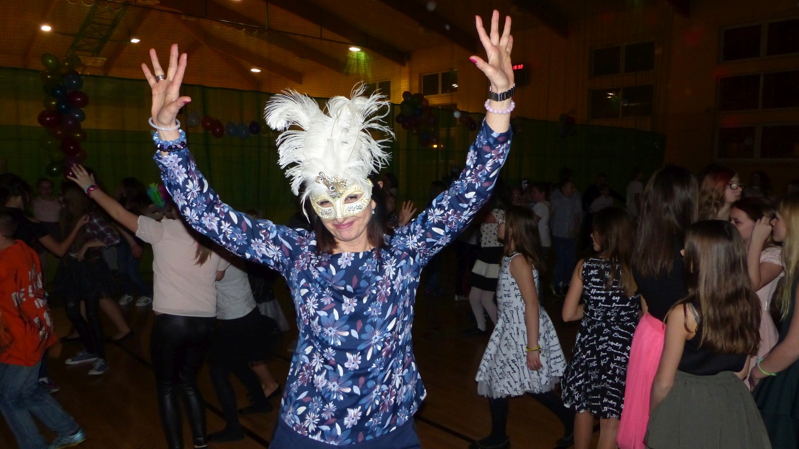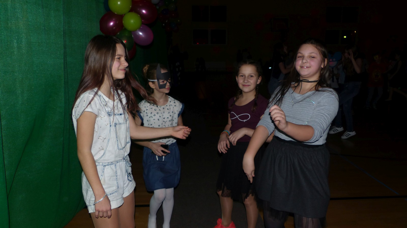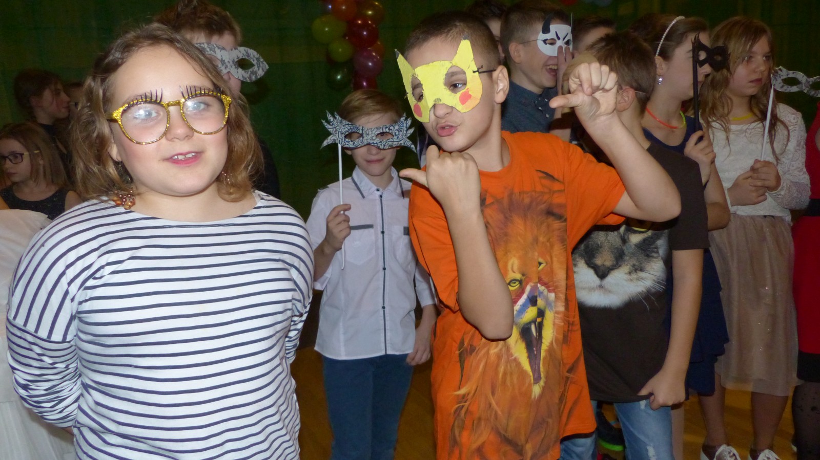 Chętni przystapili do konkursu na najciekawszą maskę. Komisja konkursowa, w skład której wchodzili uczniowie, rodzice i nauczyciele mieli trudny orzech do zgryzienia, ponieważ maski były kolorowe, tajemnicze, naprawdę wspaniałe. Ostatecznie wybrano 3 maski, a ich właściciele otrzymali słodkie upominki. Maski są po to, aby się za nimi ukryć, więc nie znamy nazwisk tajemniczych osób. Komisja zgodnie orzekła, że wyróżniała się myszka Miki, fantastyczna postać z kosmosu oraz dama prosto z Wenecji. Po konkursie DJ Adrian ponownie porwał nas do zabawy przy najnowszych i lubianych hitach muzycznych. Każda klasa o umówionej godzinie znikała z sali na choinkowy poczęstunek. Dominowała pizza, ale nie brakowało innych zdrowych przekąsek. Starań w przygotowaniu choinki dołożyli rodzice naszych uczniów, którym dziękujemy za opiekę, aktywny udział i przygotowanie choikowych paczek, które zawsze miło otrzymać. W naszej szkole bardzo lubimy takie wspólne imprezy. W tym roku bal maskowy był super! Szkoda, że wielu uczniów było nieobecnych ze względu na sezonowe zachorowania. Do zobaczenia za rok!