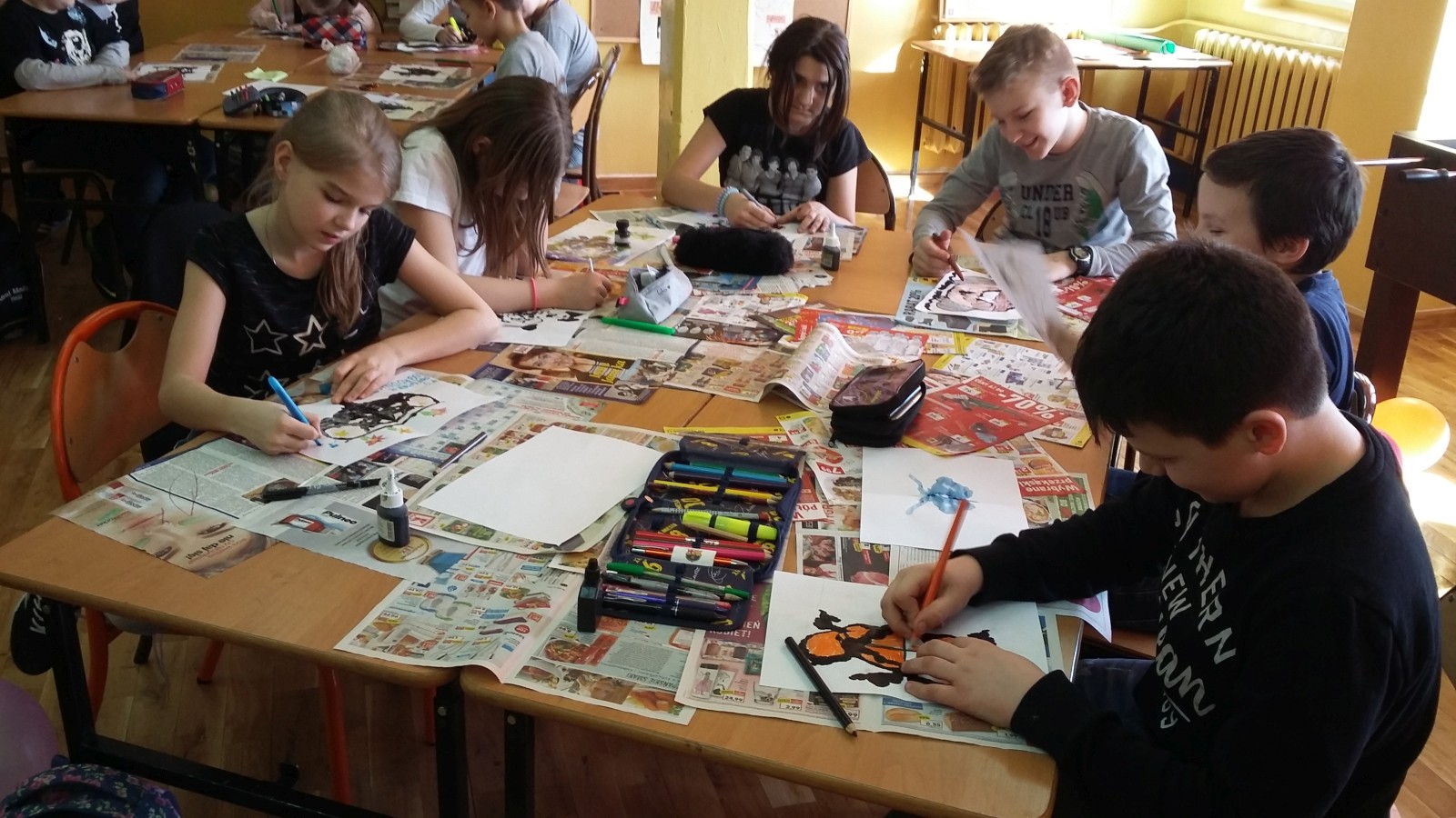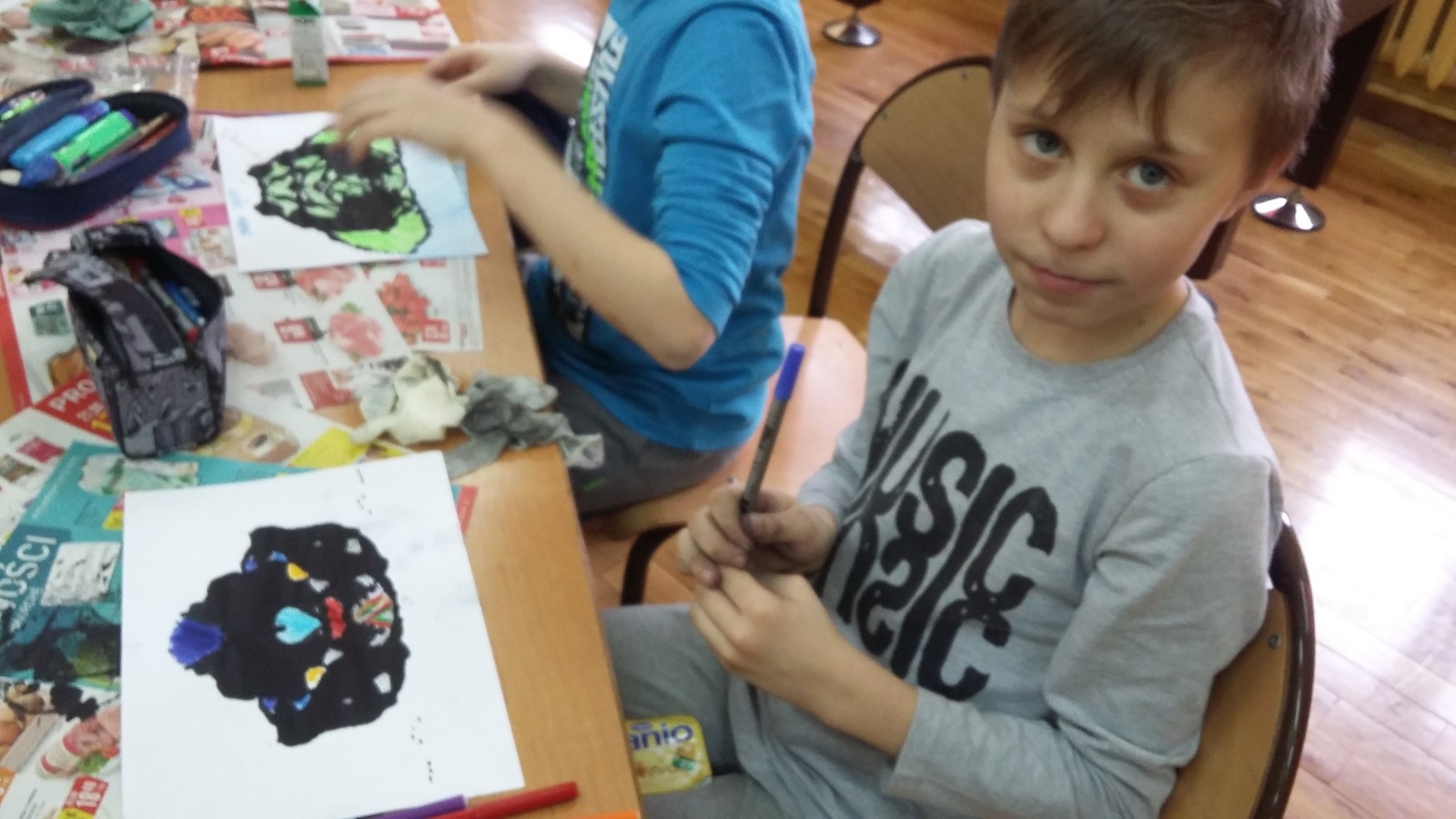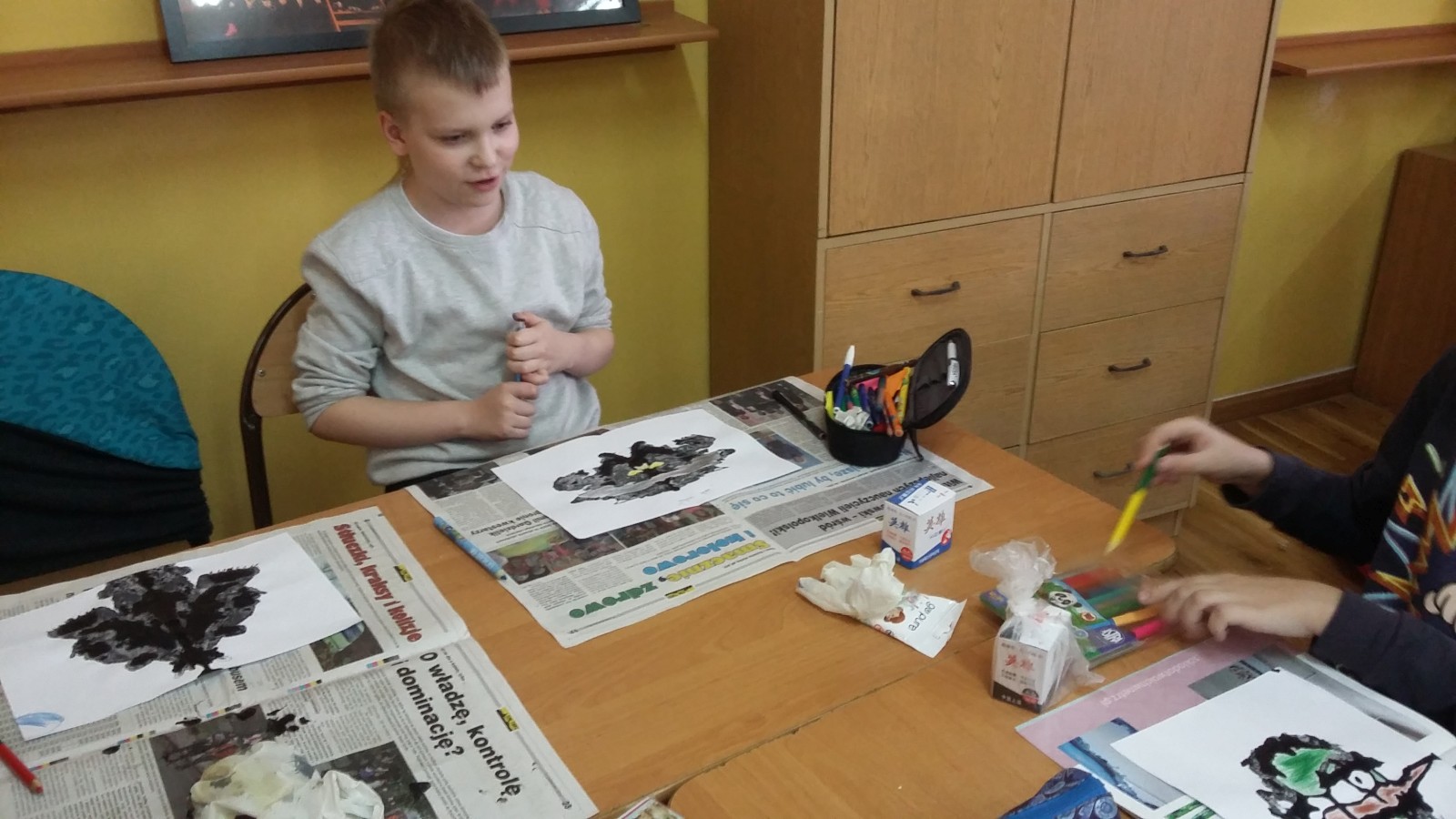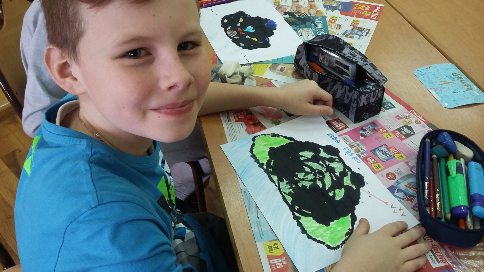 obejrzeli fragment filmu pt. „Akademia pana Kleksa” dotyczący lekcji kleksografii. Następnie opracowano instrukcję, według której pracowano na lekcji. Kiedy malowidła były gotowe, każdy uczeń ułożył rymowankę lub opisał swoje dzieło. Na koniec, w nagrodę za sumienną pracę obdarowano wszystkich kolorowymi piegami. Powstałe z kleksów prace okazały się bardzo ciekawe i zabawne.