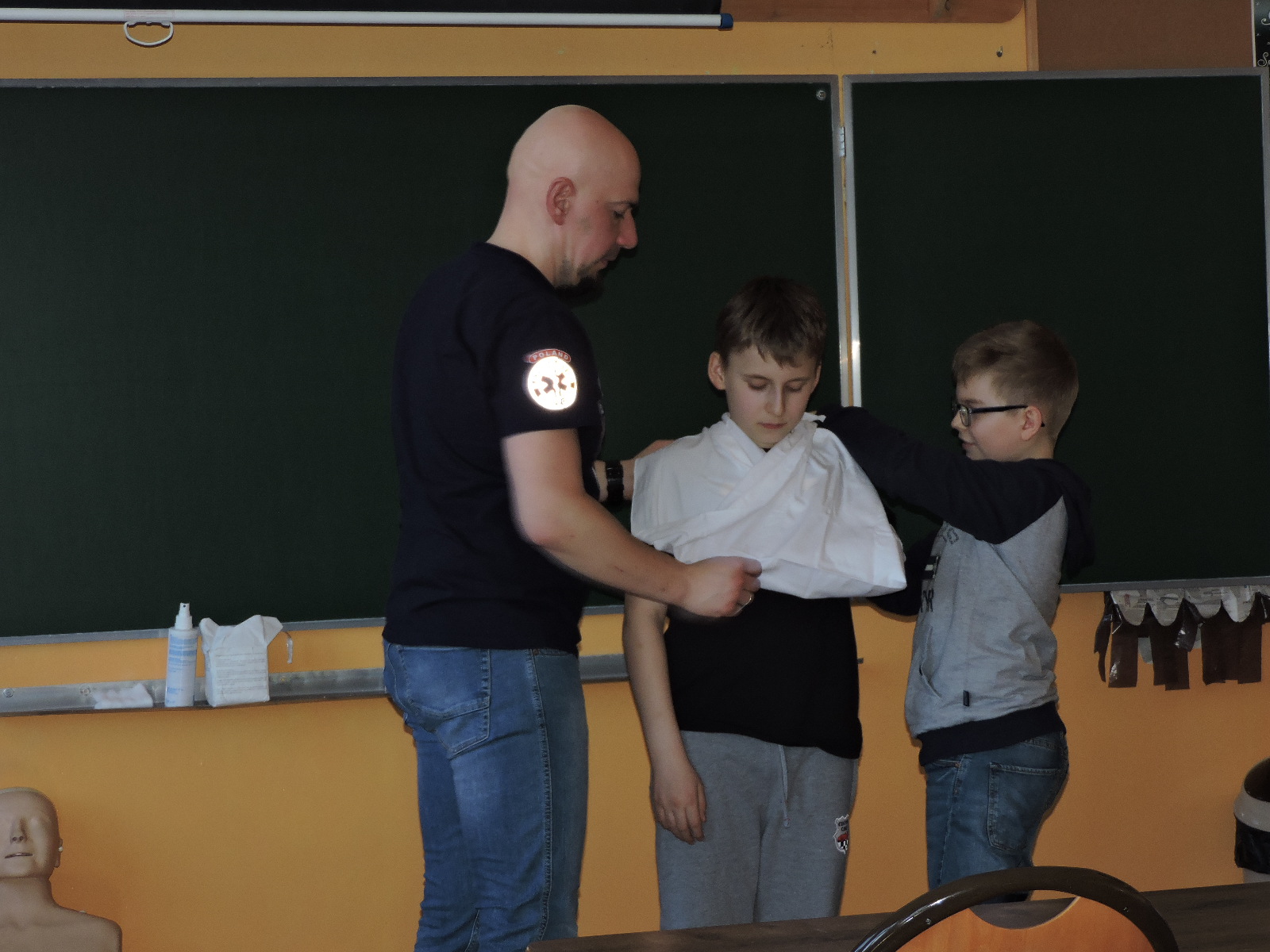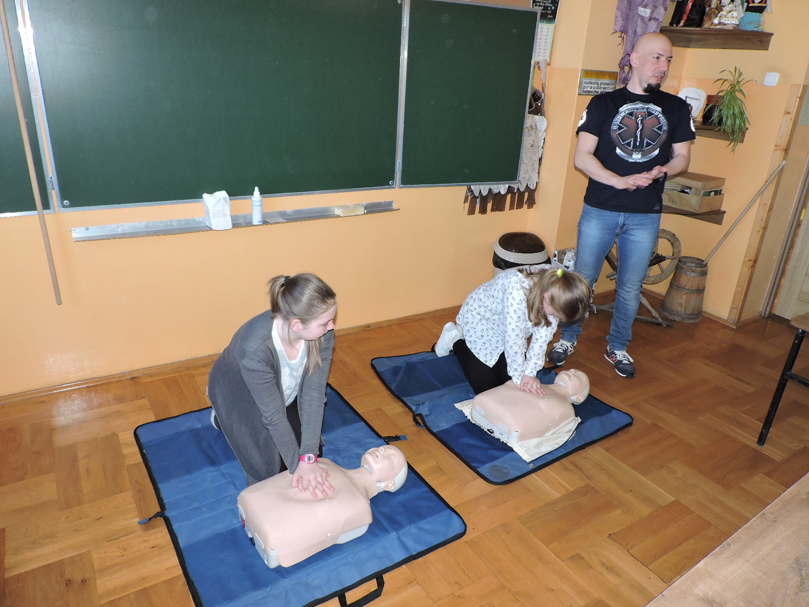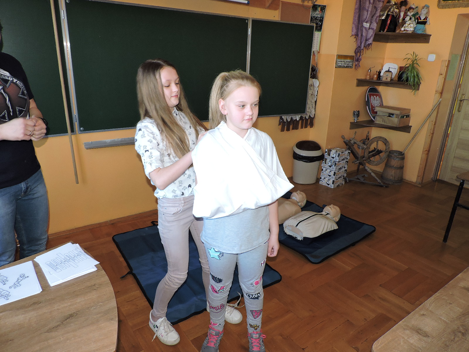 Dowiedzieliśmy się: jak postępować w sytuacji oparzenia, omdlenia, złamania czy zwichnięcia?, jak wygląda pozycja bezpieczna?, jak reanimować osobę nieprzytomną z brakiem oddechu?. Była to lekcja nie tylko teoretyczna, choć mieliśmy wiele pytań, ale również praktyczna. Wiemy już jak zachować się podczas wypadku oraz jak udzielić pierwszej pomocy osobie poszkodowanej.