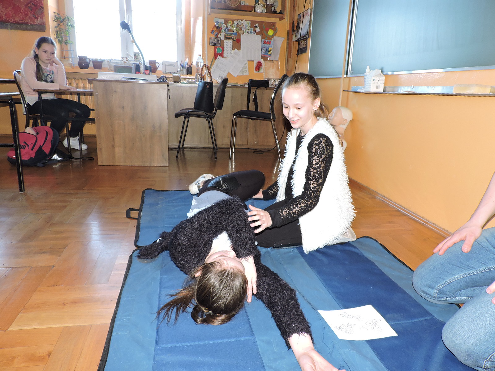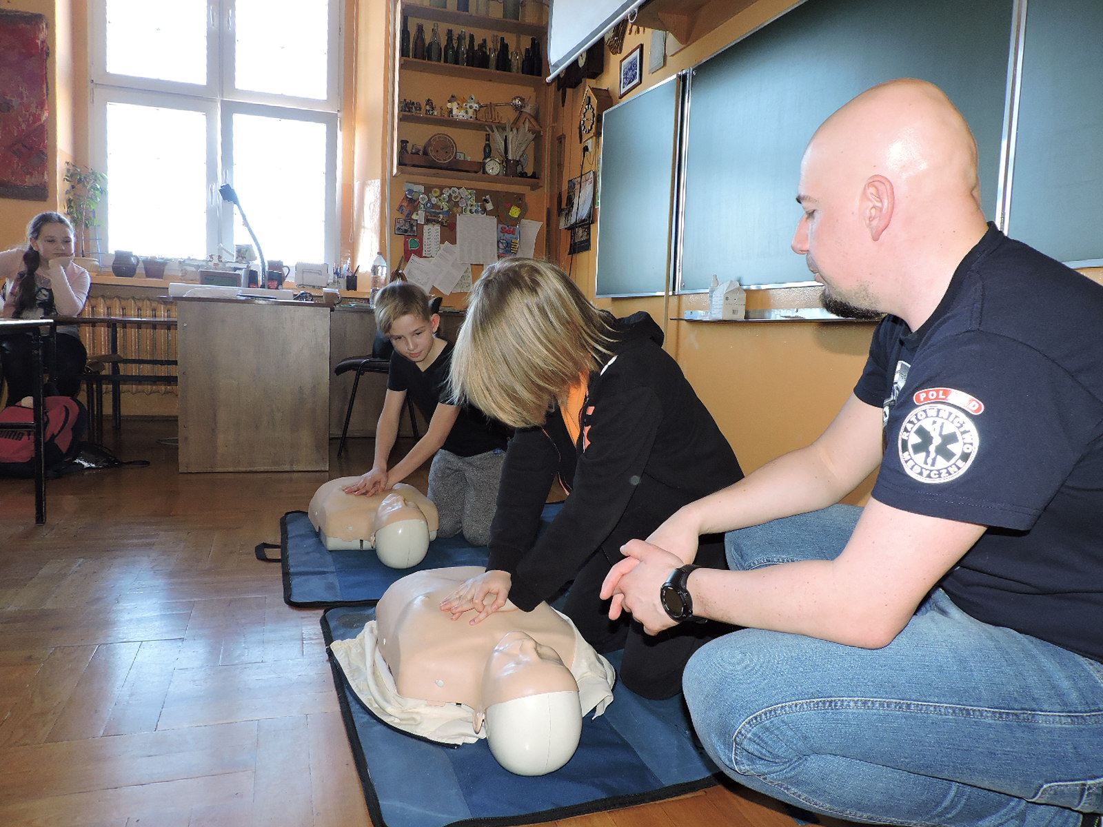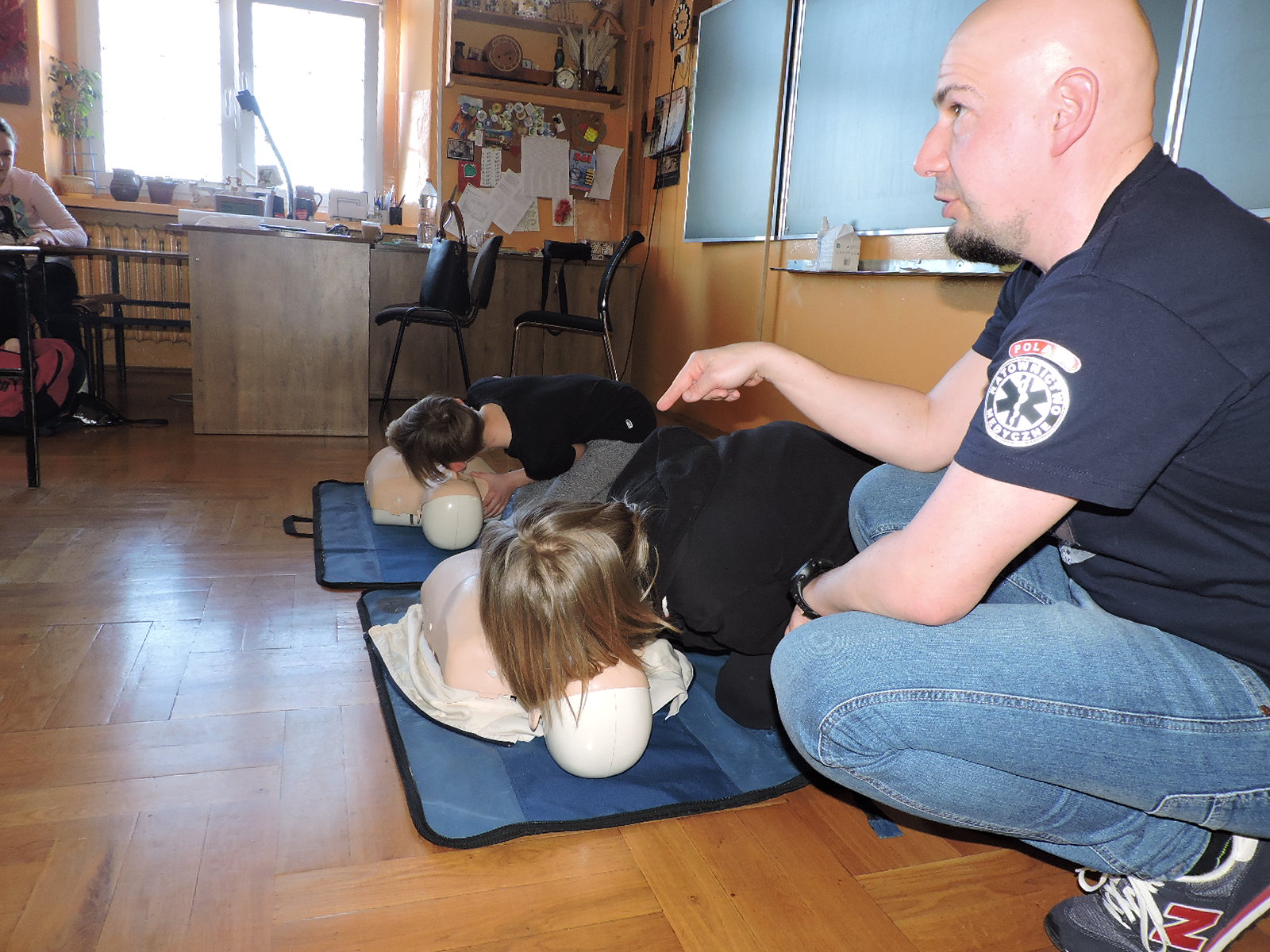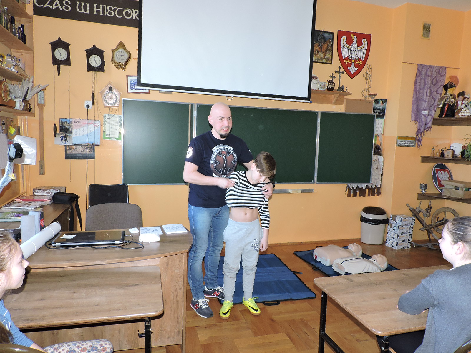 Dowiedzieliśmy się: jak postępować w sytuacji oparzenia, omdlenia, złamania czy zwichnięcia?, jak wygląda pozycja bezpieczna?, jak reanimować osobę nieprzytomną z brakiem oddechu?. Była to lekcja nie tylko teoretyczna, choć mieliśmy wiele pytań, ale również praktyczna. Wiemy już jak zachować się podczas wypadku oraz jak udzielić pierwszej pomocy osobie poszkodowanej.