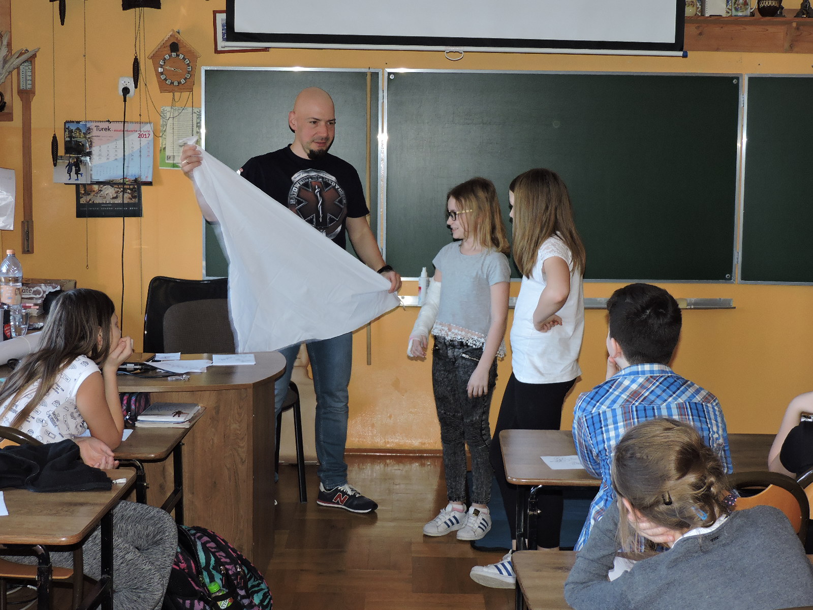28 marca 2017 roku klasy 4a, 4b, 4c, 4d brały udział w zajęciach przyrodniczych z pierwszej pomocy. Nasze zaproszenie przyjął pan Łukasz Maciejewski – ratownik medyczny, pielęgniarz Wojewódzkiego Szpitala Zespolonego w Koninie. Pan Łukasz szkolił nas jak postępować w sytuacjach wypadków, które zdarzają się w domu jak i poza domem.