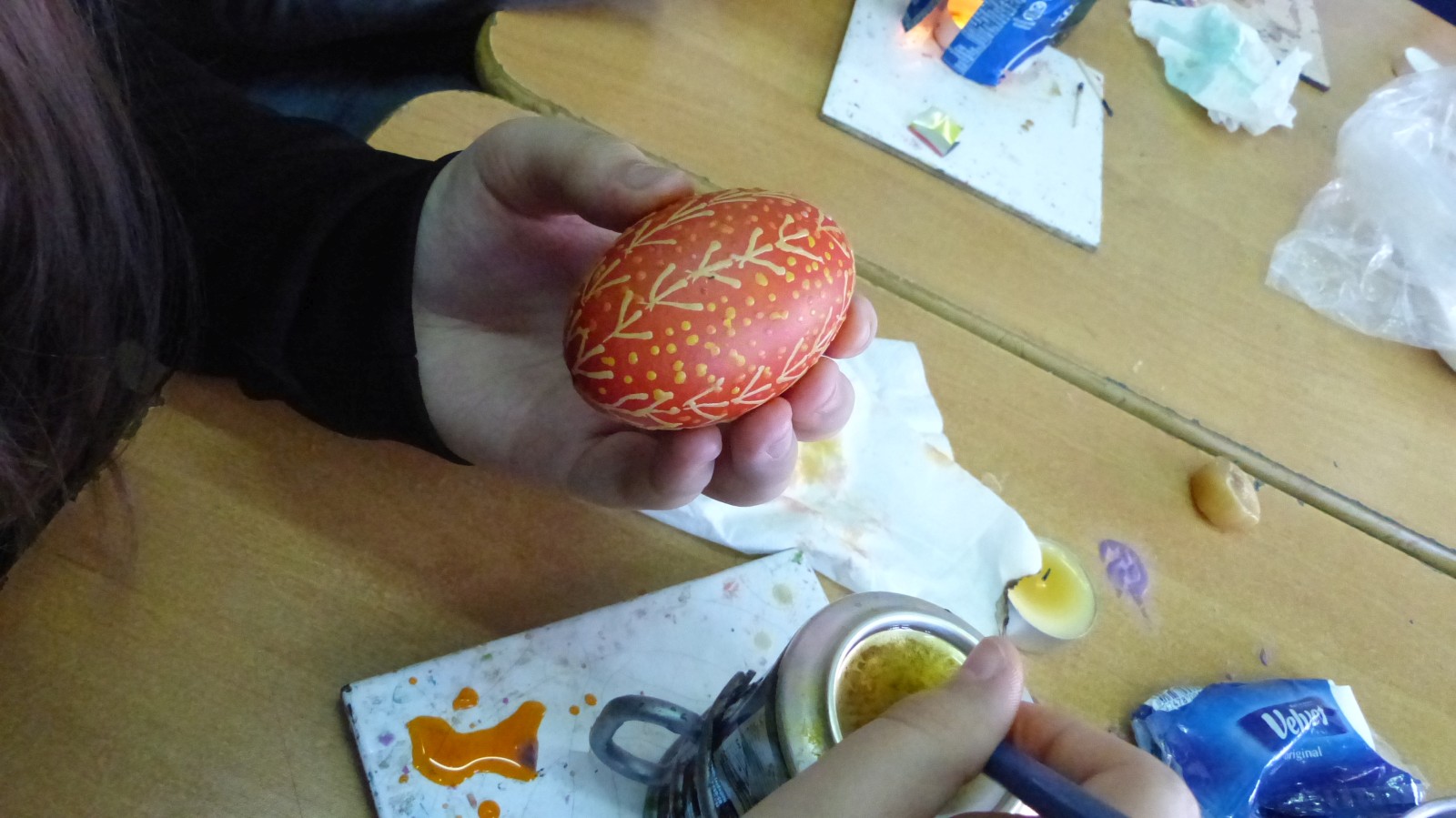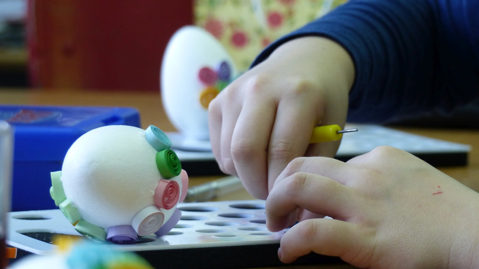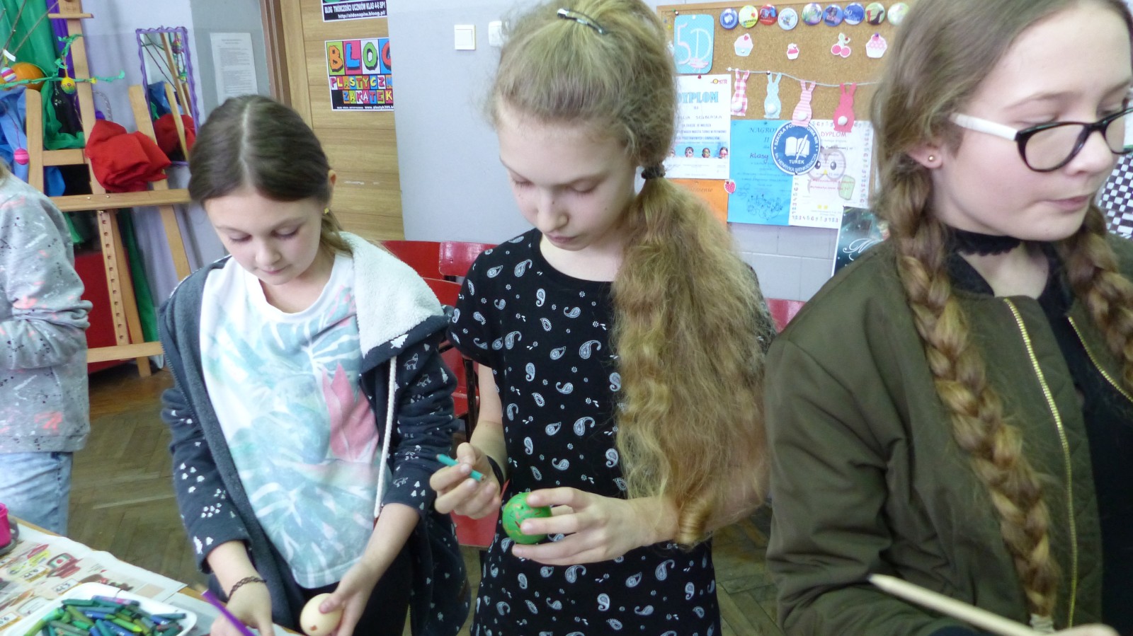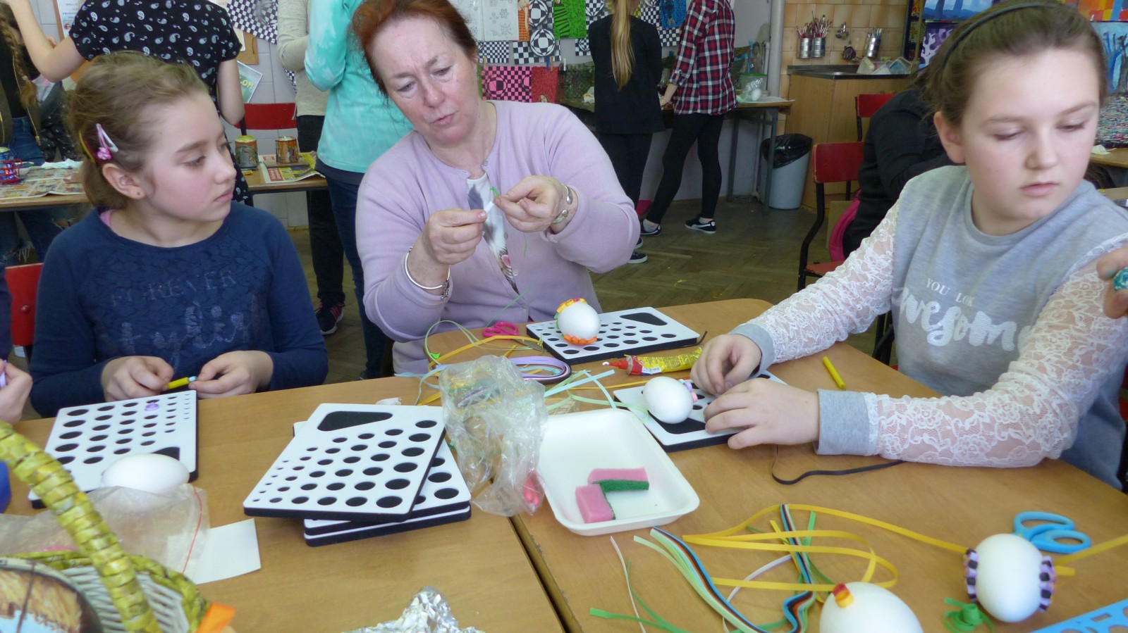 Dzieci poznały tradycje zdobienia pisanek na naszym terenie. Jedną z tradycyjnych technik było pisanie woskiem pszczelim, stąd sama nazwa pisanki. Dziś istnieje wiele technik plastycznych , które można wykorzystać do ozdobienia jajka. Na warsztatach dzieci mogły zapoznać się z techniką qulingu oraz malowania kolorowymi woskami, bardziej współczesną odmianą malowania jajek woskiem pszczelim.