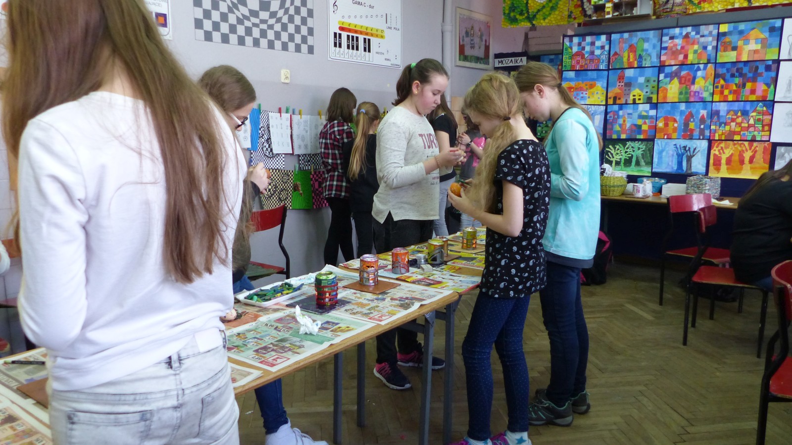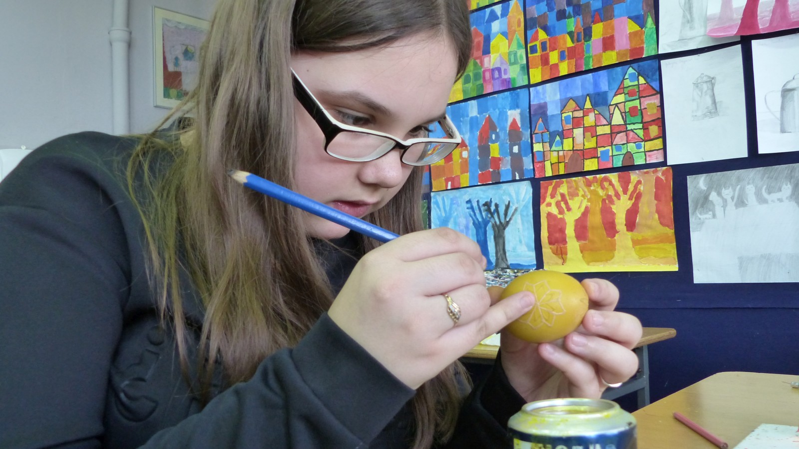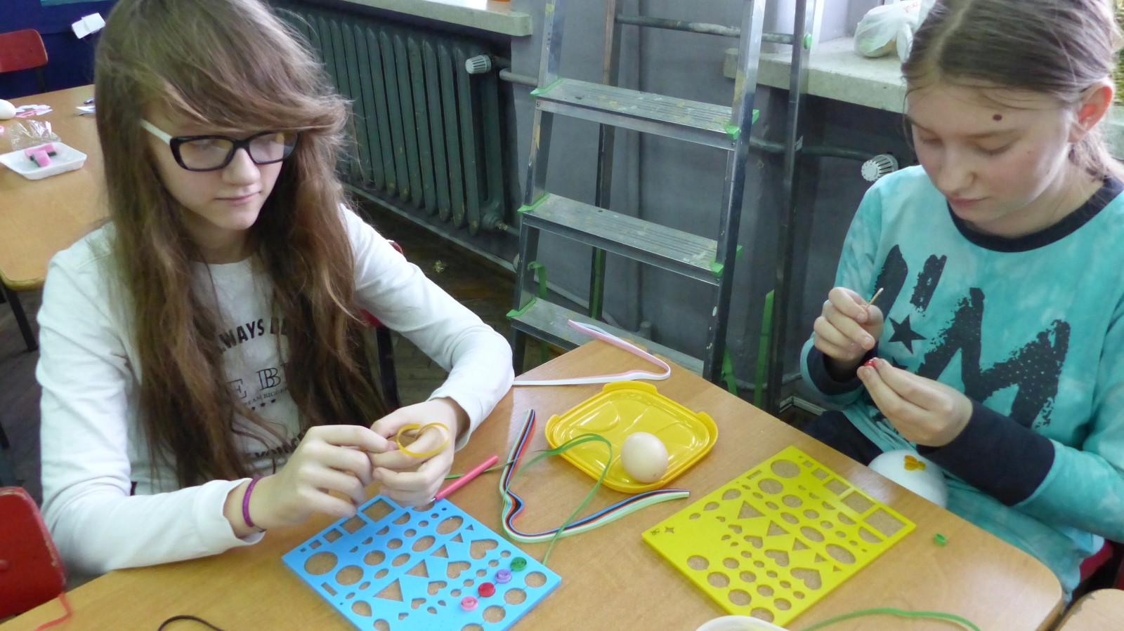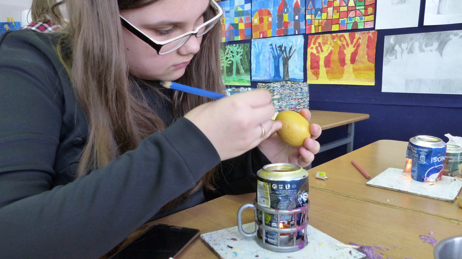 Dzieci poznały tradycje zdobienia pisanek na naszym terenie. Jedną z tradycyjnych technik było pisanie woskiem pszczelim, stąd sama nazwa pisanki. Dziś istnieje wiele technik plastycznych , które można wykorzystać do ozdobienia jajka. Na warsztatach dzieci mogły zapoznać się z techniką qulingu oraz malowania kolorowymi woskami, bardziej współczesną odmianą malowania jajek woskiem pszczelim.
