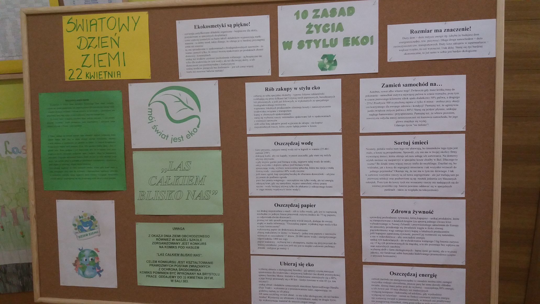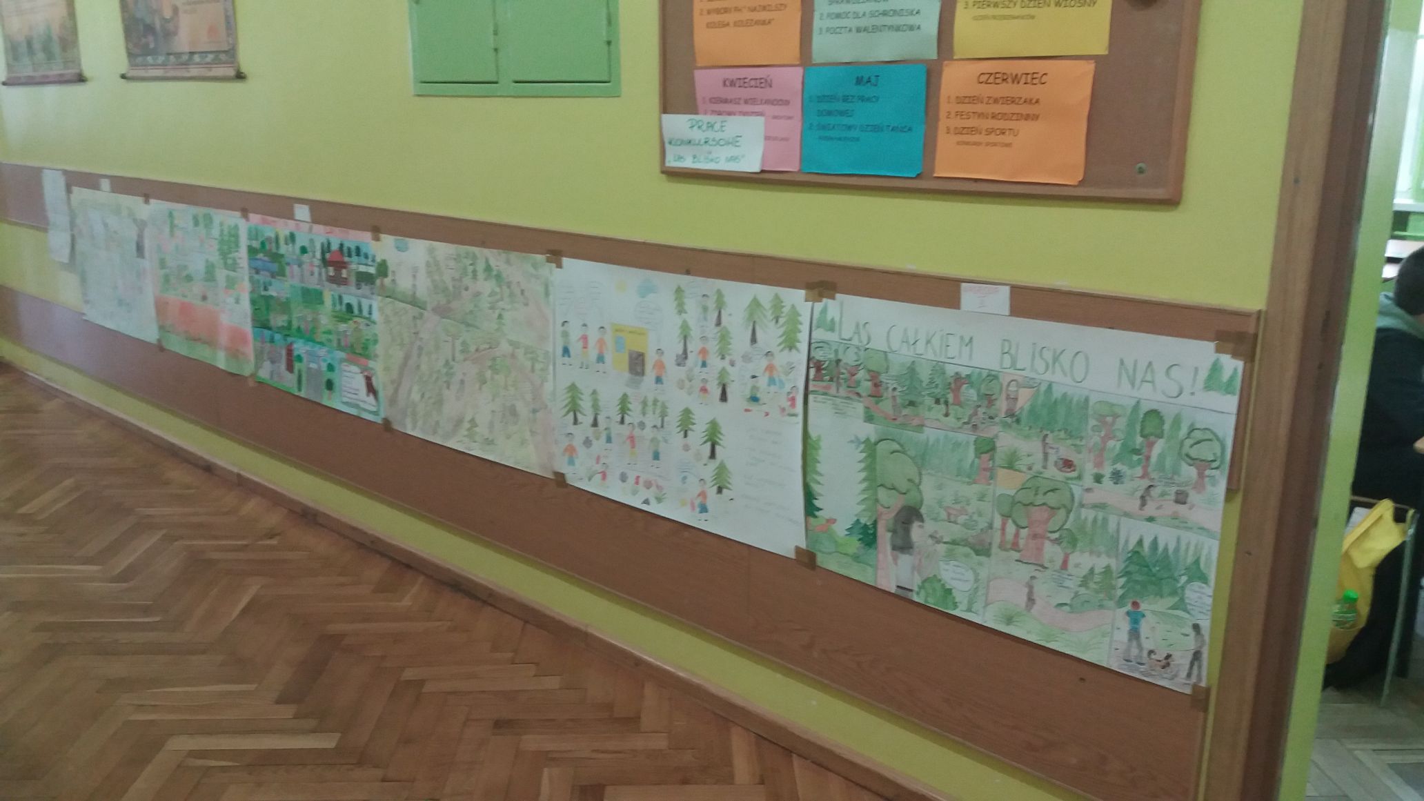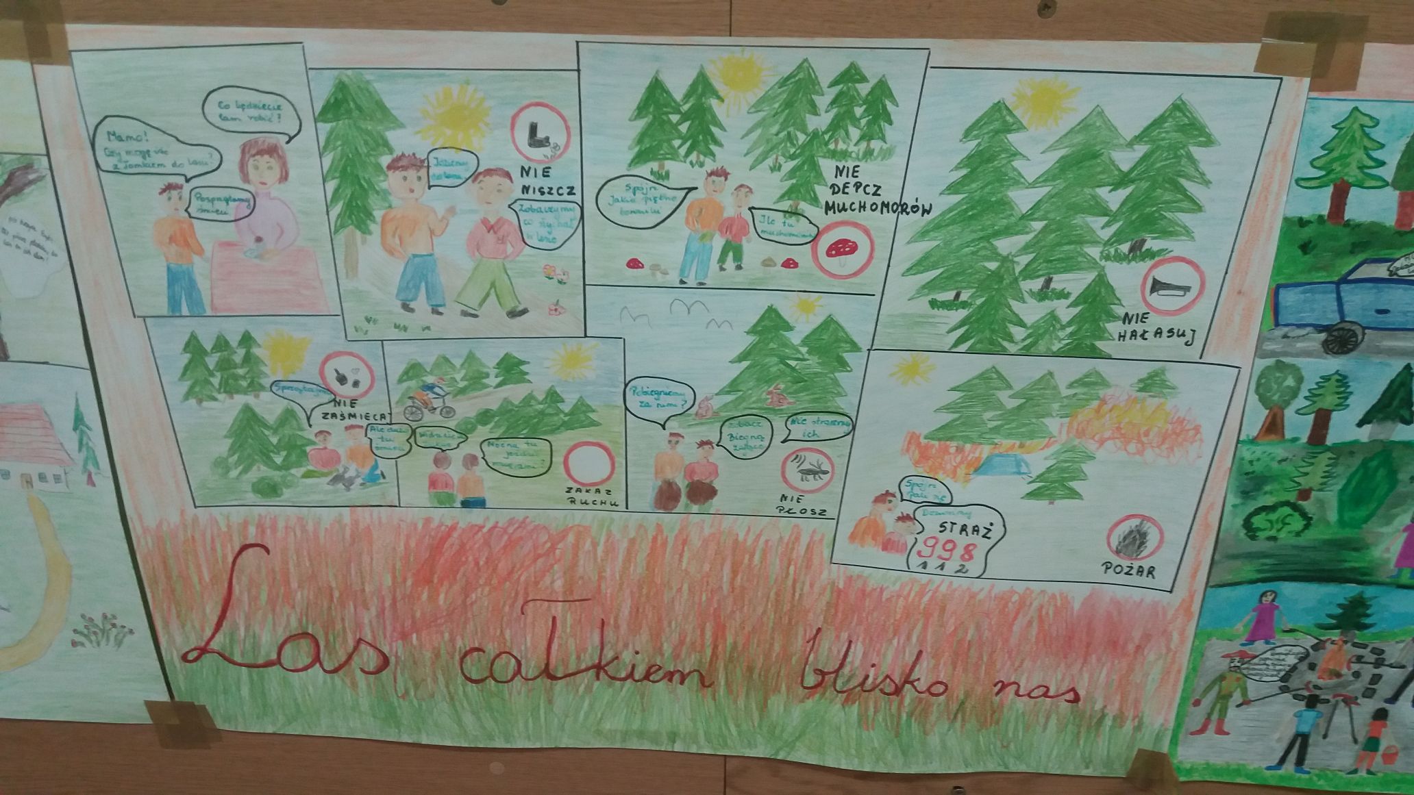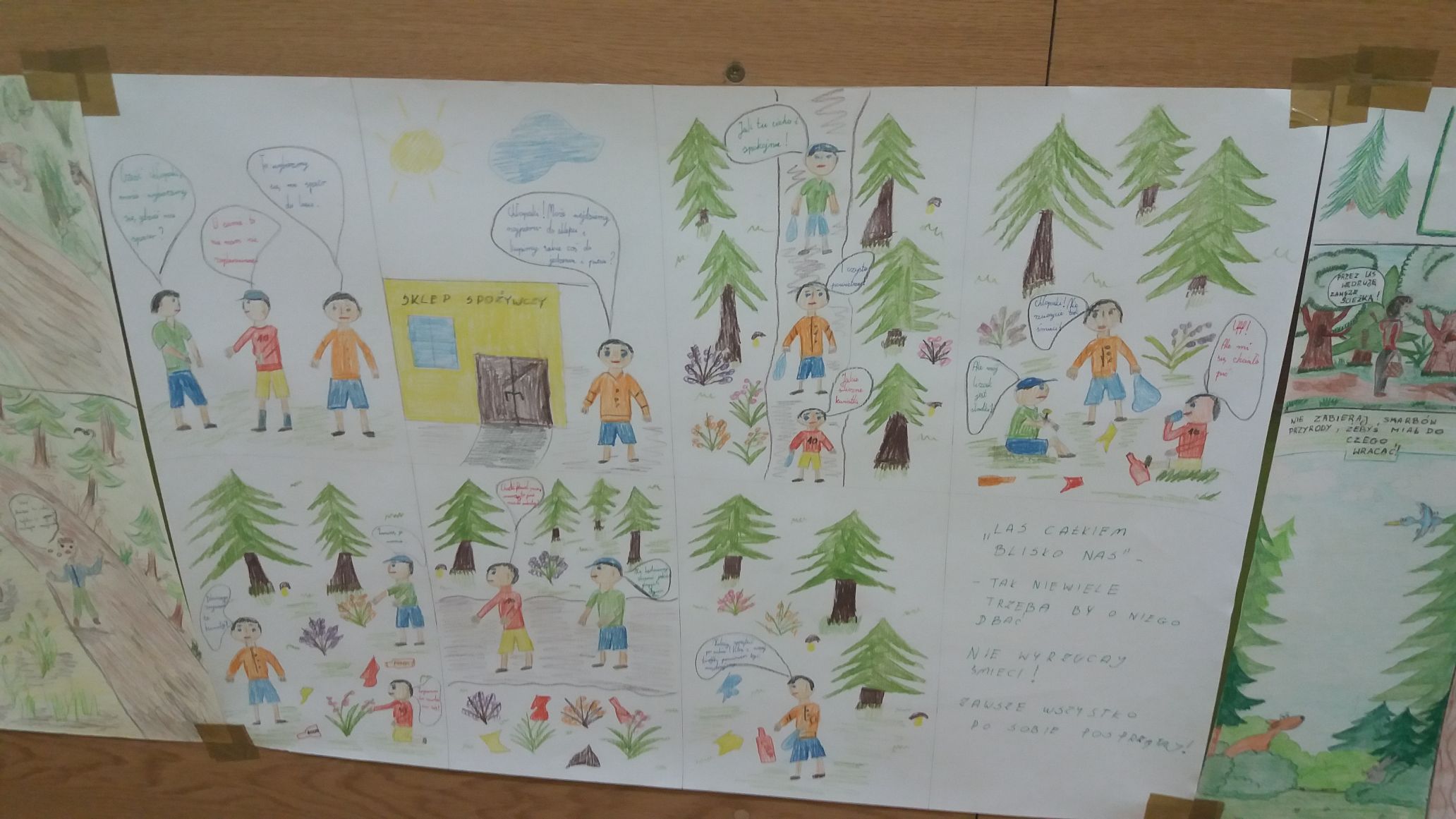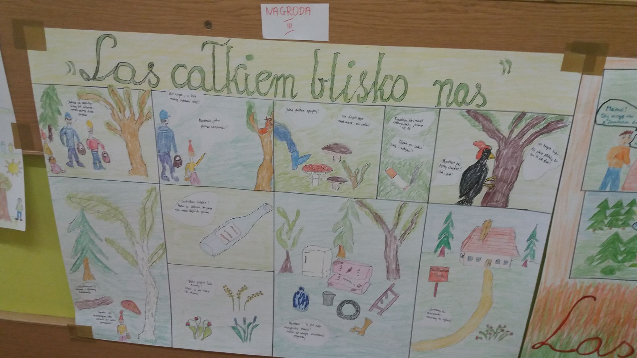 22 kwietnia co roku obchodzimy Międzynarodowy Dzień Ziemi z tej okazji klasy 4-6 wzięły udział w szkolnym konkursie „Las całkiem blisko nas”. Celem konkursu było promowanie postaw ekologicznych wśród uczniów i rodziców oraz zachęcenie do spędzania wolnego czasu w gronie rodziny na świeżym powietrzu i w lesie. Każdy uczestnik konkursu miał do wykonania komiks. Prace były bardzo piękne, wymagające dużego nakładu czasu i poświęcenia. W konkursie wygrali: I miejsce Mateusz Szczesiak z kl. 4a, II miejsce Aleksandra Smolińska z kl.4 a, III miejsce ex aequo zajęli Radosław Kałużny z kl. 6b i Mateusz Bergandy z kl.4a . Wszystkim uczniom serdecznie gratulujemy.