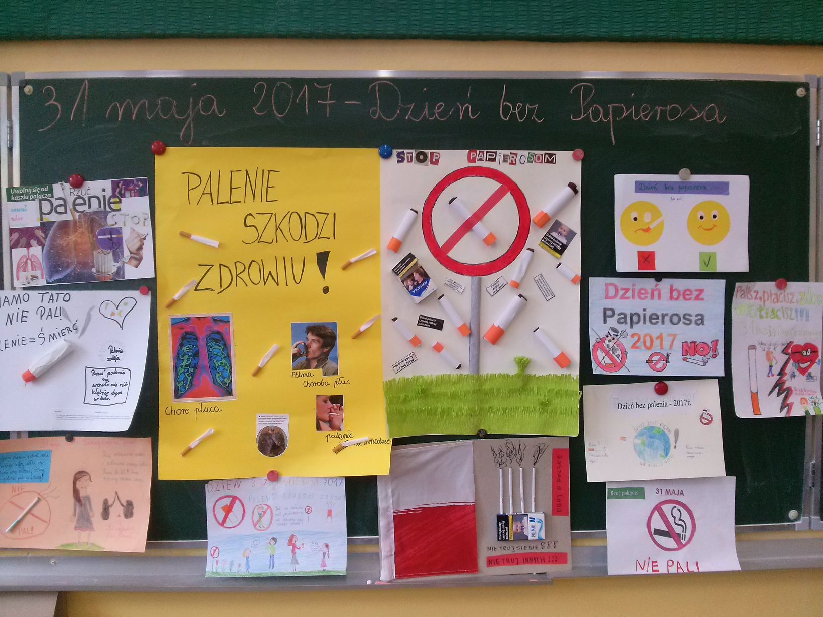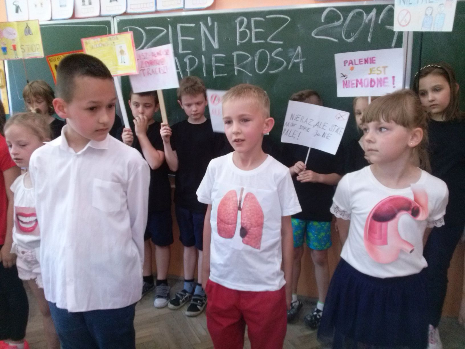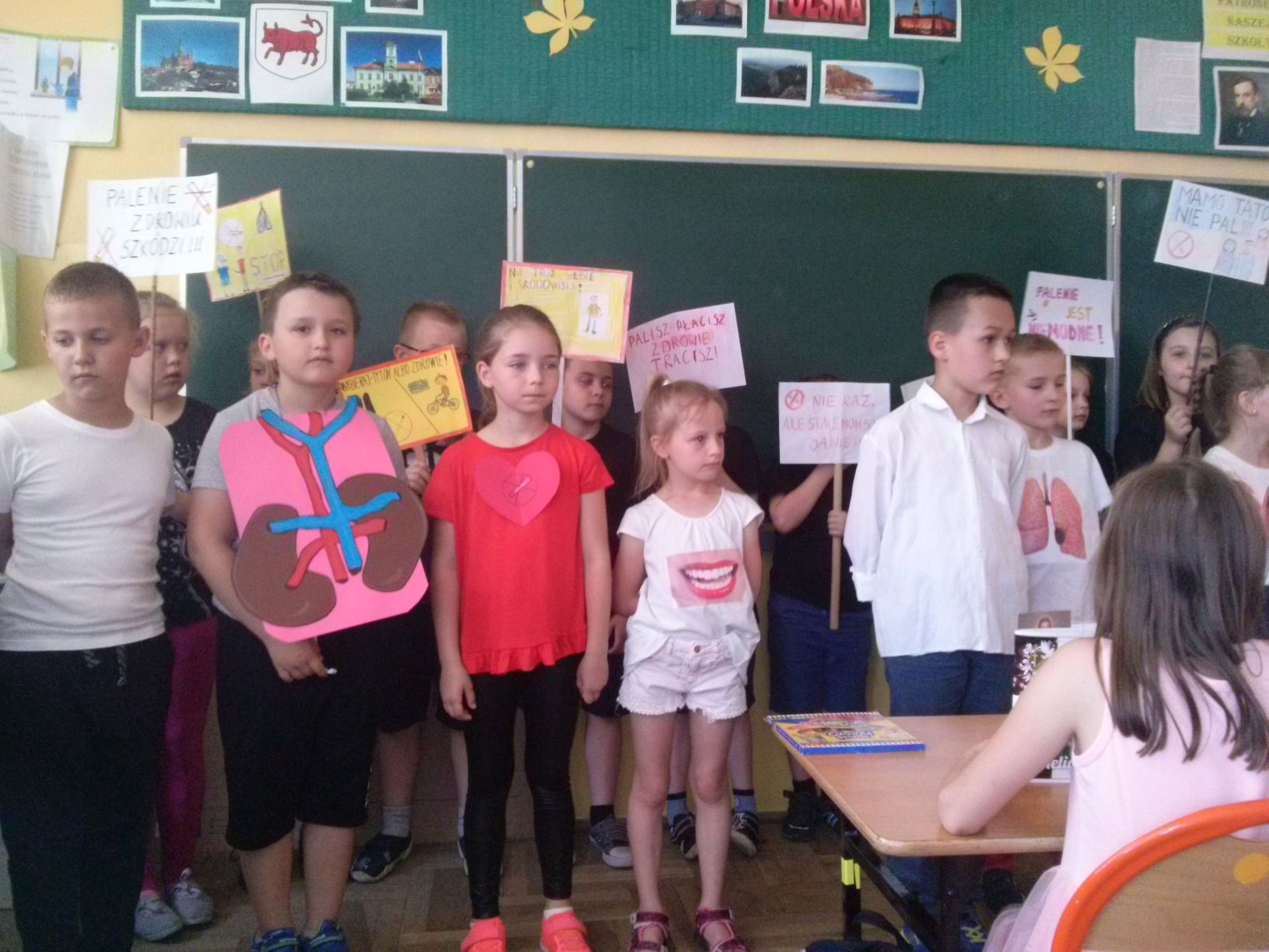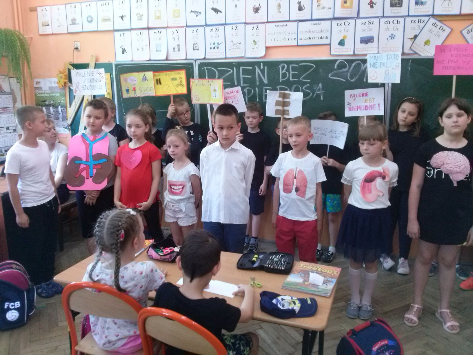2 czerwca obchodziliśmy w naszej szkole Dzień bez Papierosa. Celem akcji było poszerzenie świadomości uczniów na temat zagrożeń związanych z paleniem papierosów. W klasach 1-3 odbyły się zajęcia, podczas których czytano wiersze, przeprowadzono pogadanki i rozdano ulotki tematyczne. Uczniowie aktywnie dzielili się spostrzeżeniami, a ich przemyślenia na temat szkodliwości palenia znalazły swój wyraz w interesujących pracach plastycznych, które zostały wyeksponowane na korytarzach. Każdy rodzic, odwiedzający naszą szkołę, może podziwiać prace i zastanowić się nad potrzebą rzucenia palenia. Klasa 2b przygotowała inscenizację, którą zaprezentowała w klasach pierwszych, drugich i trzecich oraz rodzicom. Uczeń Bartłomiej Karwacki wygłosił monolog pt. ,,Nigdy nie będę palił papierosów, ponieważ…”, a jego koledzy przedstawili wpływ skutków palenia na zdrowie.