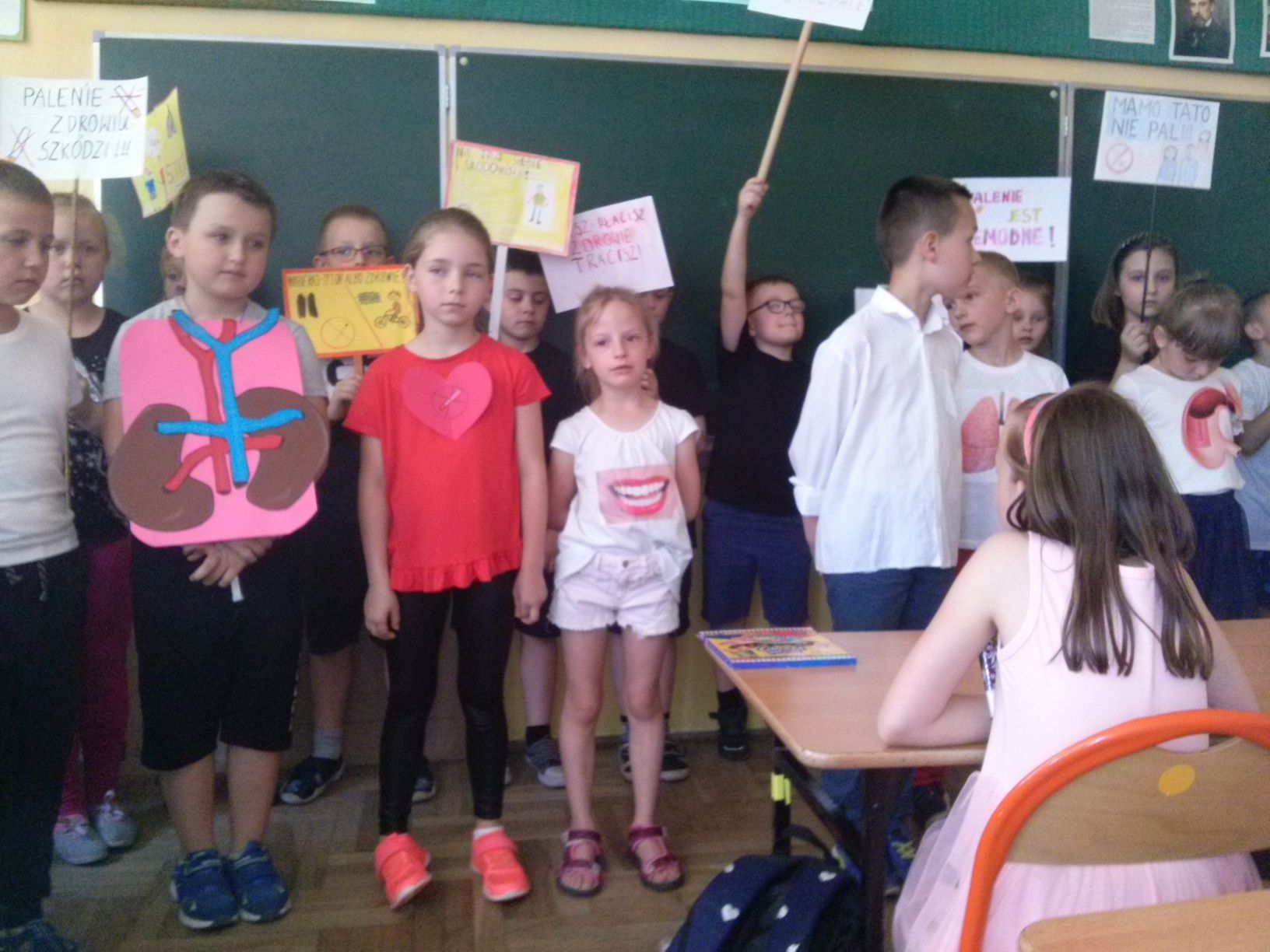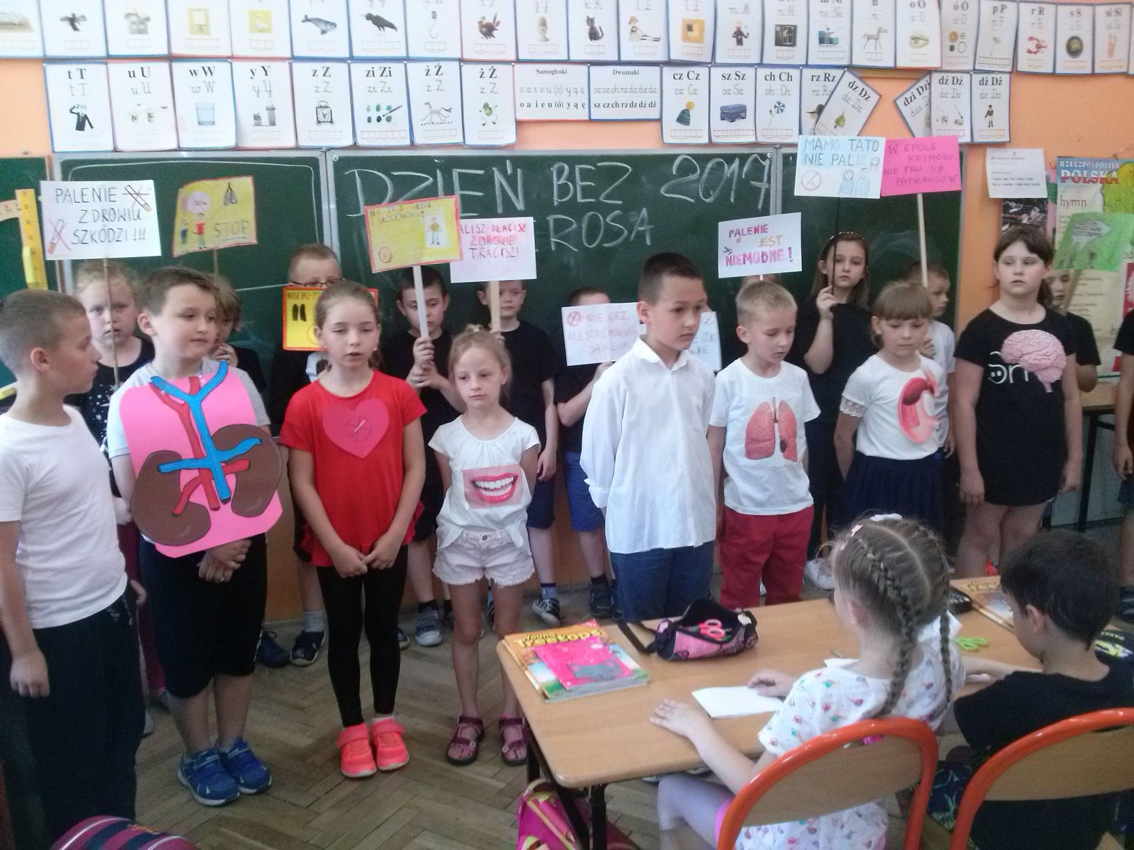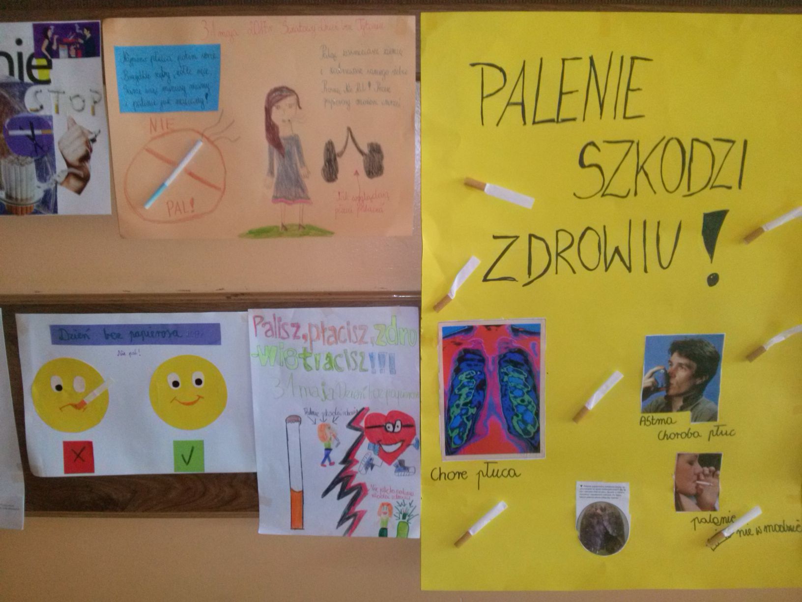 2 czerwca obchodziliśmy w naszej szkole Dzień bez Papierosa. Celem akcji było poszerzenie świadomości uczniów na temat zagrożeń związanych z paleniem papierosów. W klasach 1-3 odbyły się zajęcia, podczas których czytano wiersze, przeprowadzono pogadanki i rozdano ulotki tematyczne. Uczniowie aktywnie dzielili się spostrzeżeniami, a ich przemyślenia na temat szkodliwości palenia znalazły swój wyraz w interesujących pracach plastycznych, które zostały wyeksponowane na korytarzach. Każdy rodzic, odwiedzający naszą szkołę, może podziwiać prace i zastanowić się nad potrzebą rzucenia palenia. Klasa 2b przygotowała inscenizację, którą zaprezentowała w klasach pierwszych, drugich i trzecich oraz rodzicom. Uczeń Bartłomiej Karwacki wygłosił monolog pt. ,,Nigdy nie będę palił papierosów, ponieważ…”, a jego koledzy przedstawili wpływ skutków palenia na zdrowie.