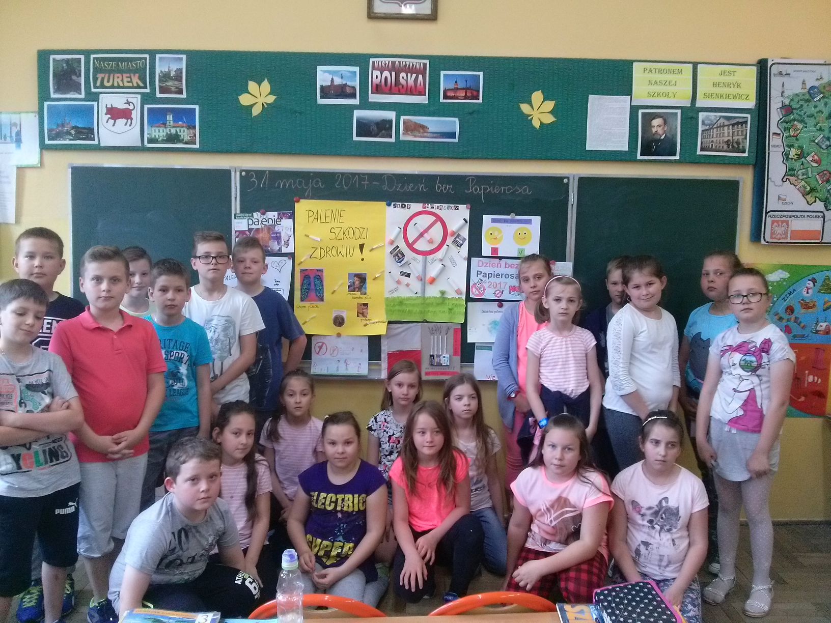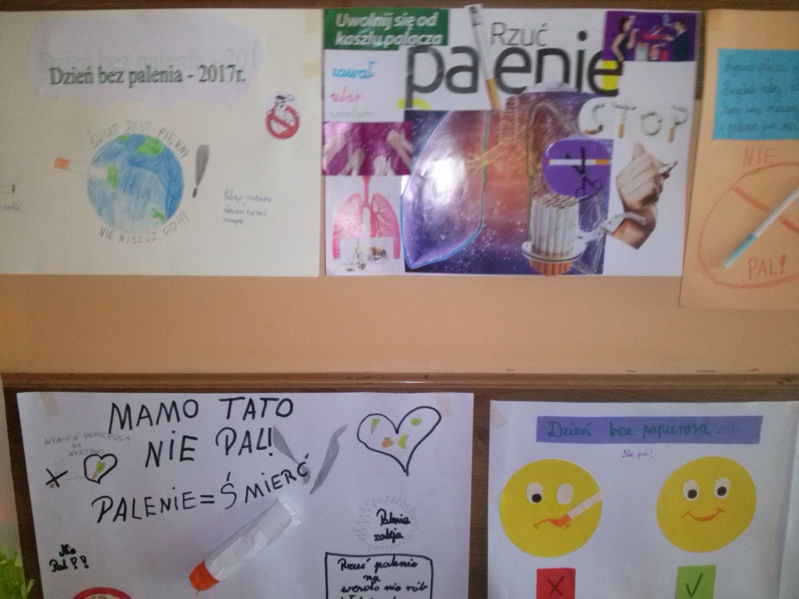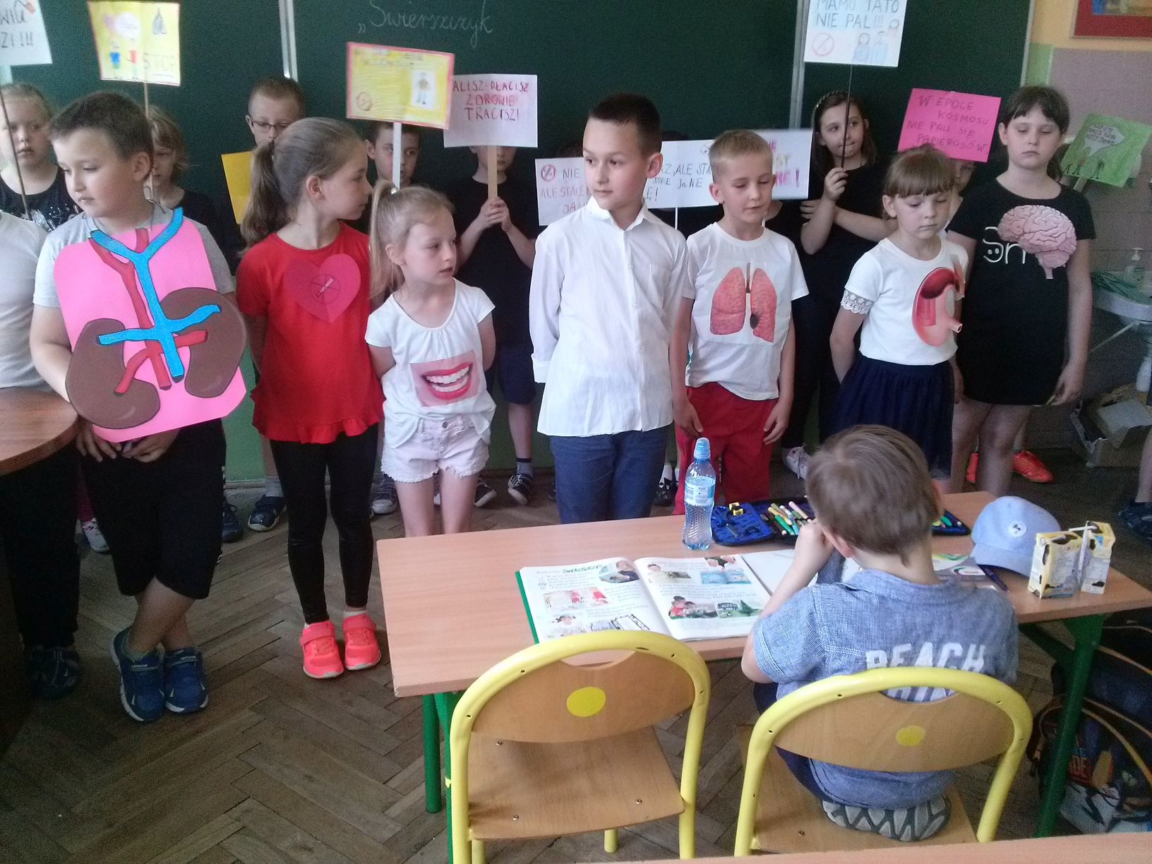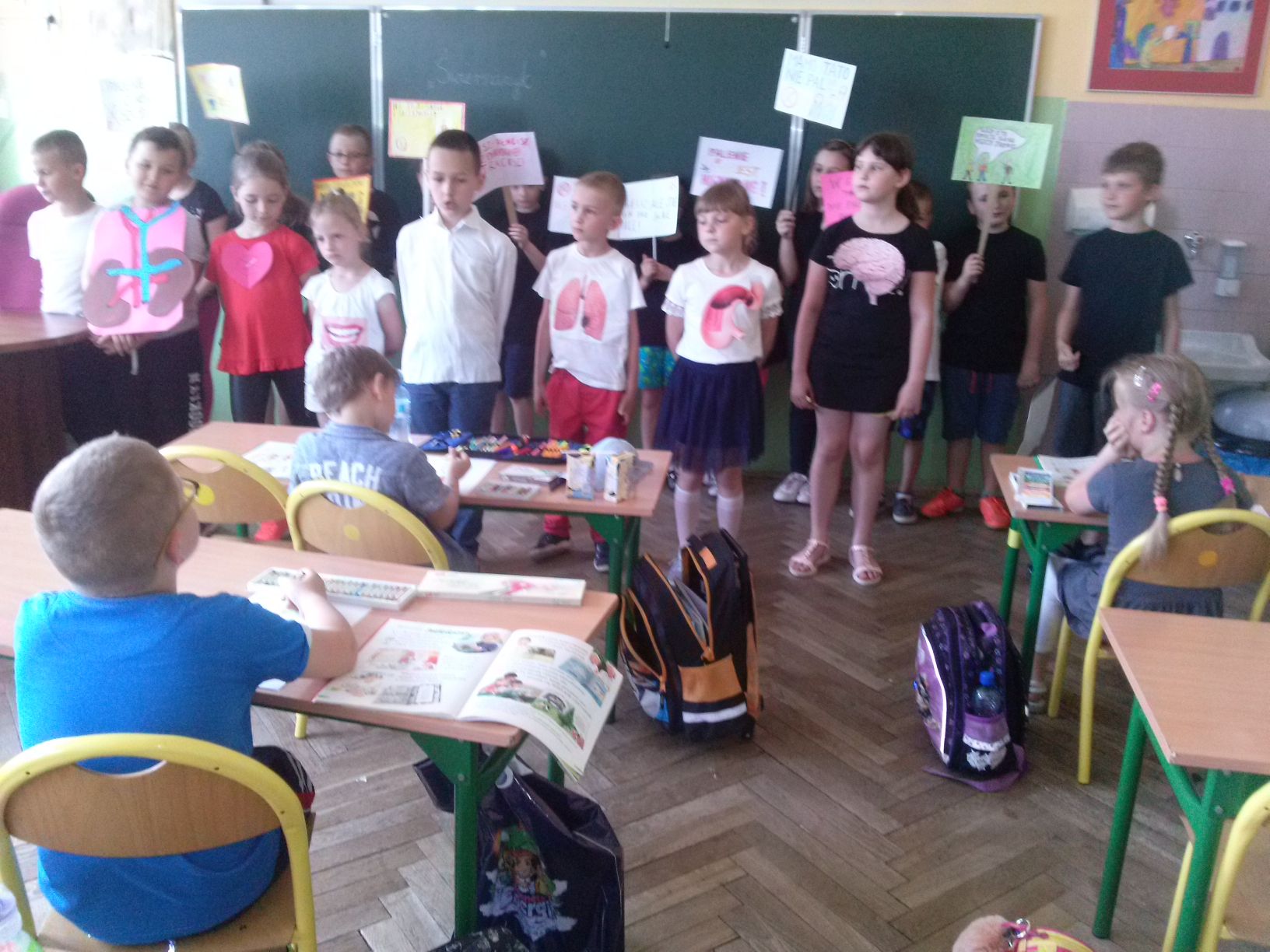 2 czerwca obchodziliśmy w naszej szkole Dzień bez Papierosa. Celem akcji było poszerzenie świadomości uczniów na temat zagrożeń związanych z paleniem papierosów. W klasach 1-3 odbyły się zajęcia, podczas których czytano wiersze, przeprowadzono pogadanki i rozdano ulotki tematyczne. Uczniowie aktywnie dzielili się spostrzeżeniami, a ich przemyślenia na temat szkodliwości palenia znalazły swój wyraz w interesujących pracach plastycznych, które zostały wyeksponowane na korytarzach. Każdy rodzic, odwiedzający naszą szkołę, może podziwiać prace i zastanowić się nad potrzebą rzucenia palenia. Klasa 2b przygotowała inscenizację, którą zaprezentowała w klasach pierwszych, drugich i trzecich oraz rodzicom. Uczeń Bartłomiej Karwacki wygłosił monolog pt. ,,Nigdy nie będę palił papierosów, ponieważ…”, a jego koledzy przedstawili wpływ skutków palenia na zdrowie.