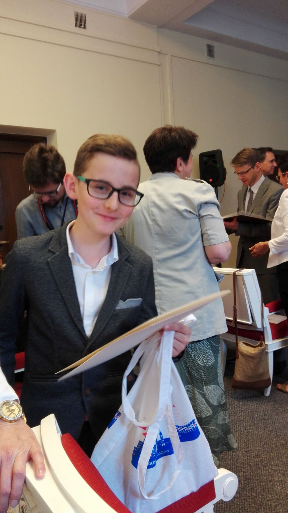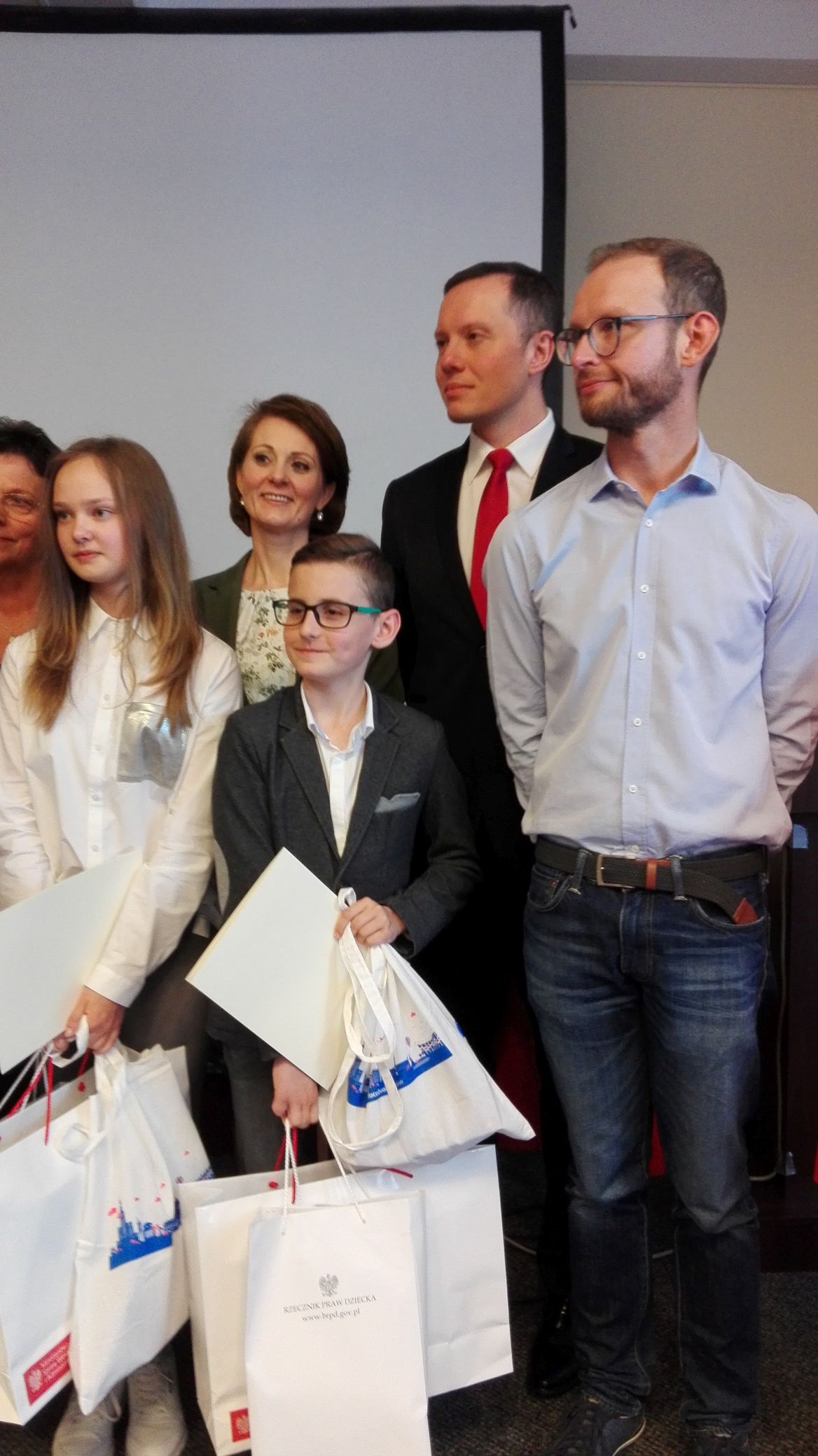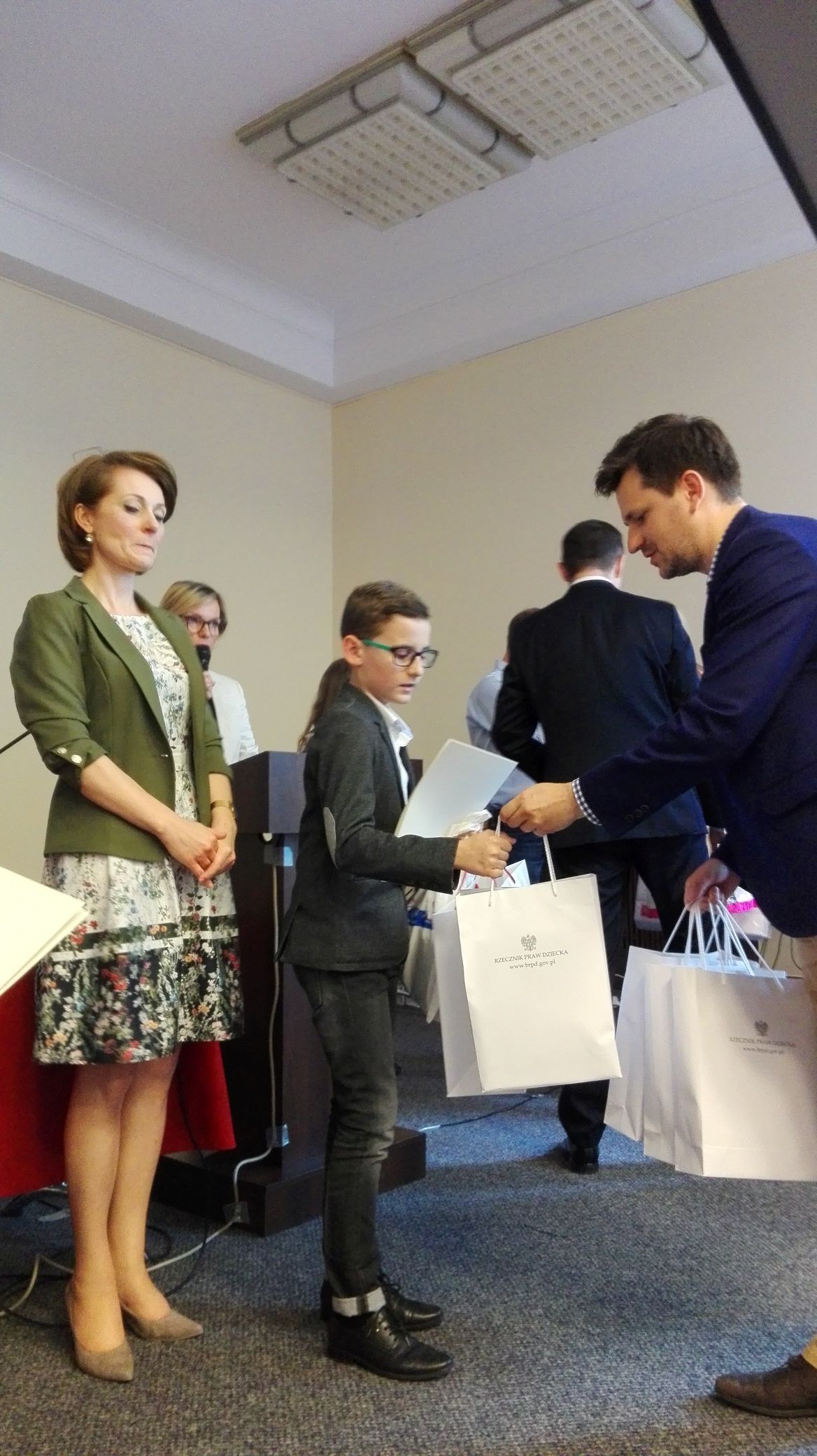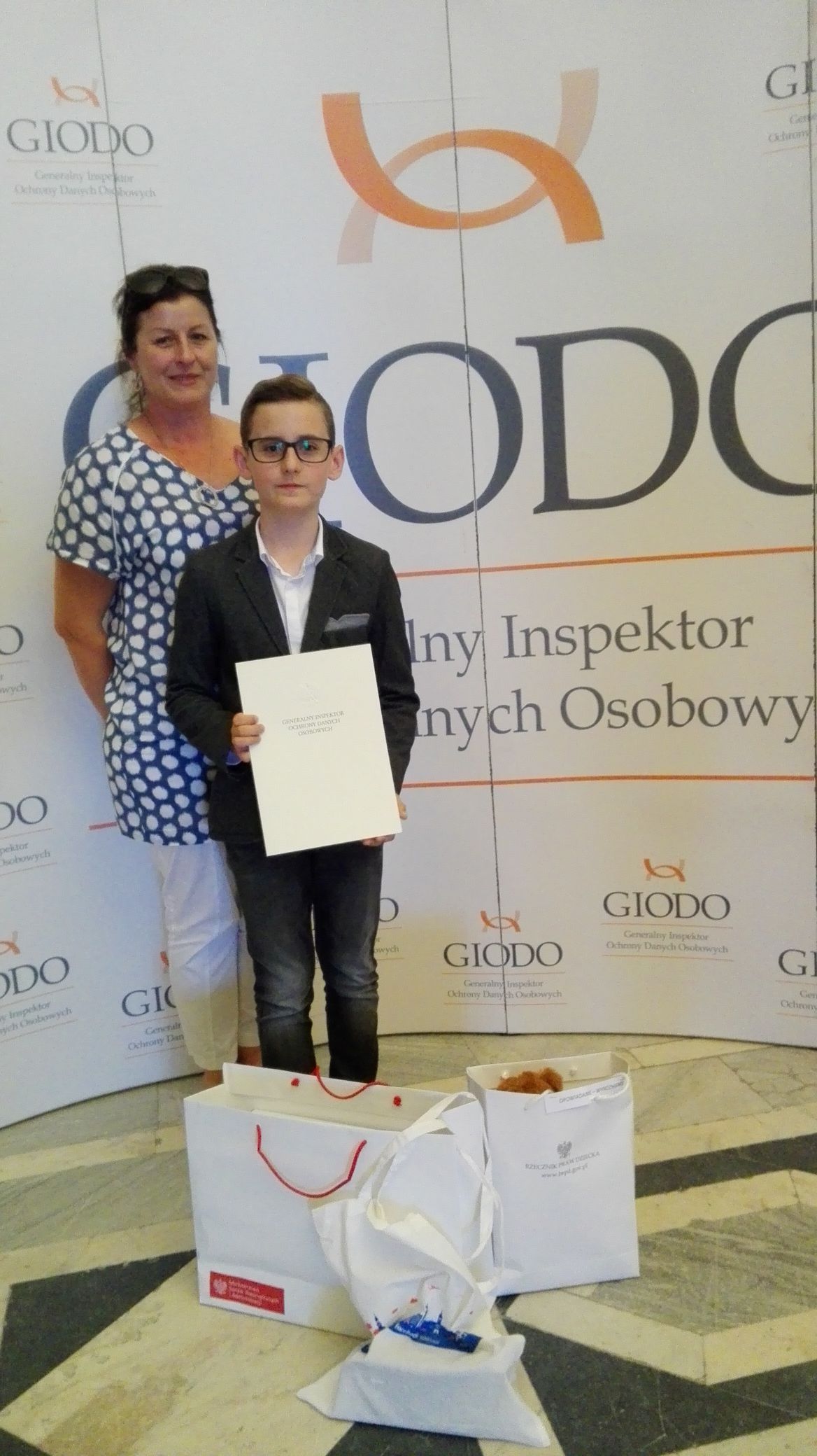 Na podstawie realizowanych w szkole przedsięwzięć, uwrażliwieniu się na temat ochrony danych osobowych, wielu uczniów przystąpiło do konkursu na opowiadanie. Praca Igora Jasnowskiego z klasy 5b okazała się doskonała pod względem literackim. Wyobraźnia i pomysł ukazania tematu sprawił, że Igor zdobył wyróżnienie i był jednym spośród 7 osób wyróżnionych na tle całej Polski na 135 prac, które zostały zakwalifikowane do ostatniego etapu konkursu GIODO. Uroczyste podsumowanie Programu wraz z wręczeniem nagród odbyło się 6 czerwca w Warszawie w Pałacu Kultury i Nauki. Nagrody wręczali: Minister Cyfryzacji GIODO dr Edyta Bielak-Jomaa, Rzecznik Praw Dziecka Marek Michalak oraz Lew Starowicz w imieniu Minister Edukacji Narodowej. Zdobyte wyróżnienie, udział w podsumowaniu całej kampanii, obecność znamienitych osób to dla Igora niezapomniane chwile, tym bardziej że uczniowie nagrodzeni i wyróżnieni czytali swoje prace na głos przed całym audytorium. Praca Igora napisana w sposób bardzo swobodny, ukazująca zwykłe rodzinne zamieszanie, podczas którego okazało się jak ważna jest ochrona danych osobowych, jest dowodem na to, że ochrona danych i wiedza na ten temat ma szanse stać się od najmłodszych lat nawykiem podobnie jak odrabianie lekcji. Igor na wręczenie nagród do Warszawy pojechał pod opieką swojego taty Marcina Jasnowskiego, którym towarzyszyła koordynator kampanii GIODO w SP1 pani Ewa Kulesza. Jeszcze raz gratulujemy Igorowi sukcesu, życzymy dalszych twórczych działań.