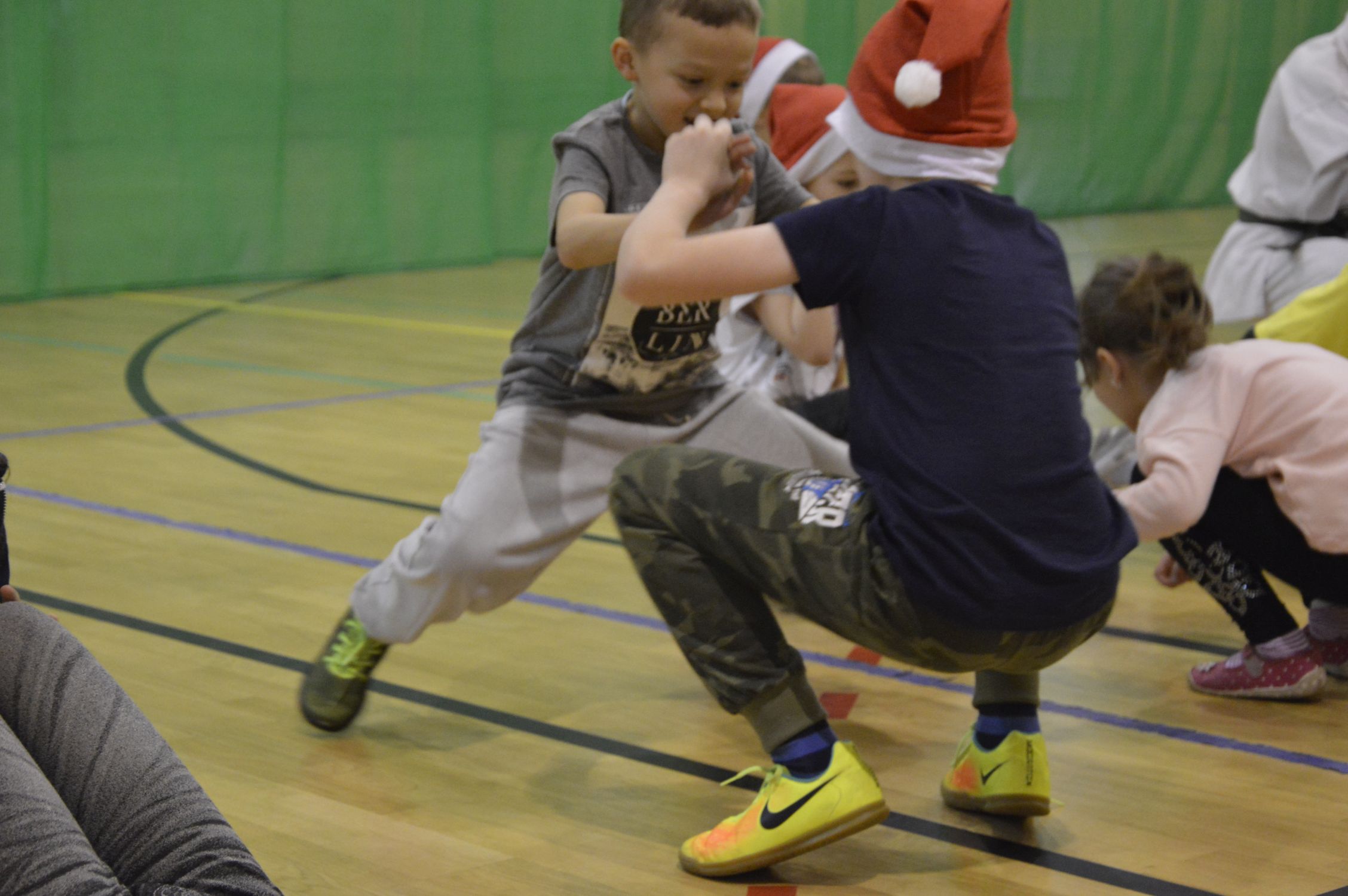 Tegoroczne Mikołajki w klasie 3 b były już trzecimi szkolnymi Mikołajkami. Dzieci z klasy przyzwyczajone są to tego, że ich rodzice mają wspaniałe pomysły na zorganizowanie przeróżnych imprez okolicznościowych. Każda impreza jest inna, nowa, nietypowa, zaskakująca i wywołująca uśmiech na twarzy dzieci oraz dorosłych. W tym roku Mikołajki rozpoczęły się od pokazu umiejętności karateków z Turkowskiego Klubu Sportowego OYAMA Karate pod czujnym okiem pana Włodzimierza Rygierta. Pokaz był ciekawy i interesujący. Zawodnicy wykonywali go z wielką precyzją i zaangażowaniem. Następnym punktem spotkania był udział naszych dzieci w ćwiczeniach karate. Dzieci chętnie włączyły się do ćwiczeń i mini zawodów. Gdy niektórzy pomyśleli, że to koniec klasowych mikołajkowych atrakcji, okazało się, że w łączniku bibliotecznym przy choince czeka na dzieci Święty Mikolaj. Mikołaj wręczył dzieciom mikołajkowe prezenty. W paczkach były słodycze oraz kubki ze zdjęciem całej klasy . To była kolejna udana impreza w klasie 3 b.