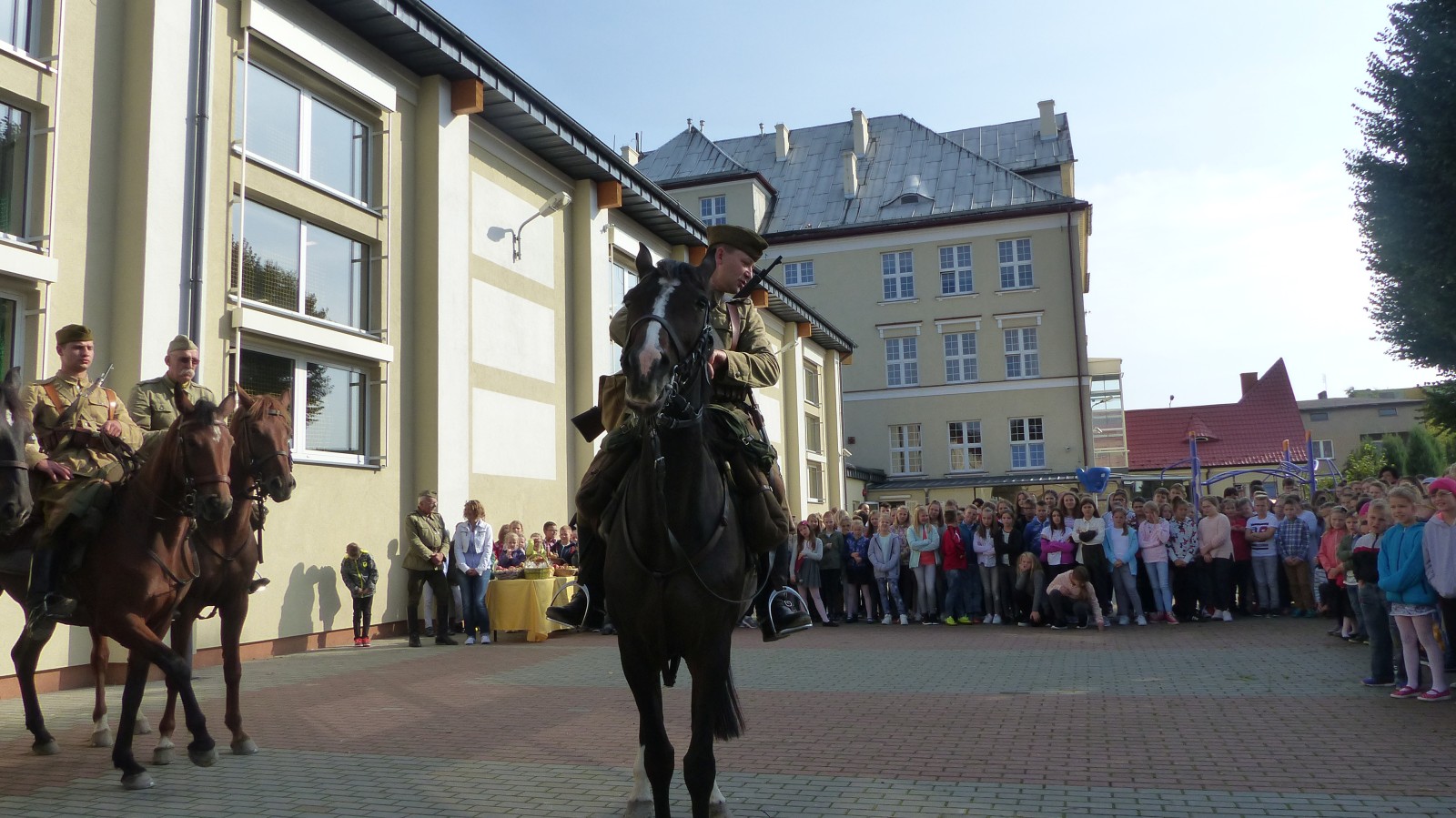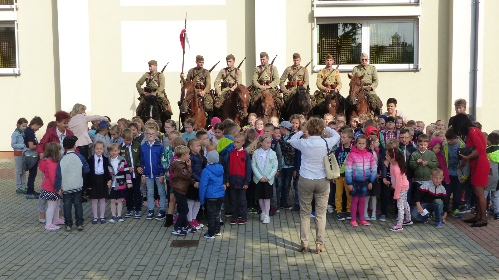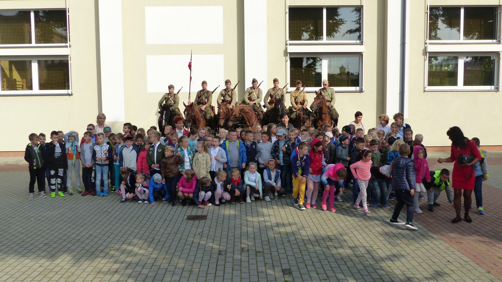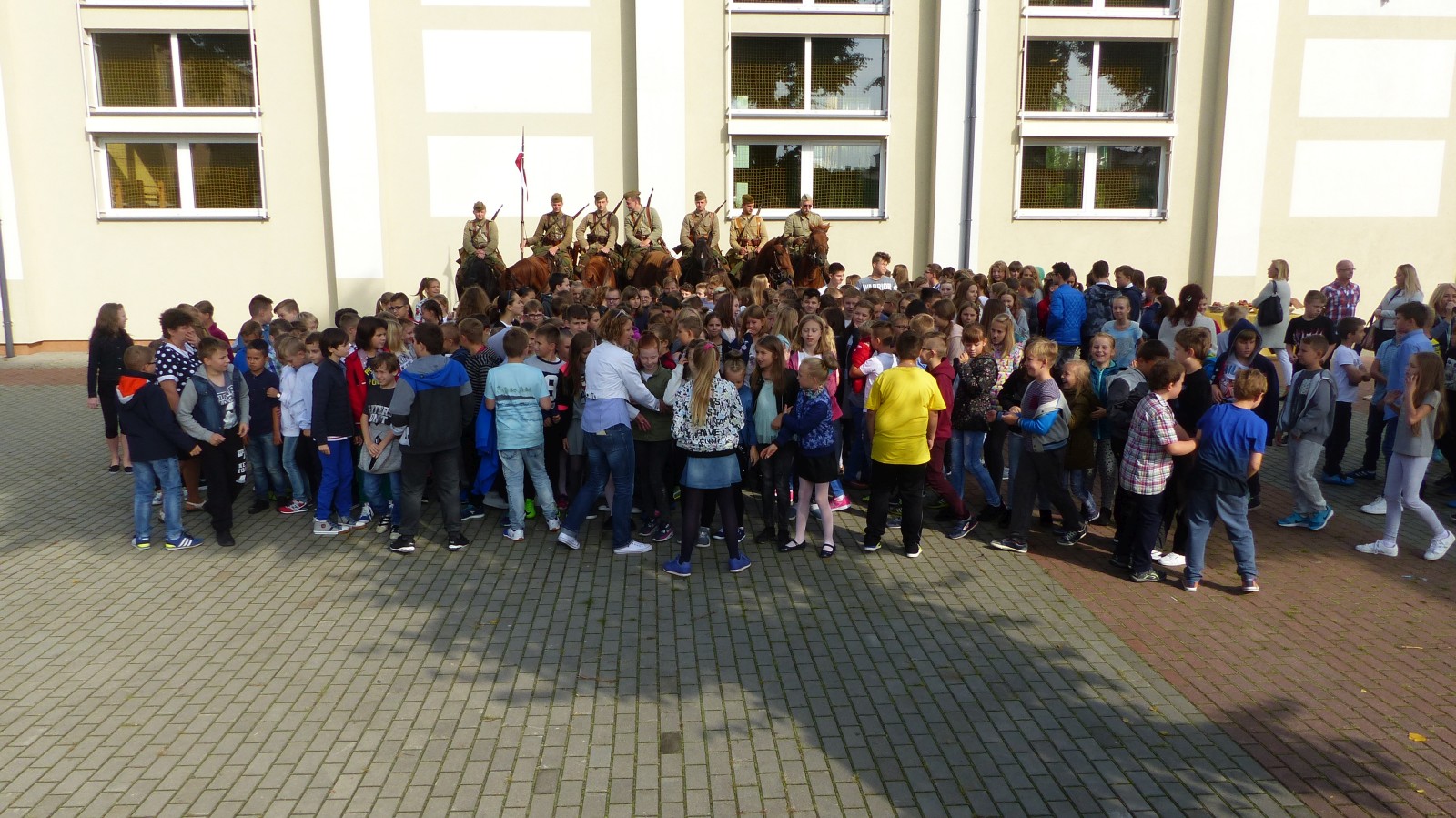 Na szkolnym boisku zgromadzili się uczniowie i nauczyciele, by spotkać się ze swoimi niecodziennymi gośćmi. Spotkanie prowadzili uczniowie klasy 4d Maja Walas i Bartosz Dziamara. Wszystkim spodobały się występy muzyczne klasy 4d oraz Basi Malety i Julii Ziemiańskiej, które zaśpiewały ułańskie pieśni.