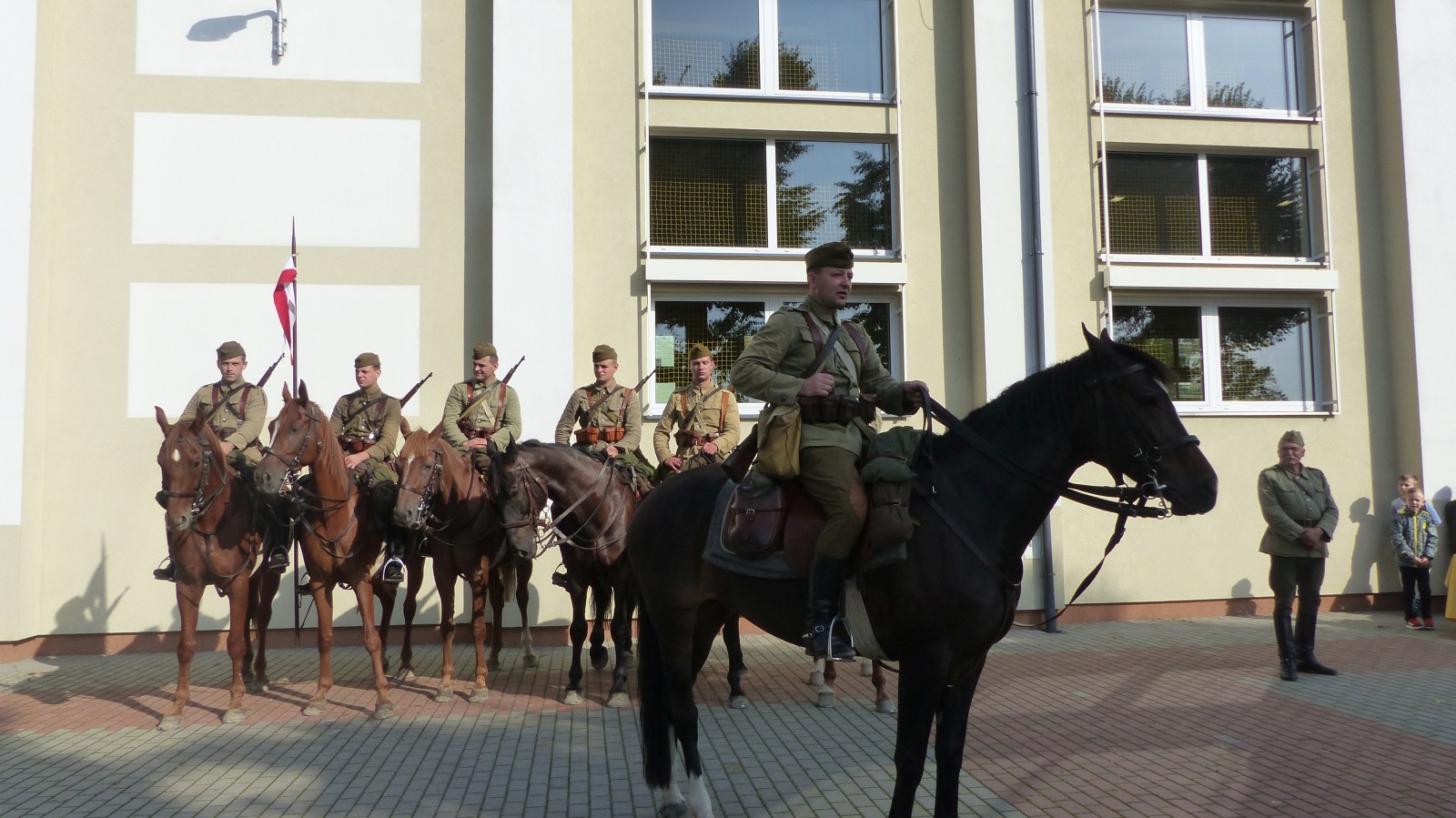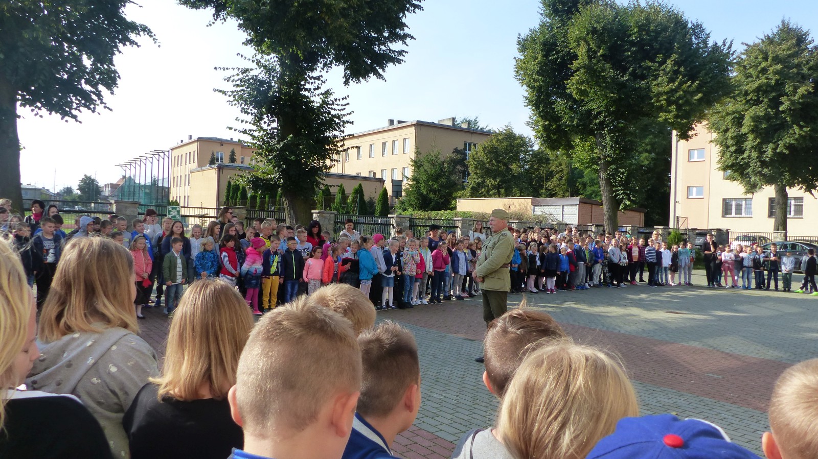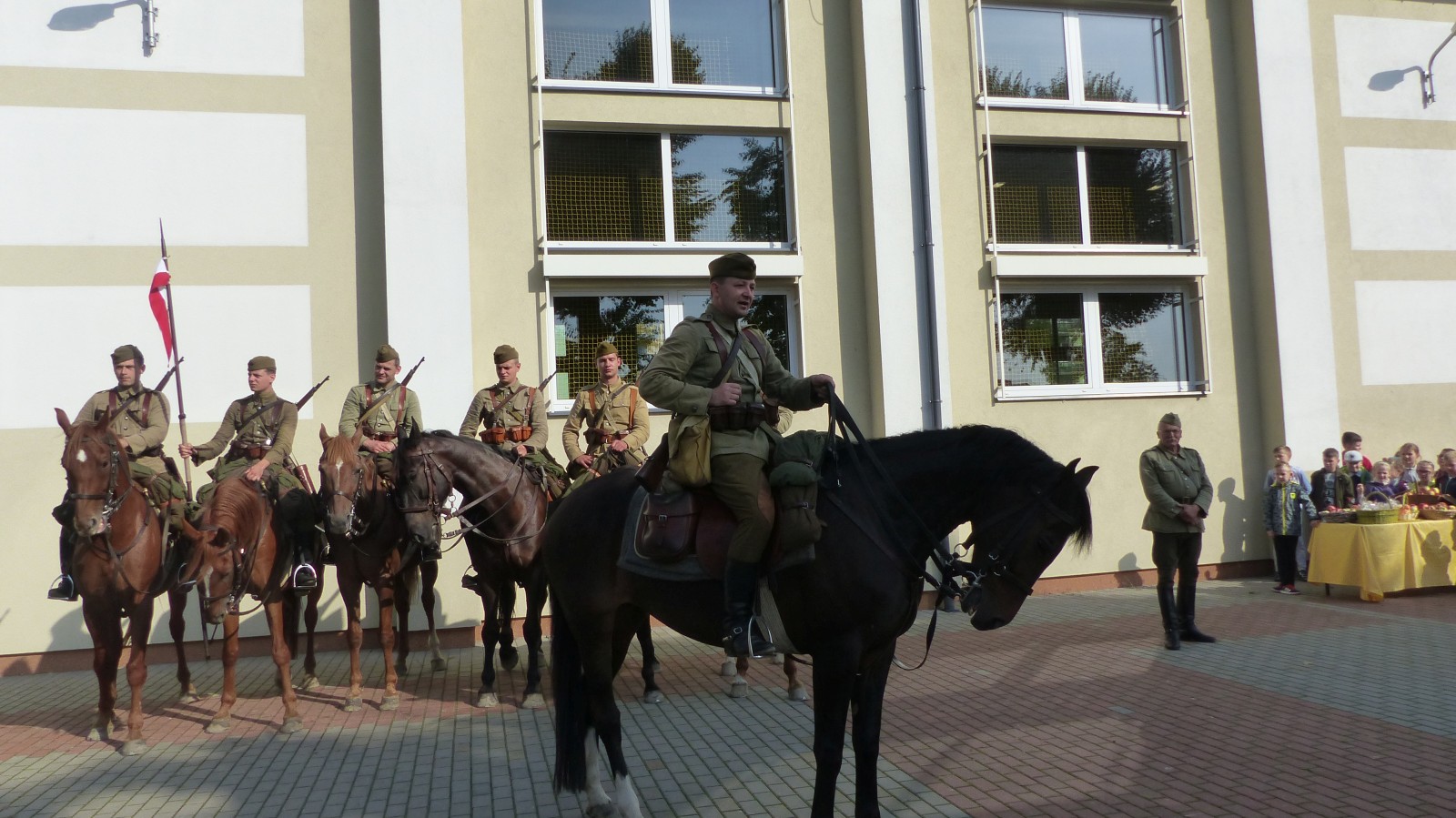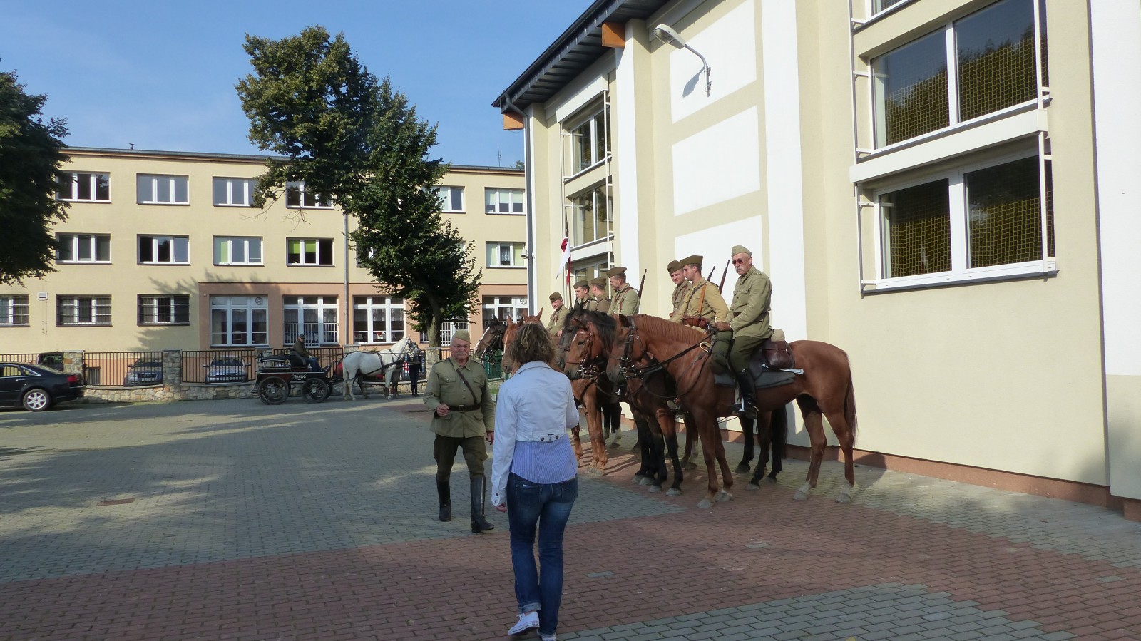 Na szkolnym boisku zgromadzili się uczniowie i nauczyciele, by spotkać się ze swoimi niecodziennymi gośćmi. Spotkanie prowadzili uczniowie klasy 4d Maja Walas i Bartosz Dziamara. Wszystkim spodobały się występy muzyczne klasy 4d oraz Basi Malety i Julii Ziemiańskiej, które zaśpiewały ułańskie pieśni.