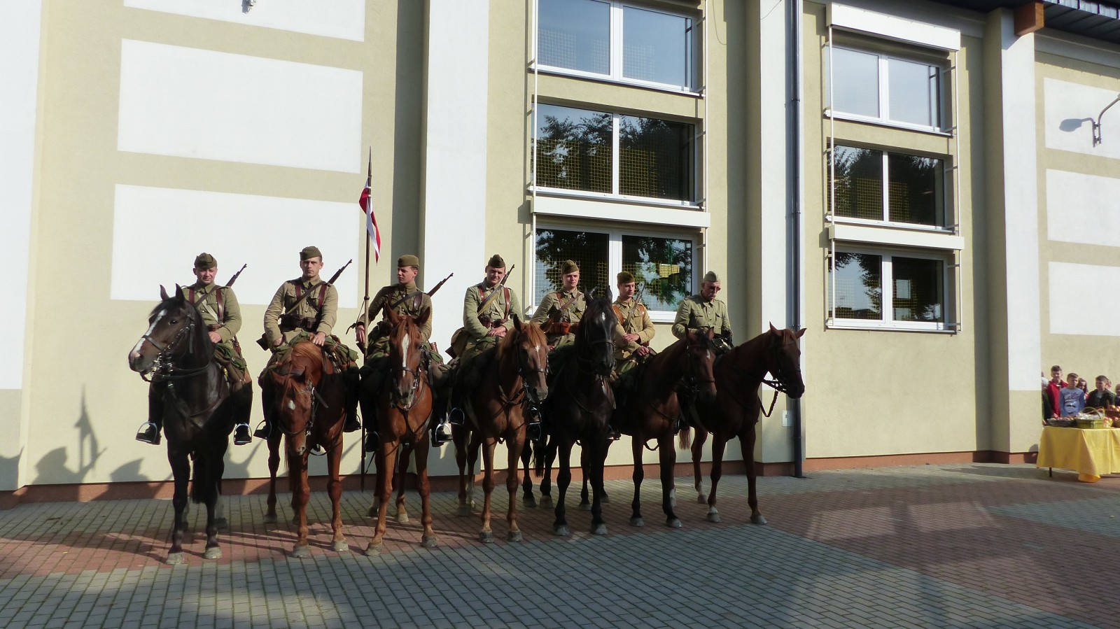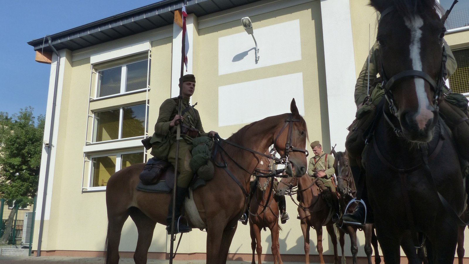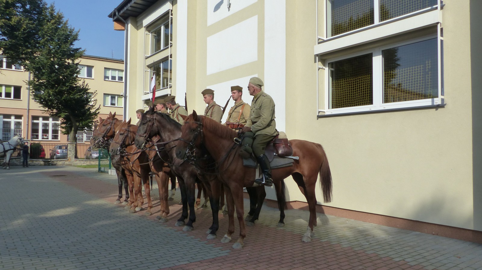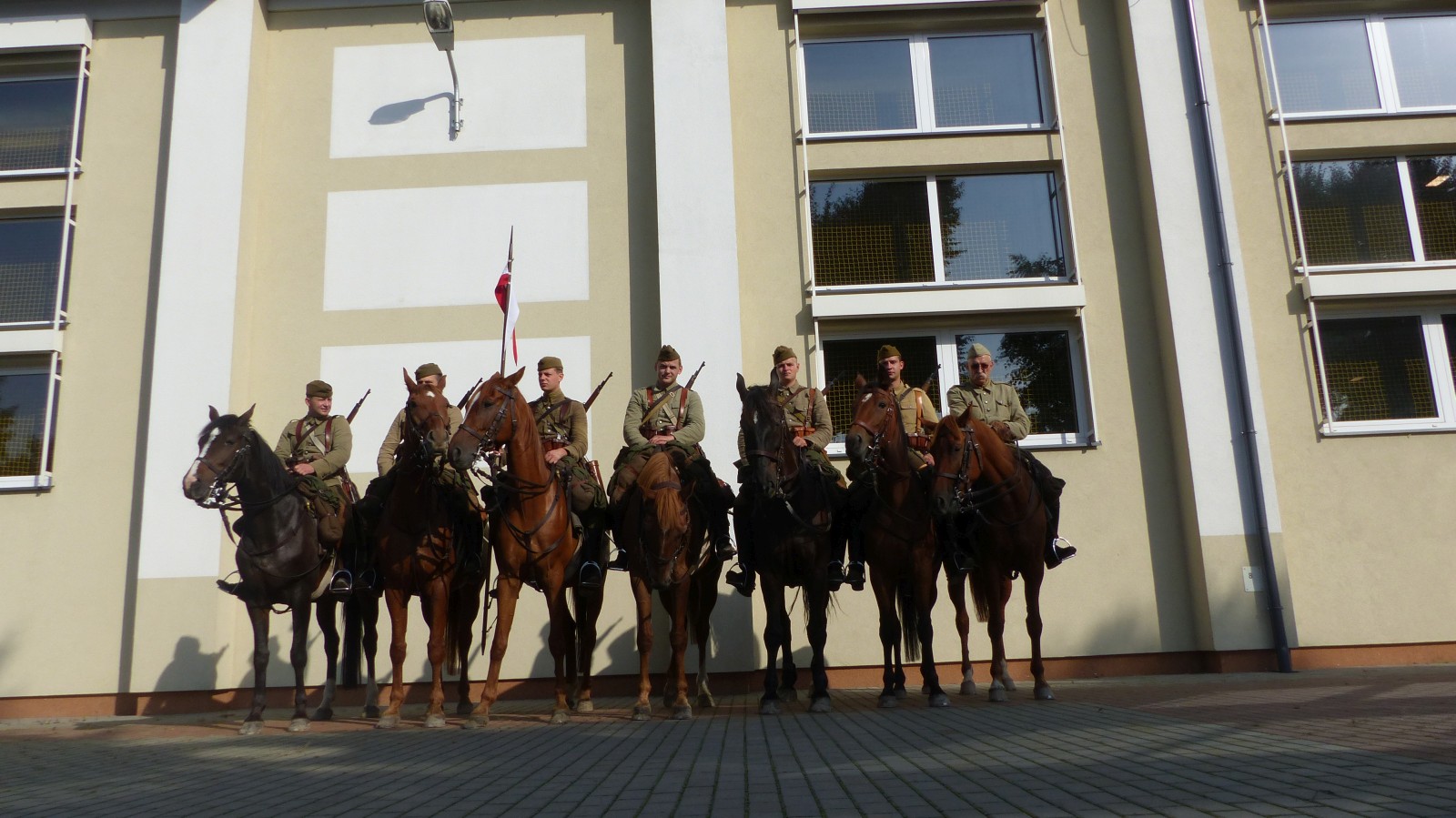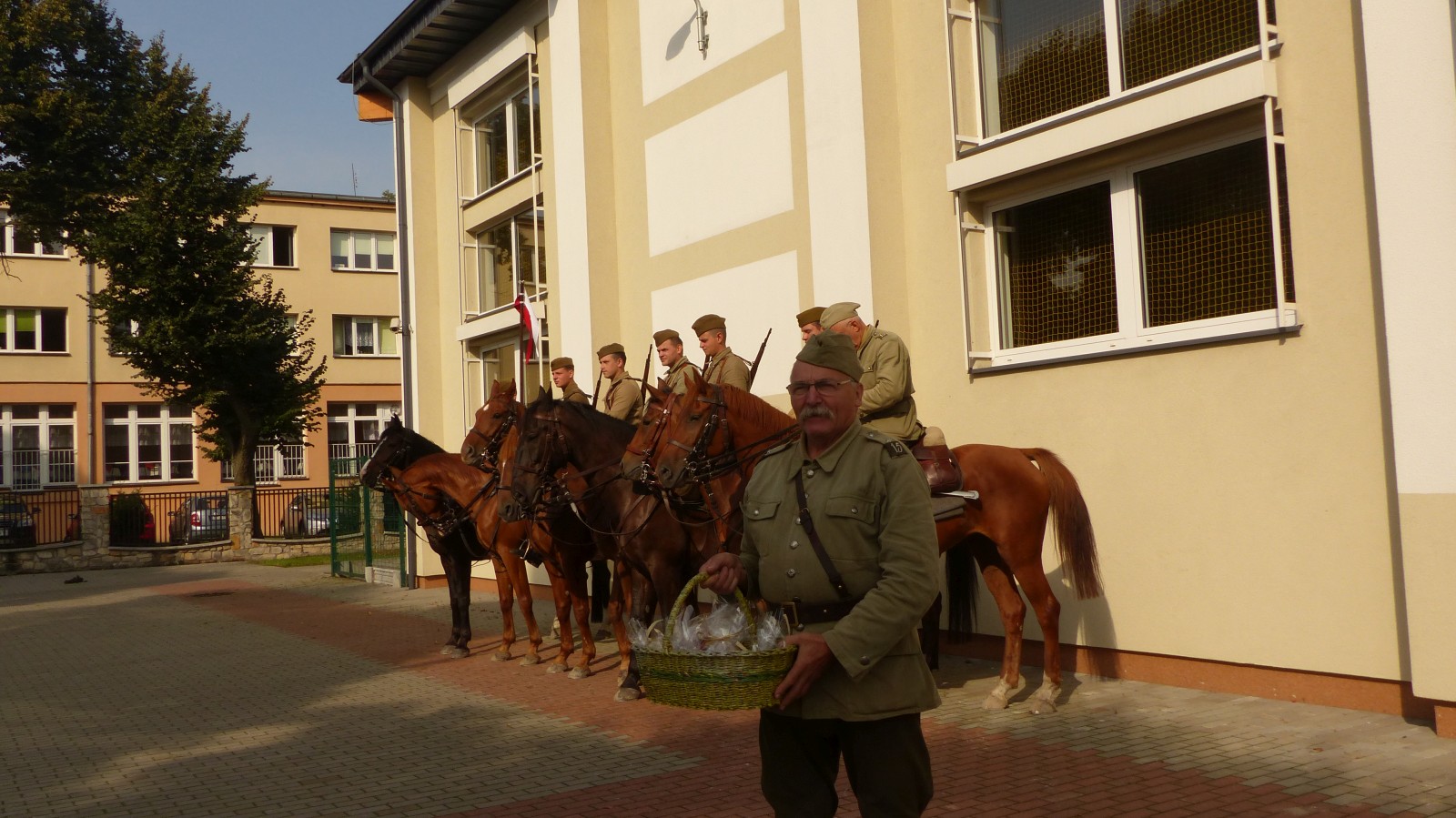 Na szkolnym boisku zgromadzili się uczniowie i nauczyciele, by spotkać się ze swoimi niecodziennymi gośćmi. Spotkanie prowadzili uczniowie klasy 4d Maja Walas i Bartosz Dziamara. Wszystkim spodobały się występy muzyczne klasy 4d oraz Basi Malety i Julii Ziemiańskiej, które zaśpiewały ułańskie pieśni.