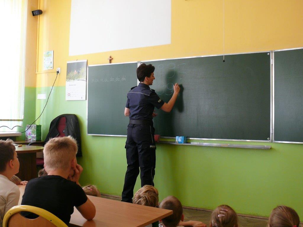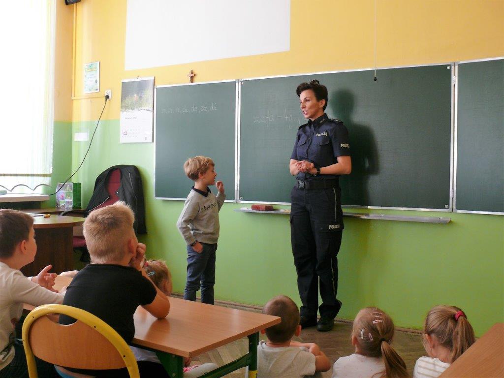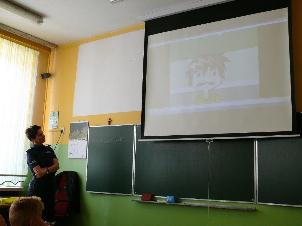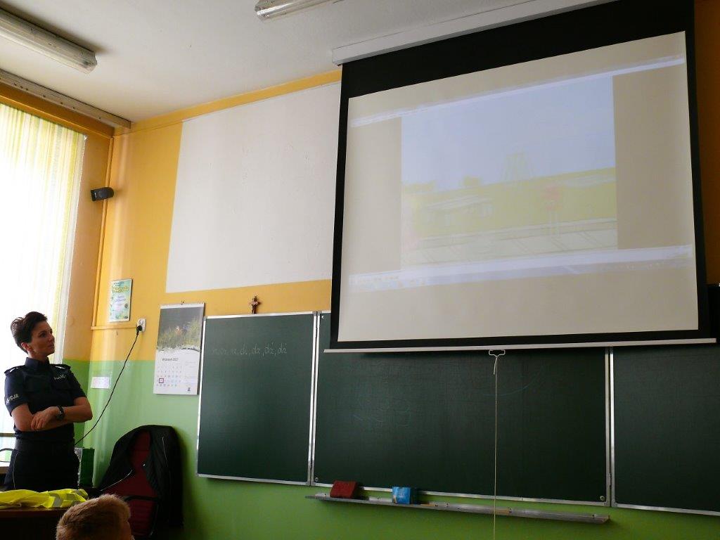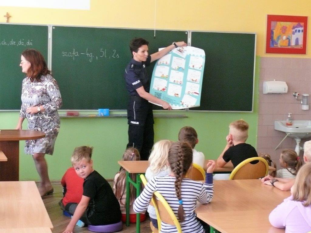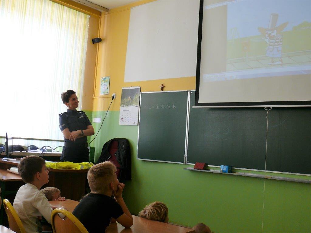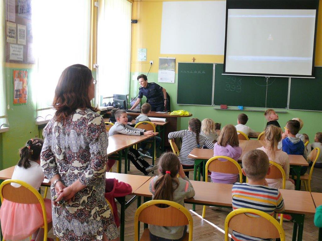 Natomiast w dniu 19 września 2017r. asp. Dorota Grzelka przeprowadziła wśród uczniów klas pierwszych pogadankę na temat „Bezpieczeństwo dzieci w szkole i poza szkołą”. Pierwszaki obejrzały również film , który ukazywał prawidłowe i nieprawidłowe zachowania dzieci. Po tych zajęciach pierwszoklasiści są bardziej świadomi i wiedzą jak się zachować w rozmaitych sytuacjach. Koordynatorem zajęć był pedagog szkolny Bogumiła Frątczak.