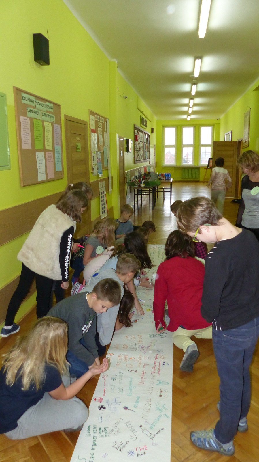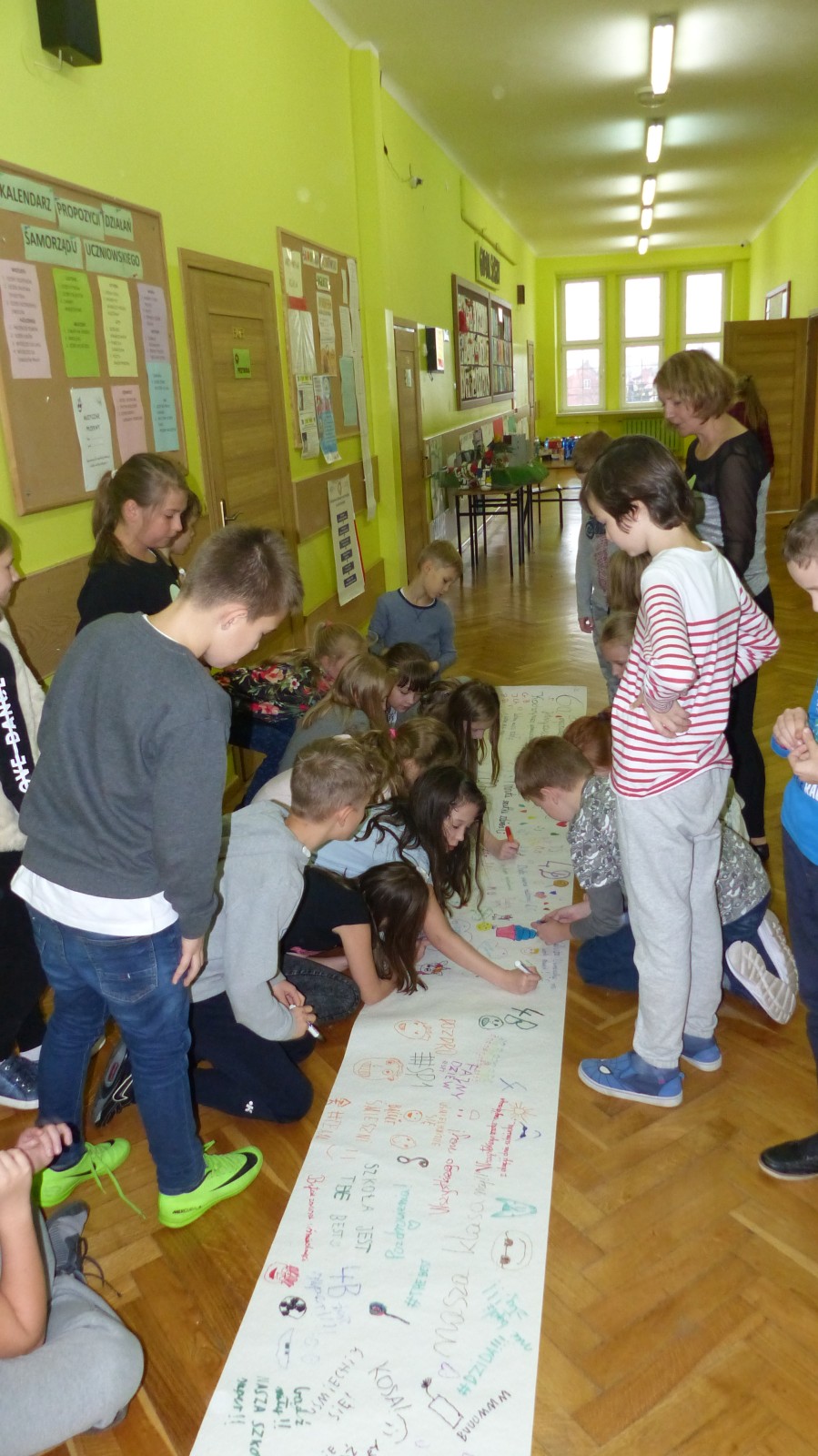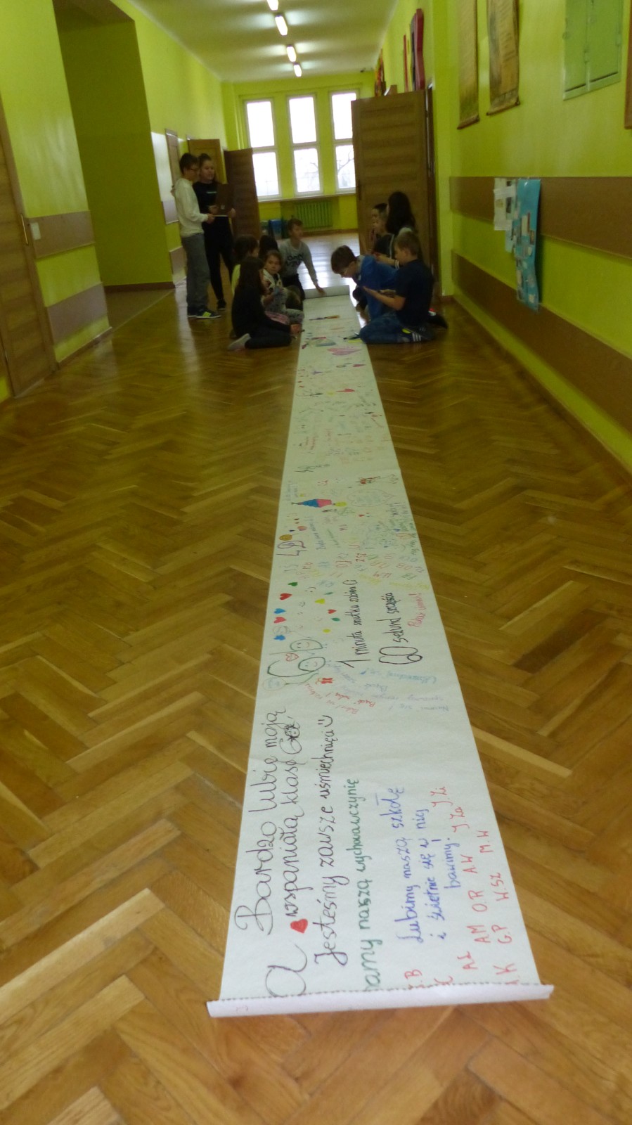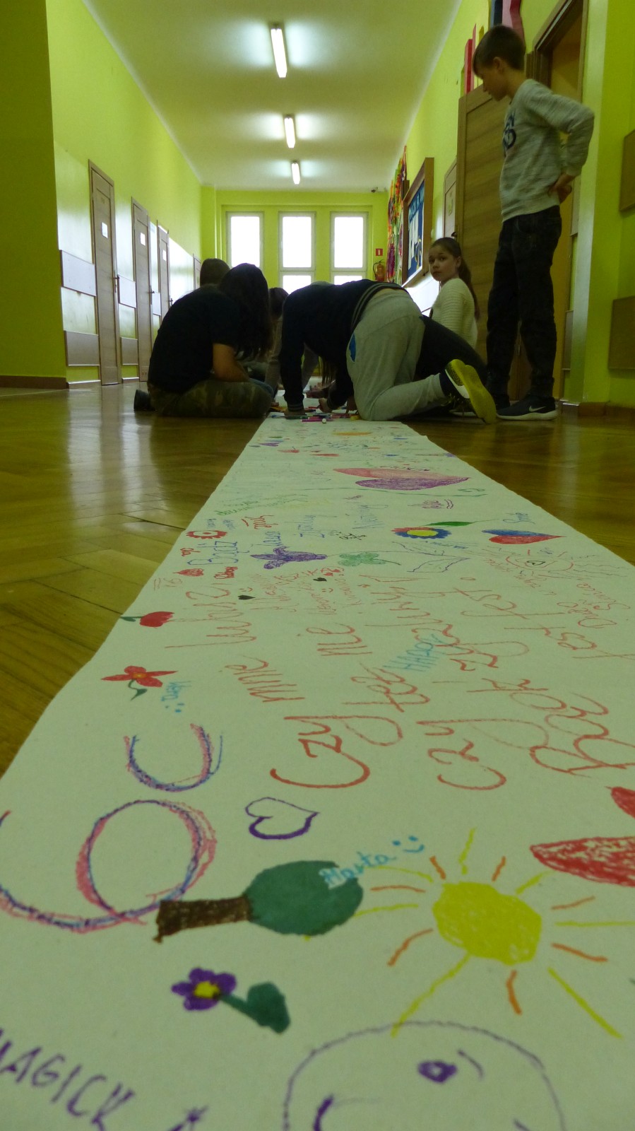 21 listopada 2017r. obchodziliśmy Światowy Dzień Życzliwości i Uśmiechu. W tym dniu razem tworzyliśmy „Mega Życzenia”. Uczniowie klas 4-6 i nauczyciele wpisywali życzenia, życzliwe słowa i hasła dla kolegów, koleżanek oraz bliskich osób. Inicjatorem „Mega Życzeń” był Samorząd Uczniowski.