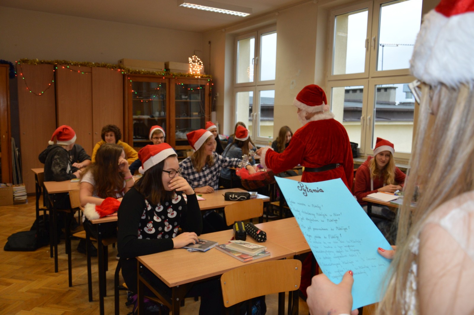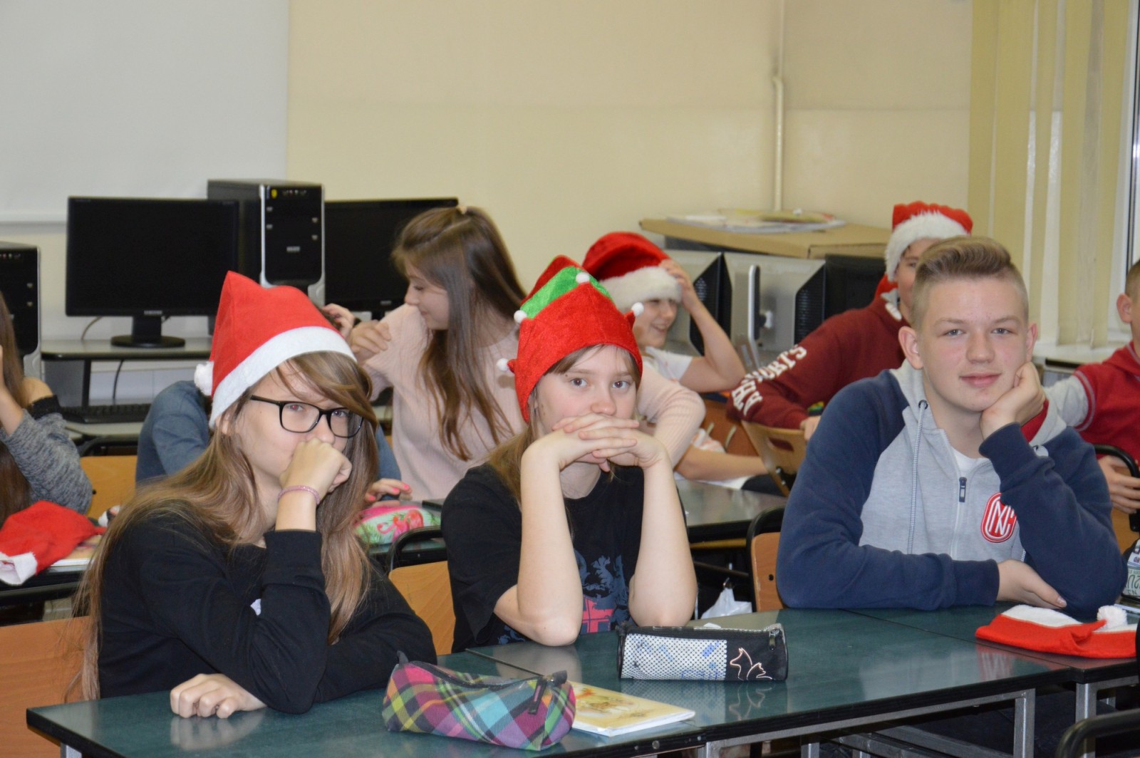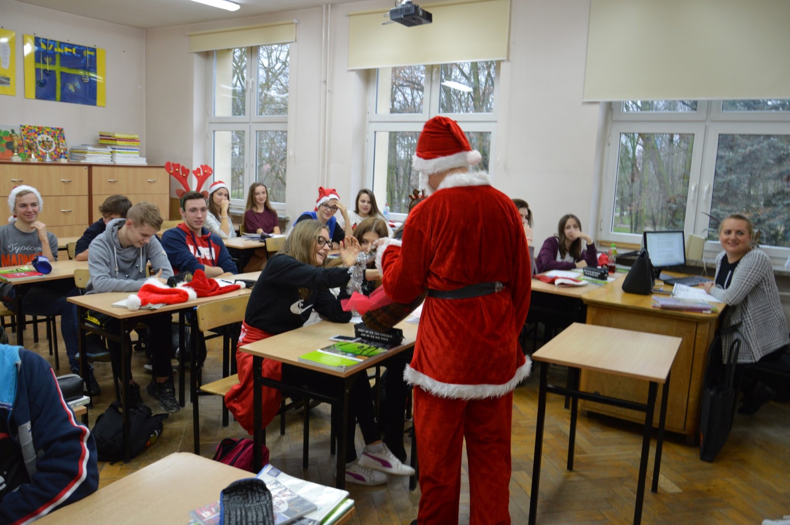 Nie trzeba pytać, na kogo grzeczne dzieci czekają 6 grudnia, bo wszyscy doskonale wiedzą, że na św. Mikołaja. W tym dniu nasza szkoła przeżyła prawdziwą inwazję Mikołajów. Można było ich spotkać dosłownie wszędzie. Okazało się, iż grzecznych dzieci w naszej szkole nie brakuje, bowiem do każdej klasy zawitał Mikołaj wraz ze Śnieżynkami. Zadawał uczniom pytania i za każdą dobrą odpowiedź nagradzał ich cukierkami. Dodatkowo, całą tę radosną atmosferę urozmaiciły ,,muzyczne przerwy” utrzymane w konwencji bożonarodzeniowej. Na koniec wszystkim Mikołajom zrobiono pamiątkowe zdjęcie przy pachnącej choince.