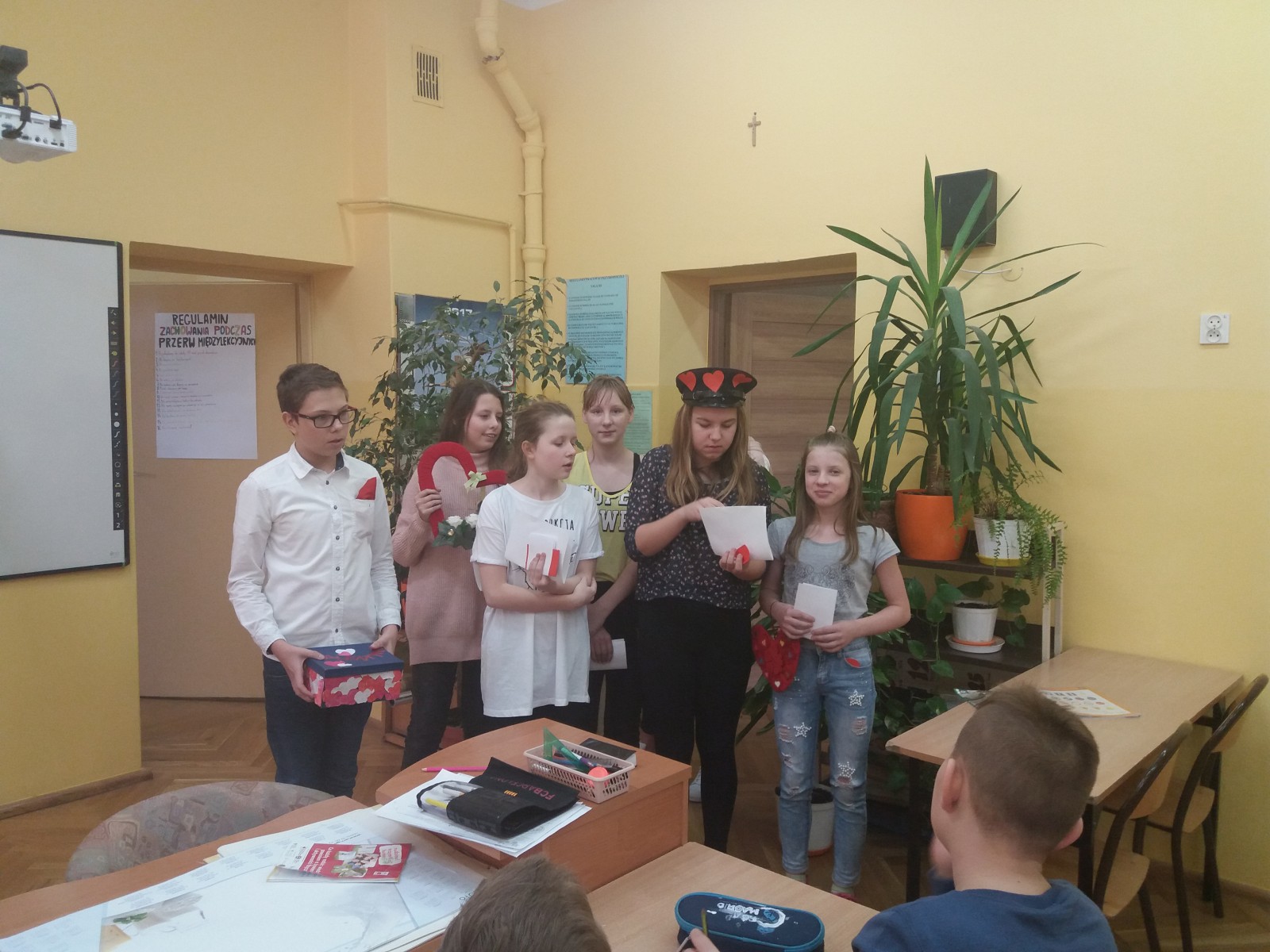 9 lutego w naszej szkole świętowaliśmy Walentynki, które obchodzone są w wielu krajach na świecie jako Dzień Zakochanych. Z tej okazji Samorząd Uczniowski urozmaicił nam czas spędzony w szkole organizując różne atrakcje. Uczniowie klasy 4d wykonali taniec walentynkowy. Atrakcją była również poczta walentynkowa, która działała w czwartek i piątek. Każdy uczeń mógł napisać życzenia do wybranej osoby, a przedstawiciele samorządu postarali się, aby dotarły ona do właściwego odbiorcy.