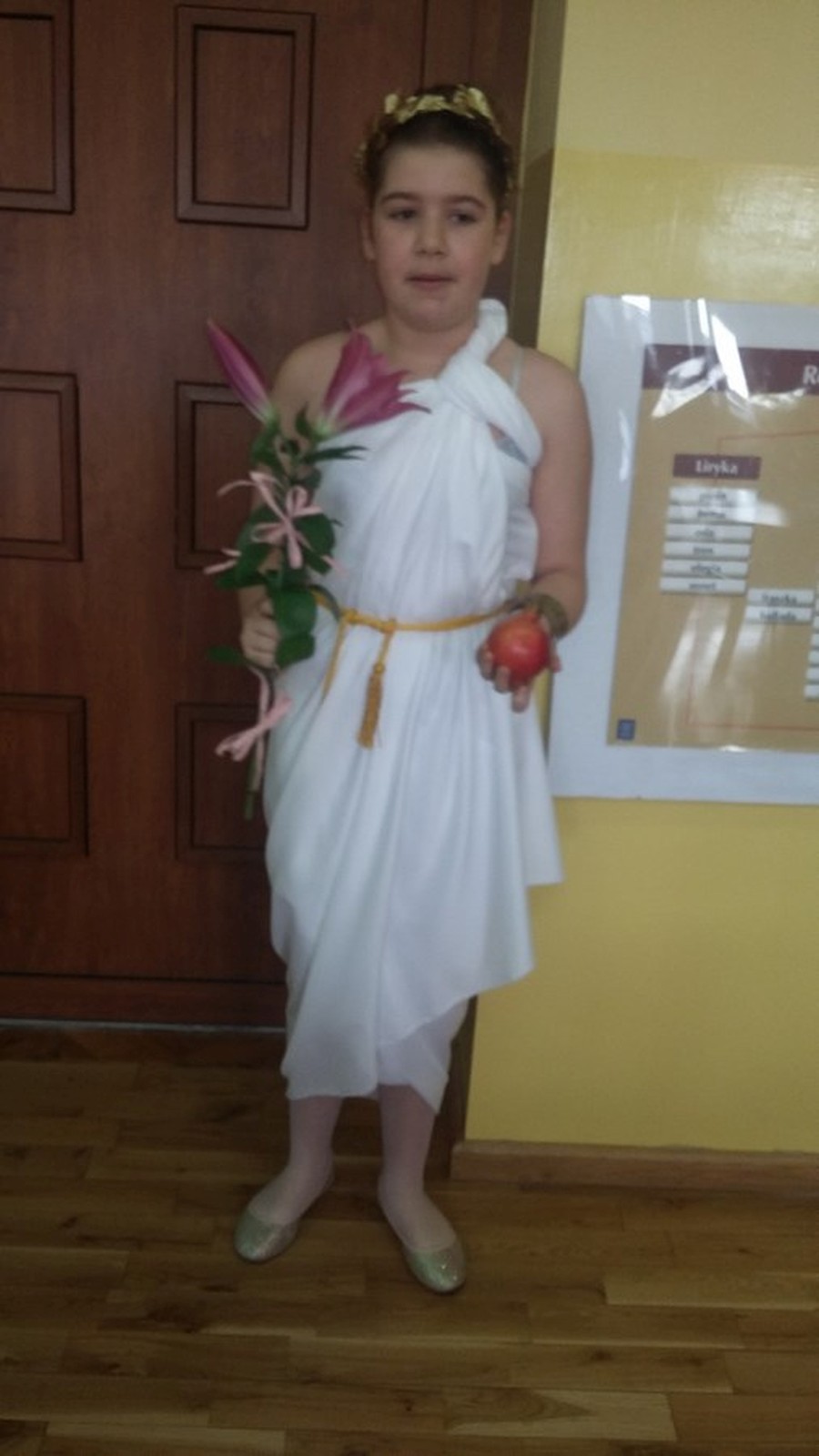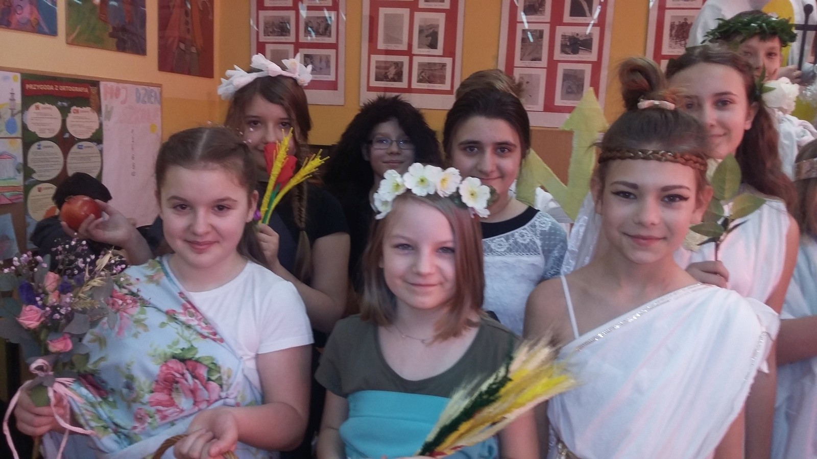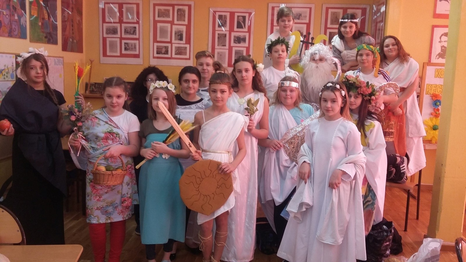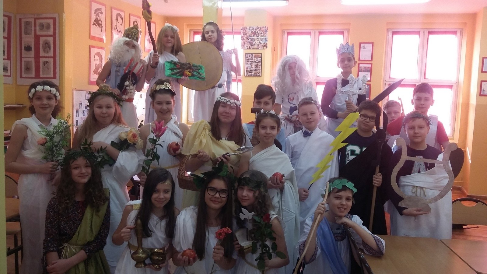 W środę, 21 marca pracownia polonistyczna zamieniła się w siedzibę bogów greckich – Olimp. Uczniowie klasy 5c i 5d wcielili się w postaci z mitologii. Zadaniem było przygotowanie własnoręcznie wykonanego stroju, atrybutu i tekstu na temat wylosowanego boga, najlepiej wygłoszonego z pamięci. Do projektu wszyscy podeszli profesjonalnie. Uczniowie występowali przed swoją klasą, próbowali opanować tremę, uczyli się współpracować w grupie, a wszystko w miłej i serdecznej atmosferze. Przez całą przerwę zakładali stroje: materiały, koce, prześcieradła, a nawet obrusy! Niektóre były wyjątkowe, np. własnoręcznie malowane, barwne i zabawne. Przewiązywali się wstążkami, pomagali sobie, ćwiczyli kwestie. Każdy chciał przedstawić swoją postać jak najlepiej i najciekawiej, aby wszyscy słuchali zdziwieni i zaskoczeni informacjami. Na zakończenie wykonano grupową fotografię.