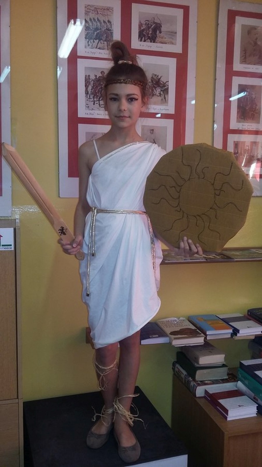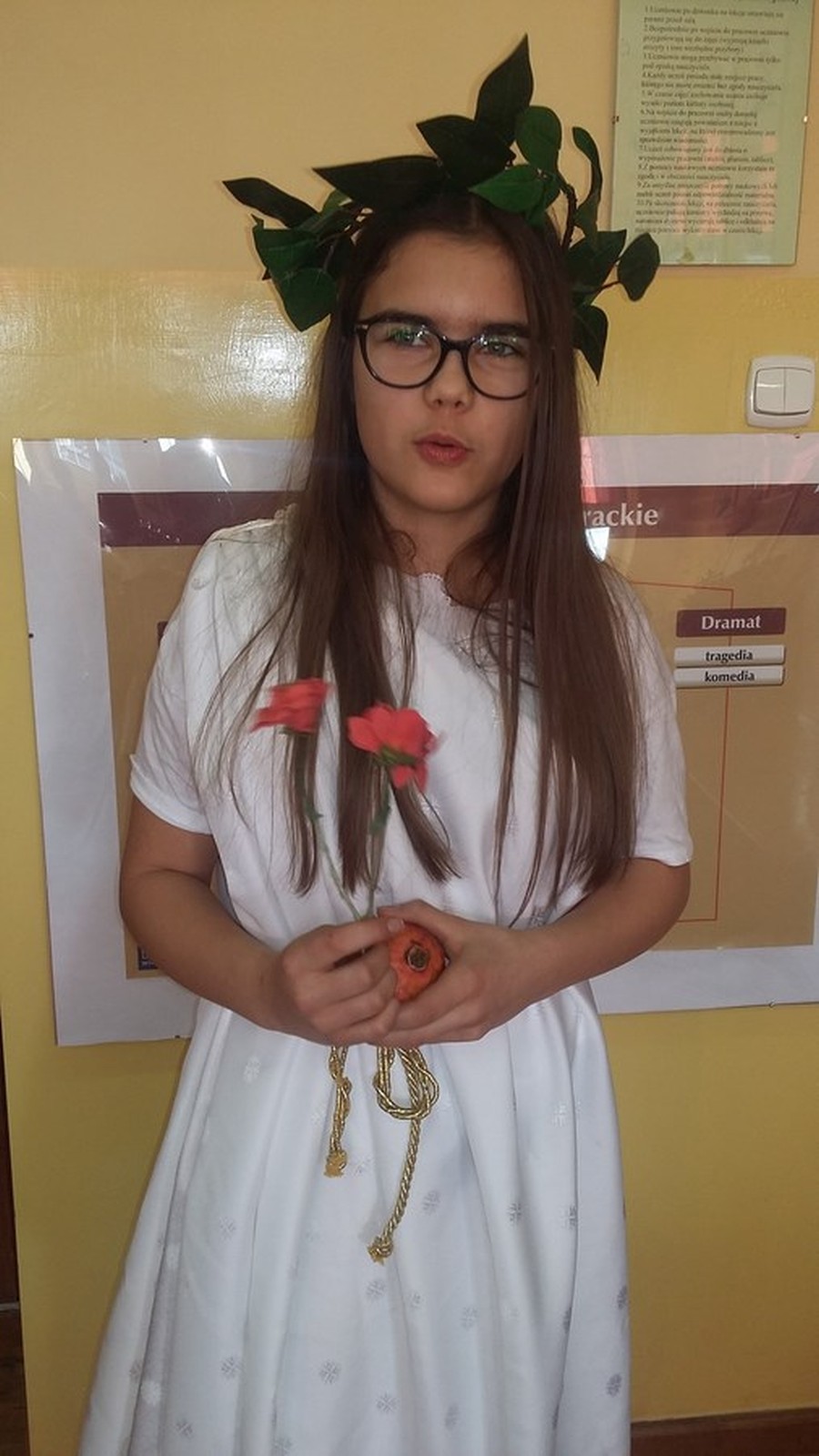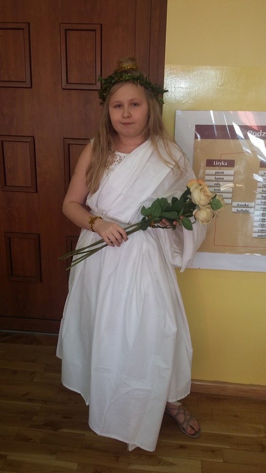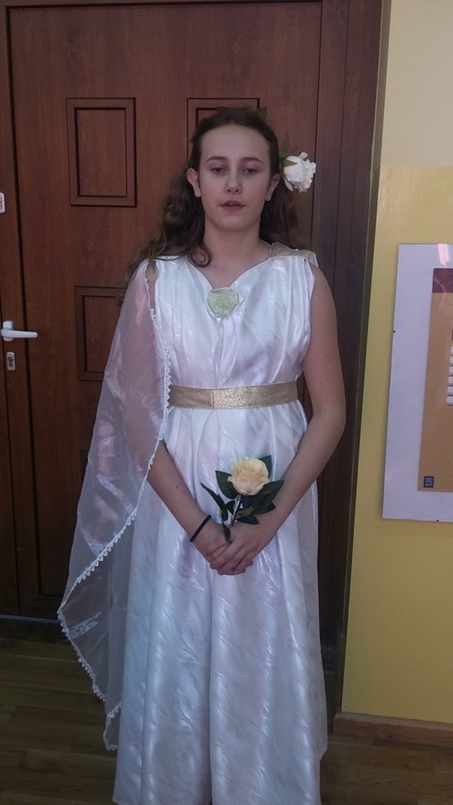 W środę, 21 marca pracownia polonistyczna zamieniła się w siedzibę bogów greckich – Olimp. Uczniowie klasy 5c i 5d wcielili się w postaci z mitologii. Zadaniem było przygotowanie własnoręcznie wykonanego stroju, atrybutu i tekstu na temat wylosowanego boga, najlepiej wygłoszonego z pamięci. Do projektu wszyscy podeszli profesjonalnie. Uczniowie występowali przed swoją klasą, próbowali opanować tremę, uczyli się współpracować w grupie, a wszystko w miłej i serdecznej atmosferze. Przez całą przerwę zakładali stroje: materiały, koce, prześcieradła, a nawet obrusy! Niektóre były wyjątkowe, np. własnoręcznie malowane, barwne i zabawne. Przewiązywali się wstążkami, pomagali sobie, ćwiczyli kwestie. Każdy chciał przedstawić swoją postać jak najlepiej i najciekawiej, aby wszyscy słuchali zdziwieni i zaskoczeni informacjami. Na zakończenie wykonano grupową fotografię.