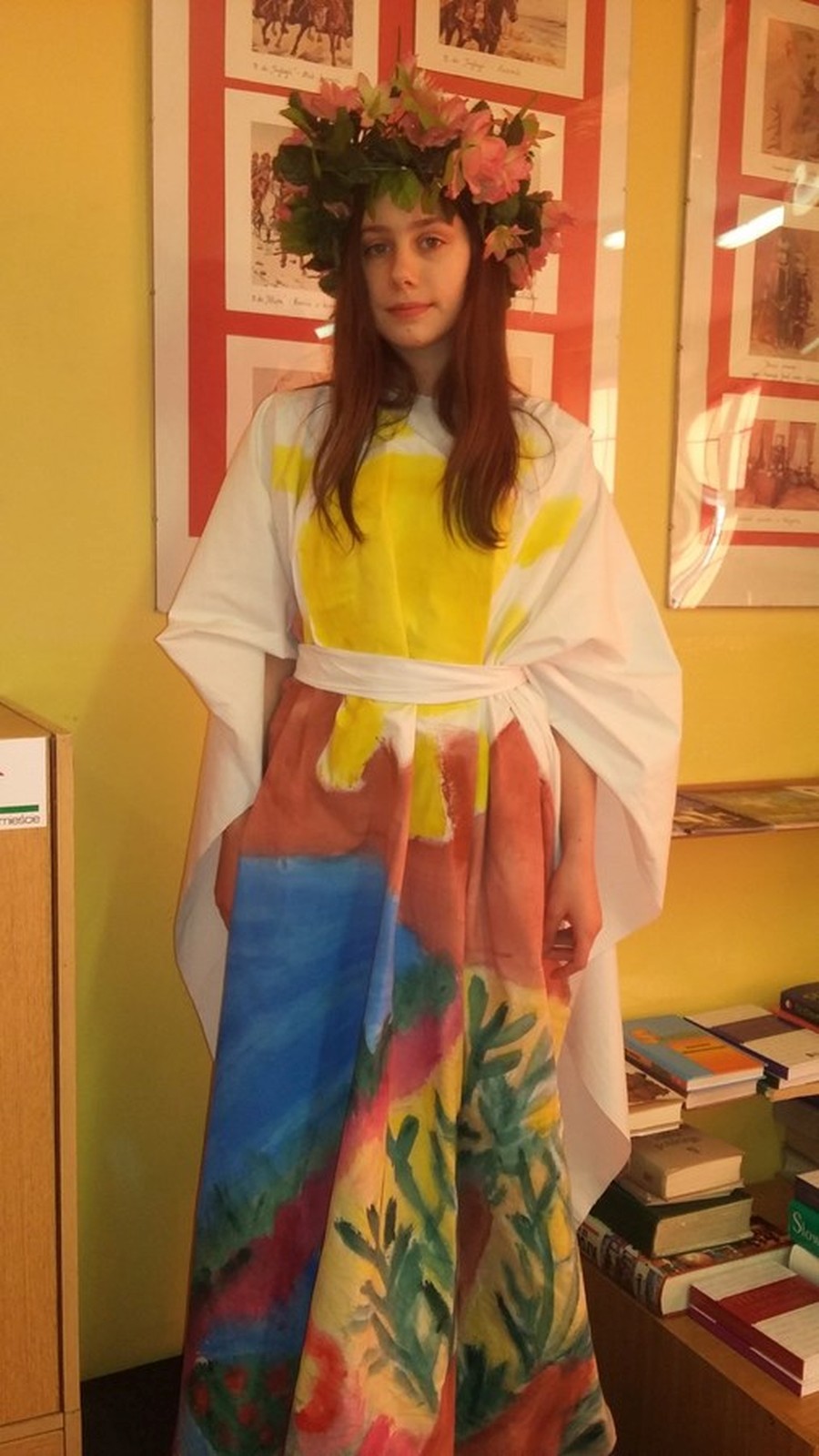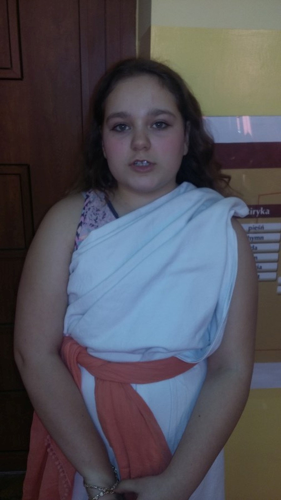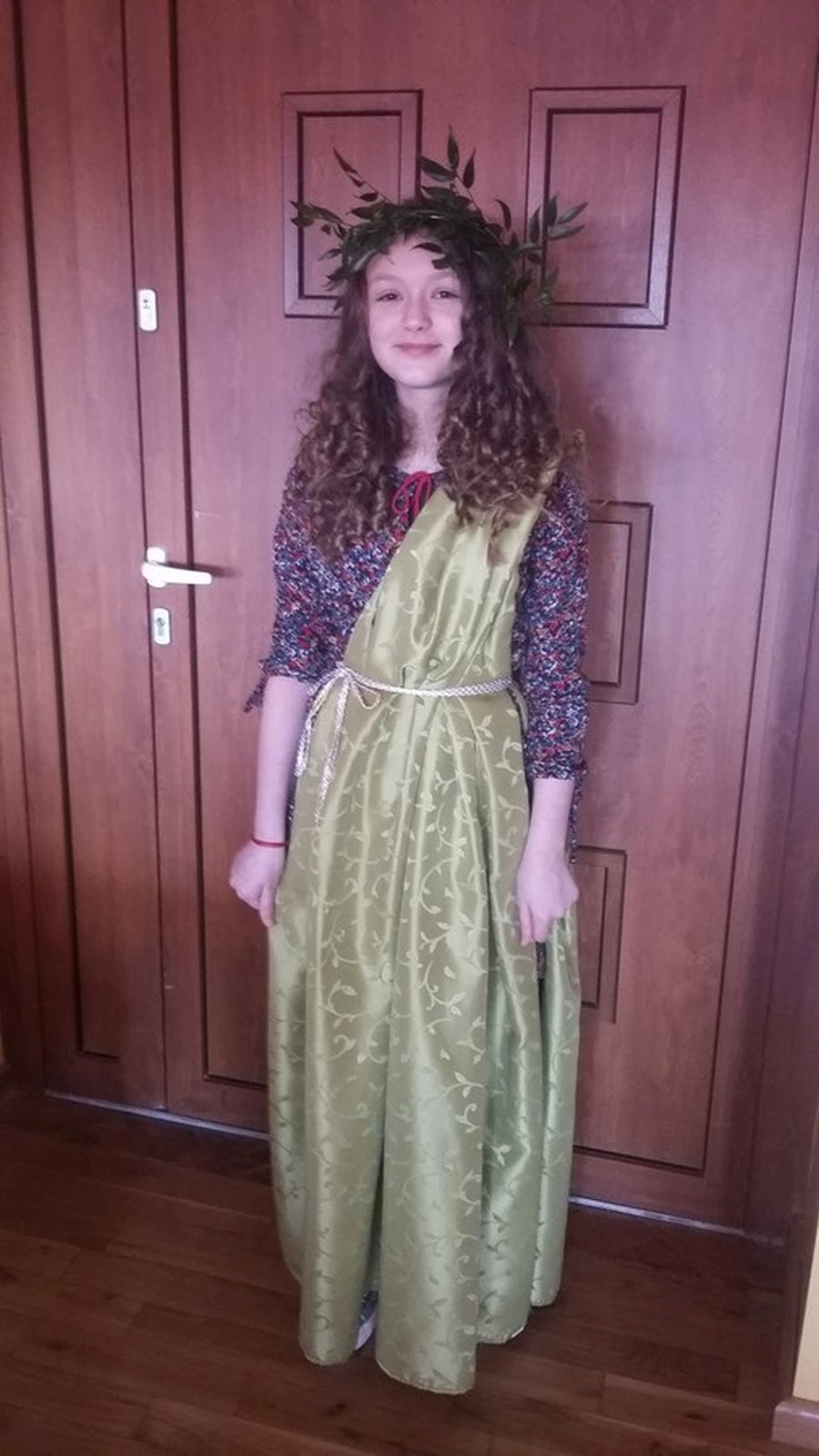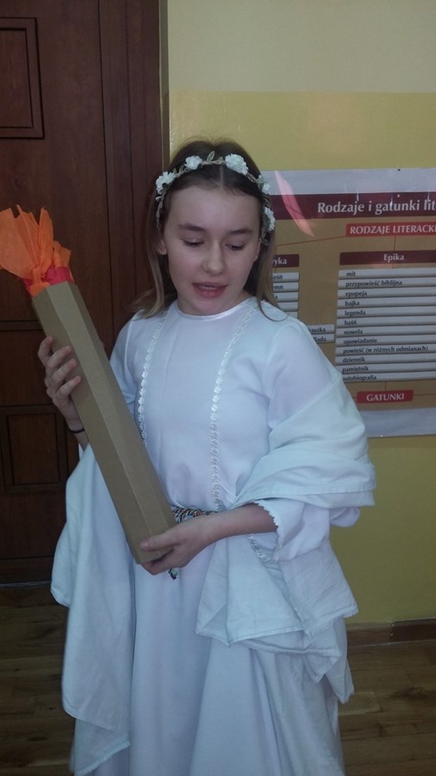 W środę, 21 marca pracownia polonistyczna zamieniła się w siedzibę bogów greckich – Olimp. Uczniowie klasy 5c i 5d wcielili się w postaci z mitologii. Zadaniem było przygotowanie własnoręcznie wykonanego stroju, atrybutu i tekstu na temat wylosowanego boga, najlepiej wygłoszonego z pamięci. Do projektu wszyscy podeszli profesjonalnie. Uczniowie występowali przed swoją klasą, próbowali opanować tremę, uczyli się współpracować w grupie, a wszystko w miłej i serdecznej atmosferze. Przez całą przerwę zakładali stroje: materiały, koce, prześcieradła, a nawet obrusy! Niektóre były wyjątkowe, np. własnoręcznie malowane, barwne i zabawne. Przewiązywali się wstążkami, pomagali sobie, ćwiczyli kwestie. Każdy chciał przedstawić swoją postać jak najlepiej i najciekawiej, aby wszyscy słuchali zdziwieni i zaskoczeni informacjami. Na zakończenie wykonano grupową fotografię.