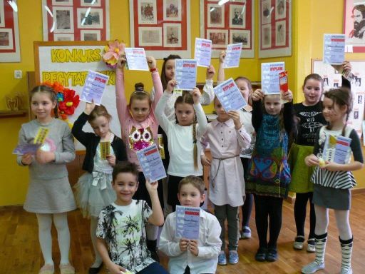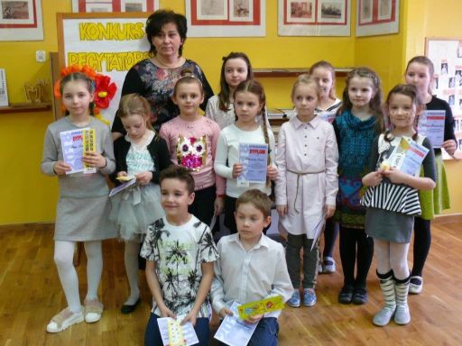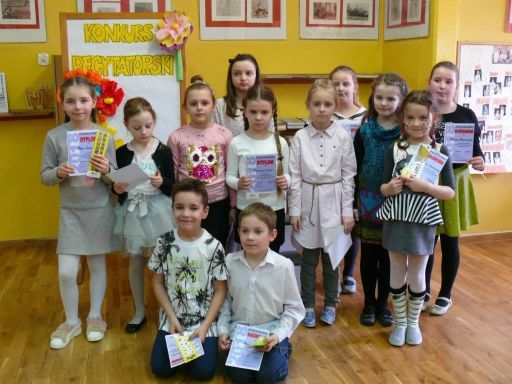 Przez dwie godziny w sali na trzecim piętrze rozbrzmiewała poezja w najlepszym wykonaniu. Podczas konkursu atmosfera między uczestnikami była bardzo miła i koleżeńska. Mimo stresu, wszystkie dzieci świetnie się bawiły, prezentując swój talent recytatorski. Po wysłuchaniu prezentacji komisja artystyczna: Joanna Trembasiewicz, Aldona Piwońska, Emilia Kozłowska, Elżbieta Nowak i Grażyna Sujewicz postanowiła nagrodzić Brunona Grabarę (1d), Gabrielę Marciniak (2c), Amelię Sobczyk (4d), Maję Walas (4d), Paulę Biskup (5c), Nadię Przygońską (6d) i Ninę Grabarę (7d). Laureaci reprezentować będą szkołę w kolejnych etapach konkursu.
