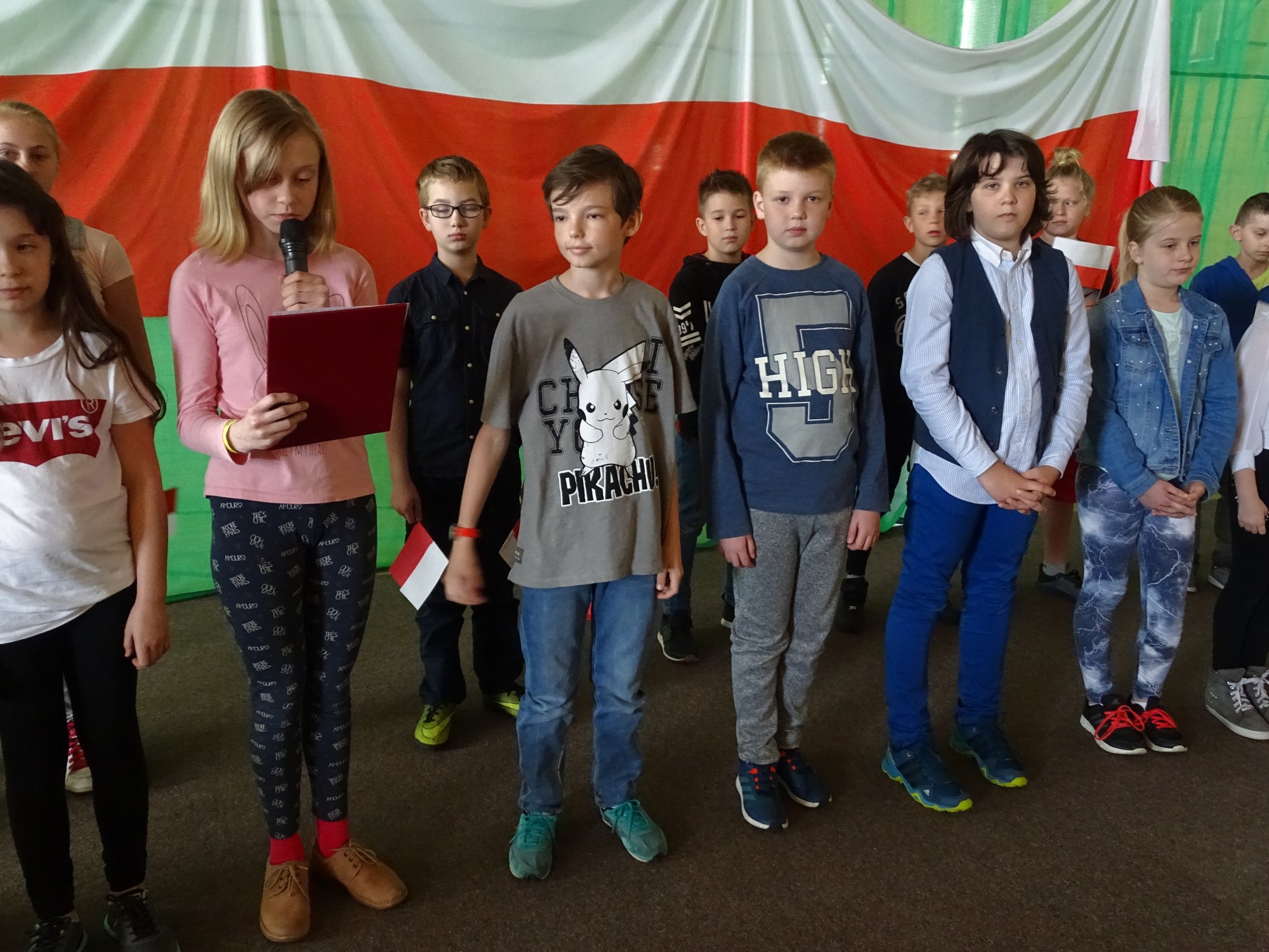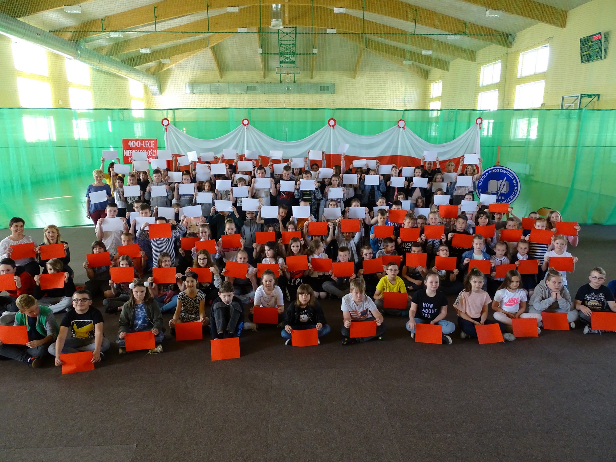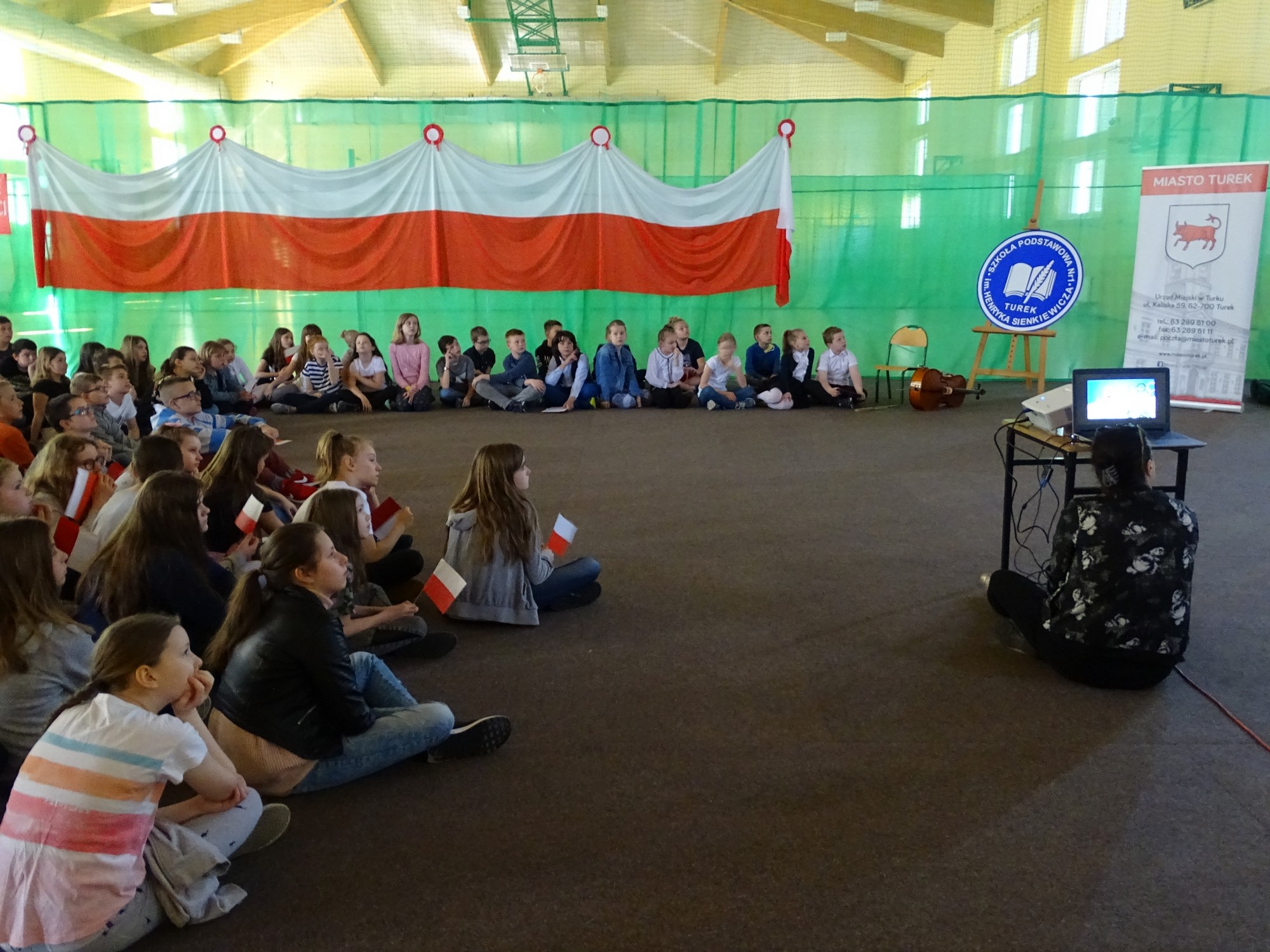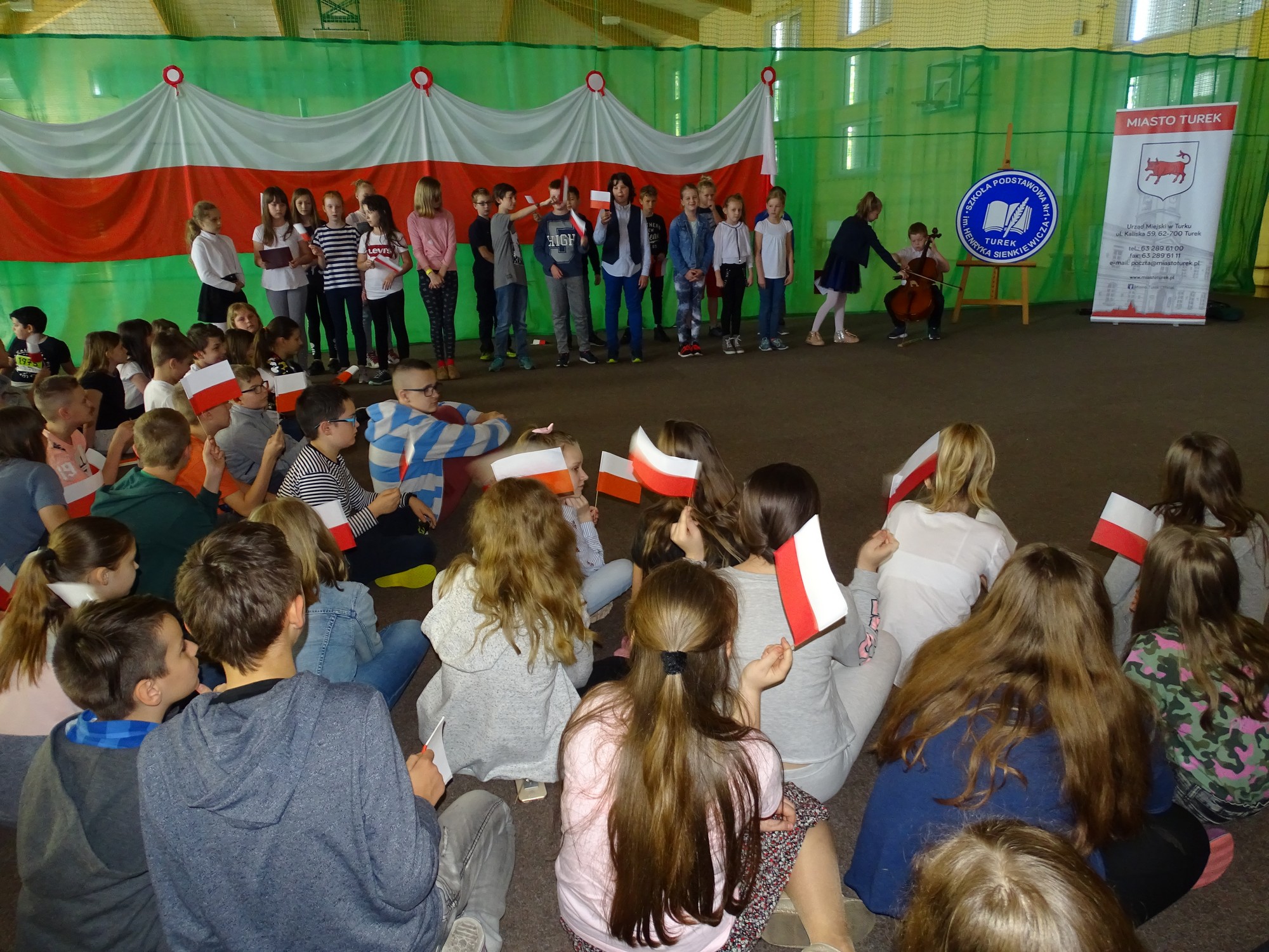 Dla uczczenia Święta Flagi w Rzeczypospolitej Polskiej uczniowie klasy 4d zaprosili dyrekcję, nauczycieli i uczniów ze Szkoły Podstawowej im. Henryka Sienkiewicza w Turku do udziału w happeningu. Uczniowie stworzyli żywą flagę z biało-czerwonych kartek .Uczestnicy poznali historię symboli narodowych ,obejrzeli krótką prezentację, mieli też okazję do wysłuchania utworu pt. „Te Deum” wykonanego na wiolonczeli przez Bartka Dziamarę z klasy 4d. Na koniec, przyjmując odpowiednią postawę, dumnie odśpiewali 4 zwrotki naszego hymnu. W ten sposób społeczność „Jedynki” wyraziła przywiązanie i szacunek do symboli narodowych oraz patriotyzmu.