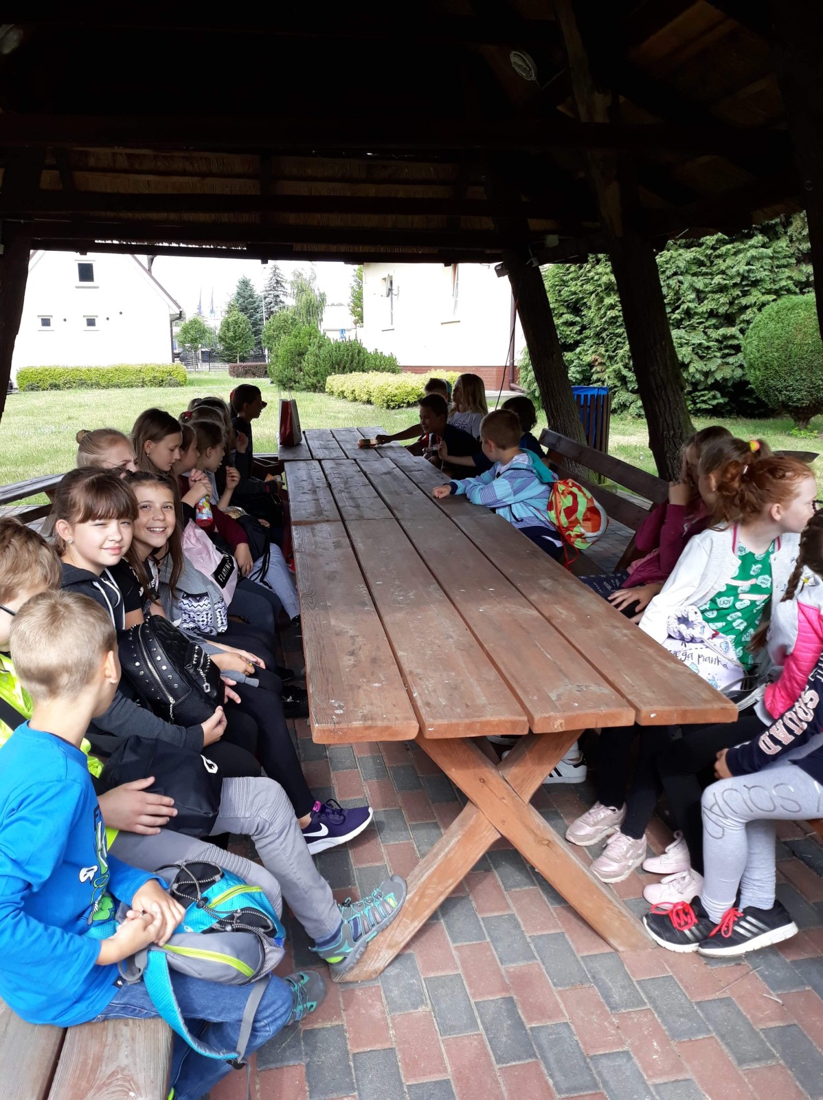 Po tych opowieściach udaliśmy się do drzewa z czereśniami, każdy z nas mógł skosztować po kilka czereśni zerwanych prosto z drzewa. Później udaliśmy się do izby edukacyjnej, gdzie podziwialiśmy zdjęcia otaczającej przyrody. Następnie wraz z panem leśniczym wyruszyliśmy na wyprawę do lasu, gdzie wysłuchaliśmy ciekawych informacji o roślinności leśnej. W tak miłej atmosferze dotarliśmy do naszego celu, gdzie czekało na nas ognisko z kiełbaskami. Byliśmy bardzo uradowani. Pieczone kiełbaski były naprawdę dobre. Wreszcie przyszedł czas na zabawy i gry , bawiliśmy się wspólnie znakomicie. W końcu przyszedł czas na powrót do szkoły. To był bardzo przyjemny dzień. Dziękujemy naszej pani i rodzicom za zorganizowanie tej wspaniałej wycieczki.